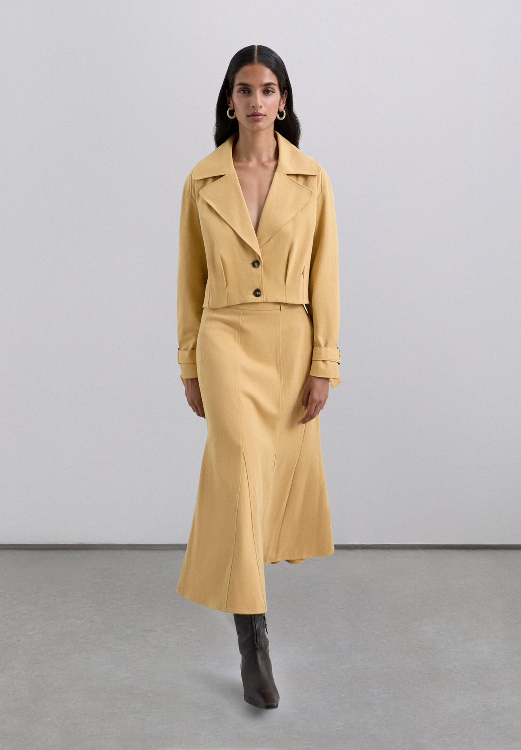 Cardigan curto com lapela em bico e fecho de botões à frente. Manga comprida com a extremidade fechada.