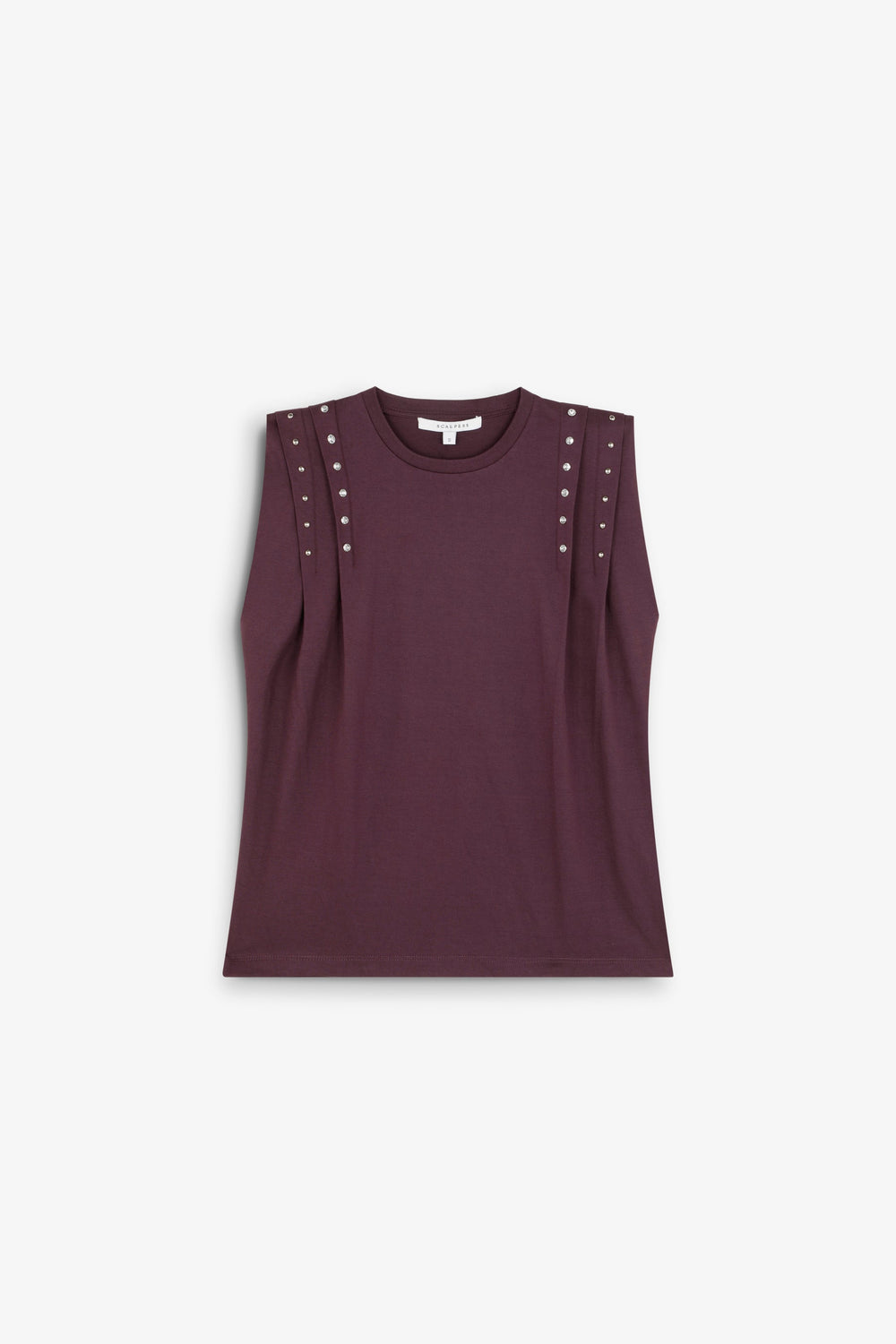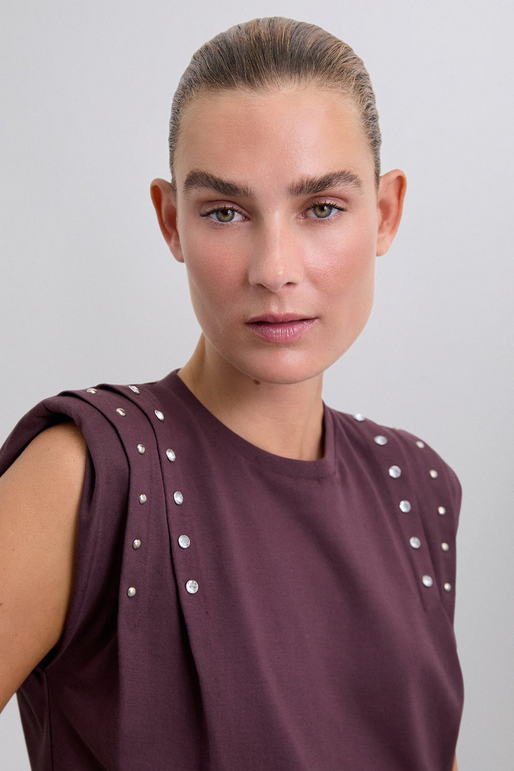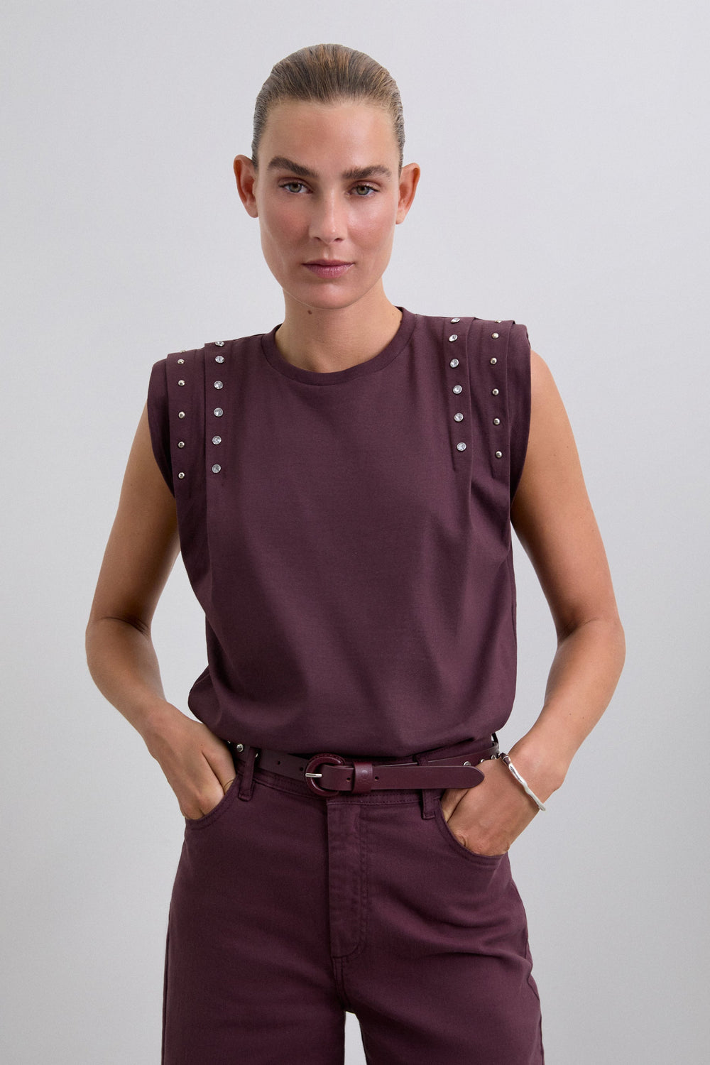 T-shirt confecionada em 100% algodão BCI. Regular fit. Decote redondo e manga cava. Pormenor de tachas nos ombros.