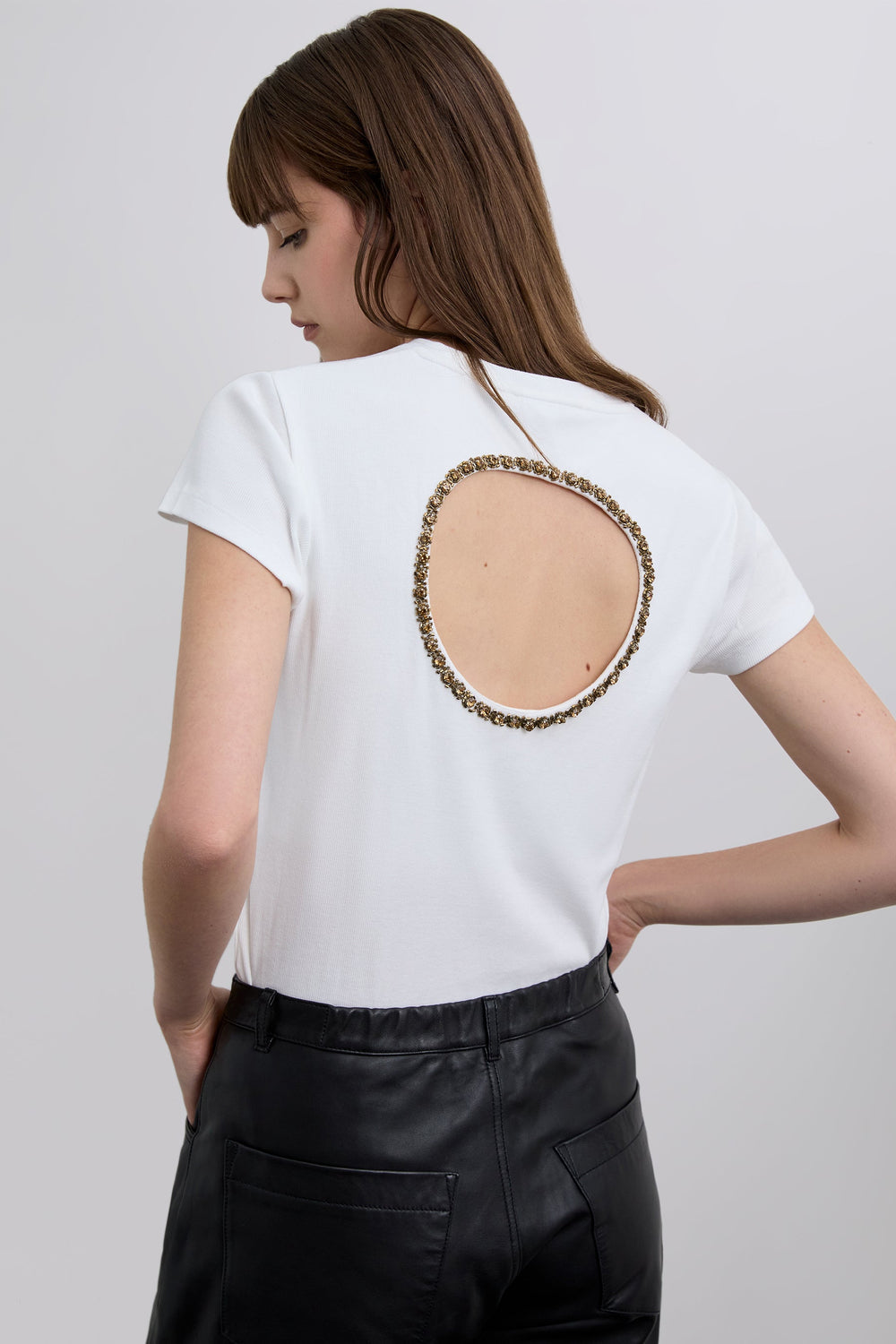 T-SHIRT COM ABERTURA DE PORMENOR DE PEDRARIA