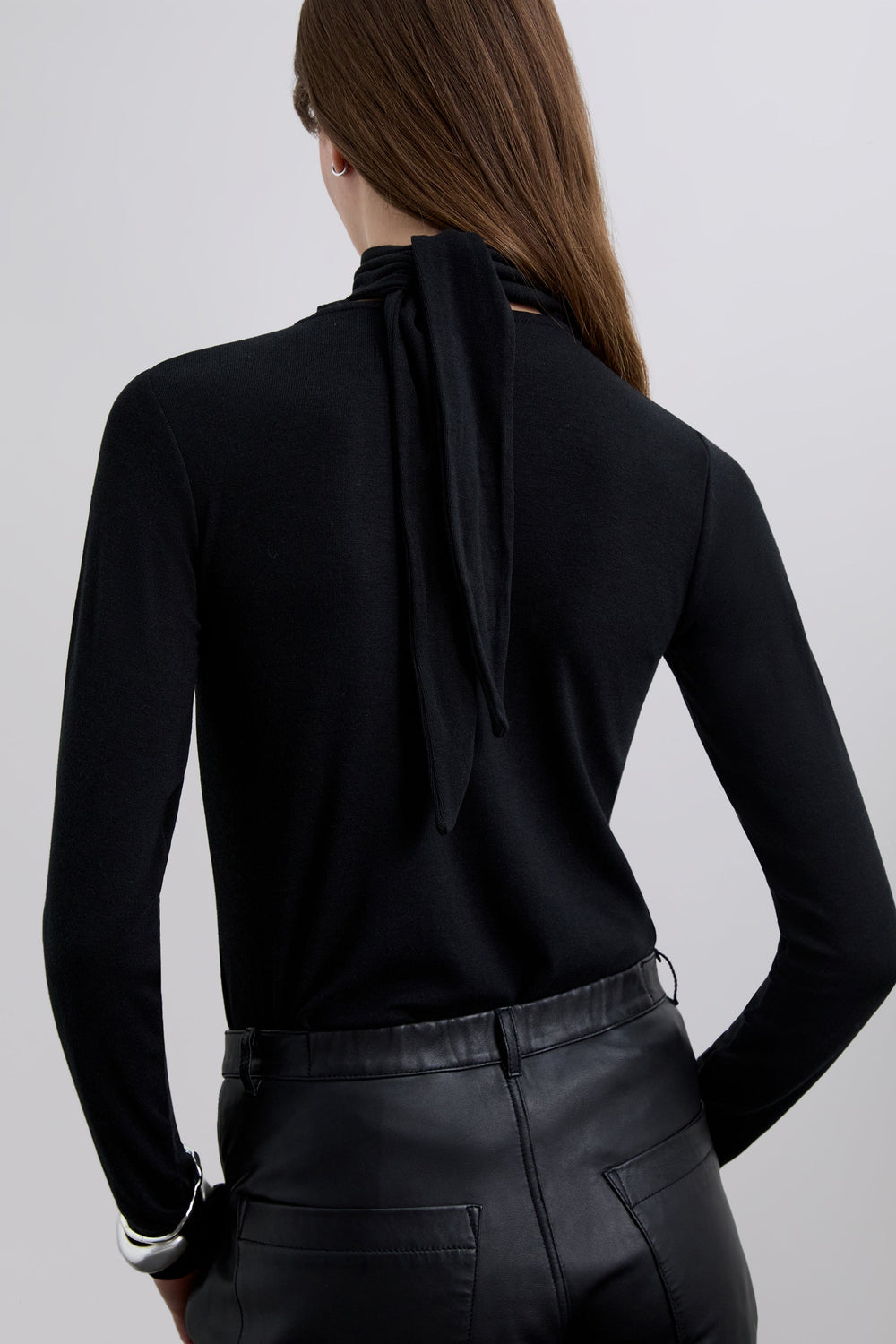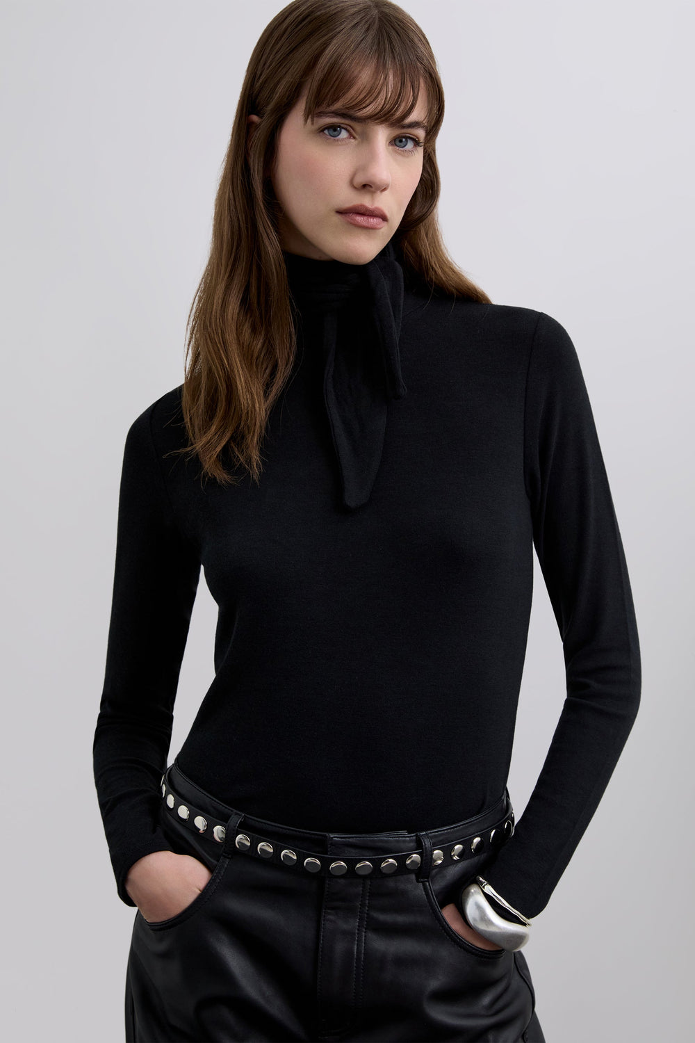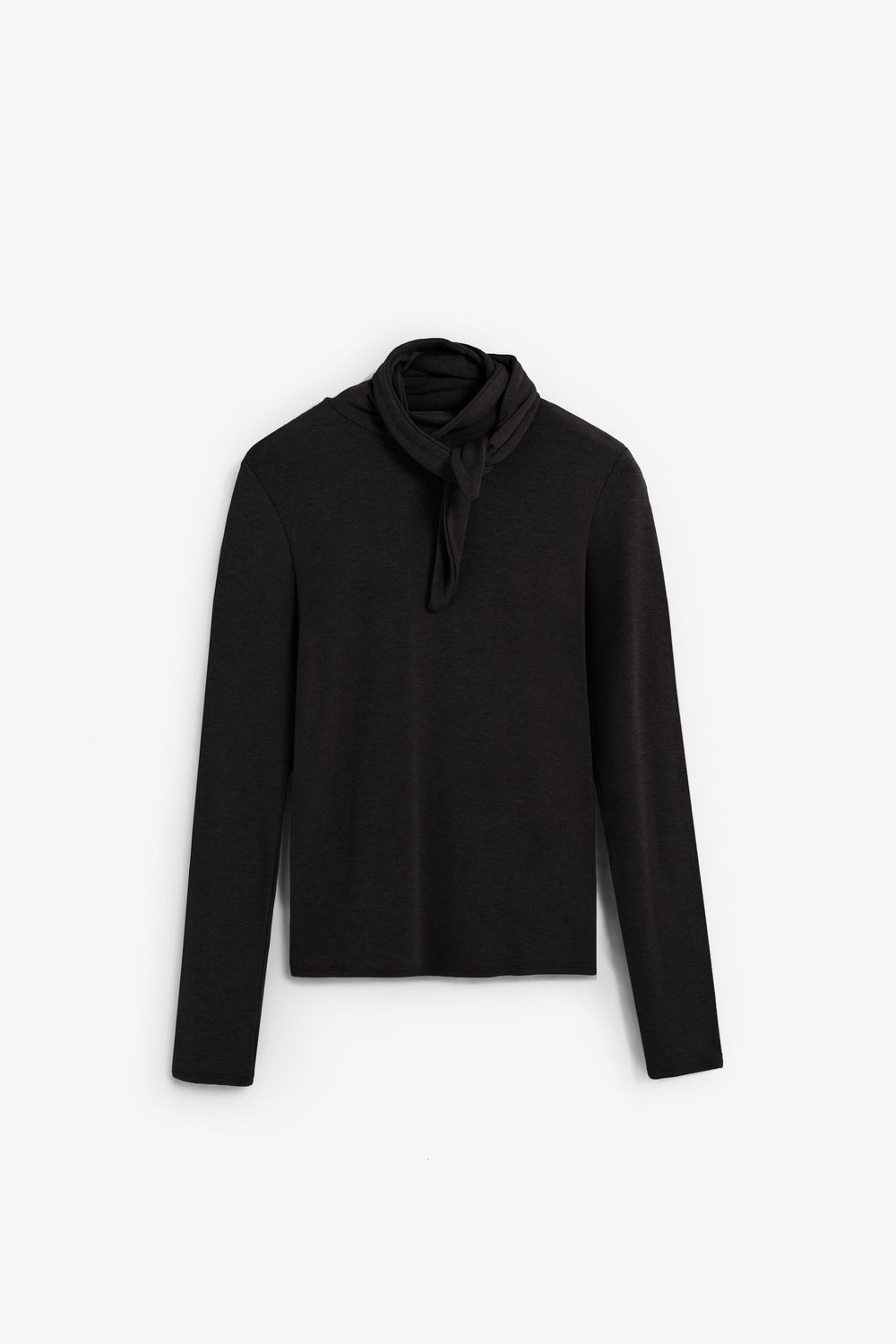 T-shirt de gola enrolada e pormenor de laço na gola estilo lenço de bolso ajustável. Manga comprida. Slim Fit.