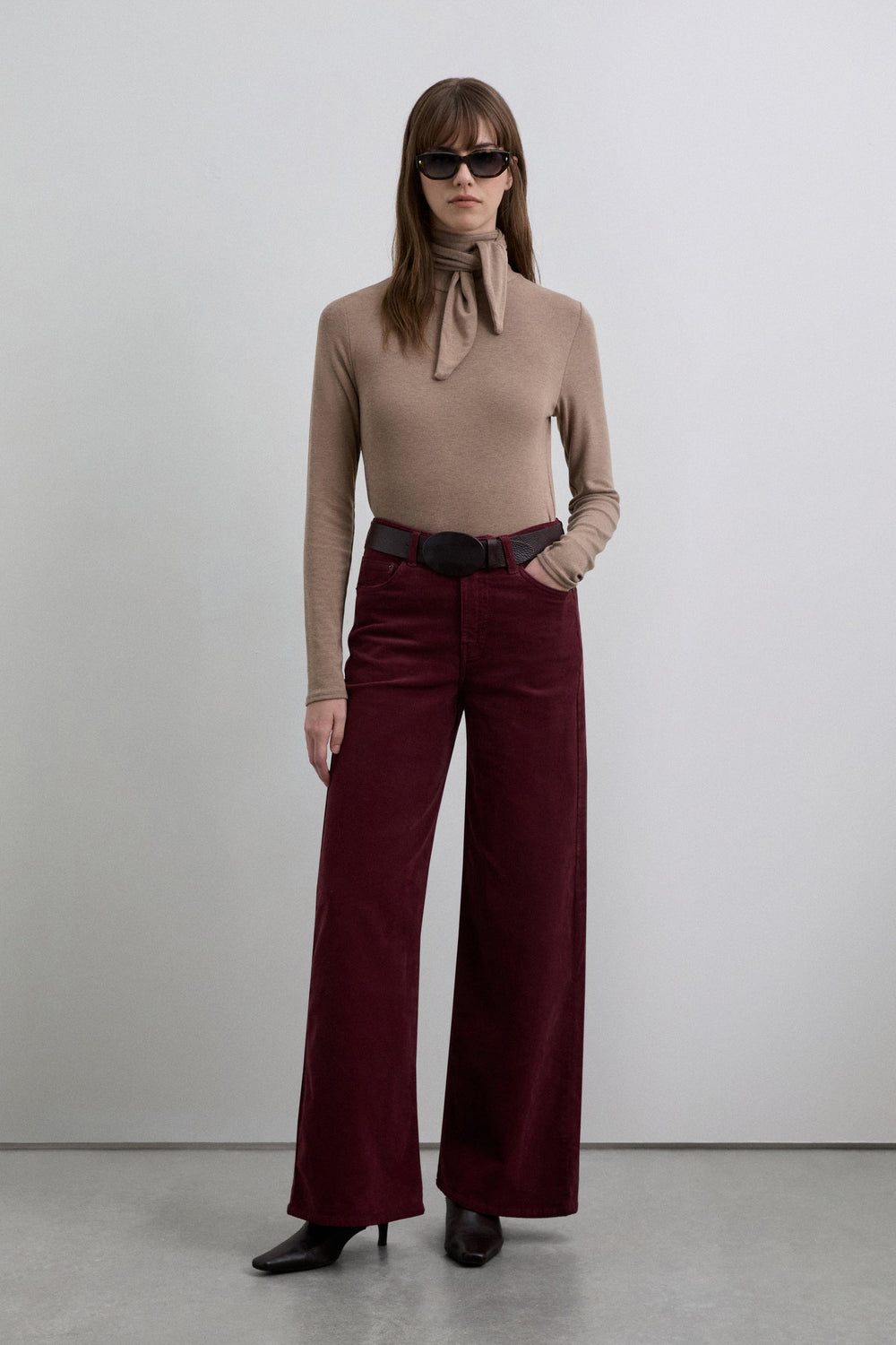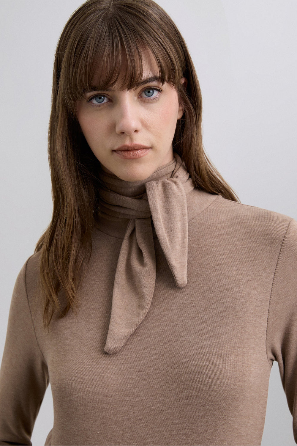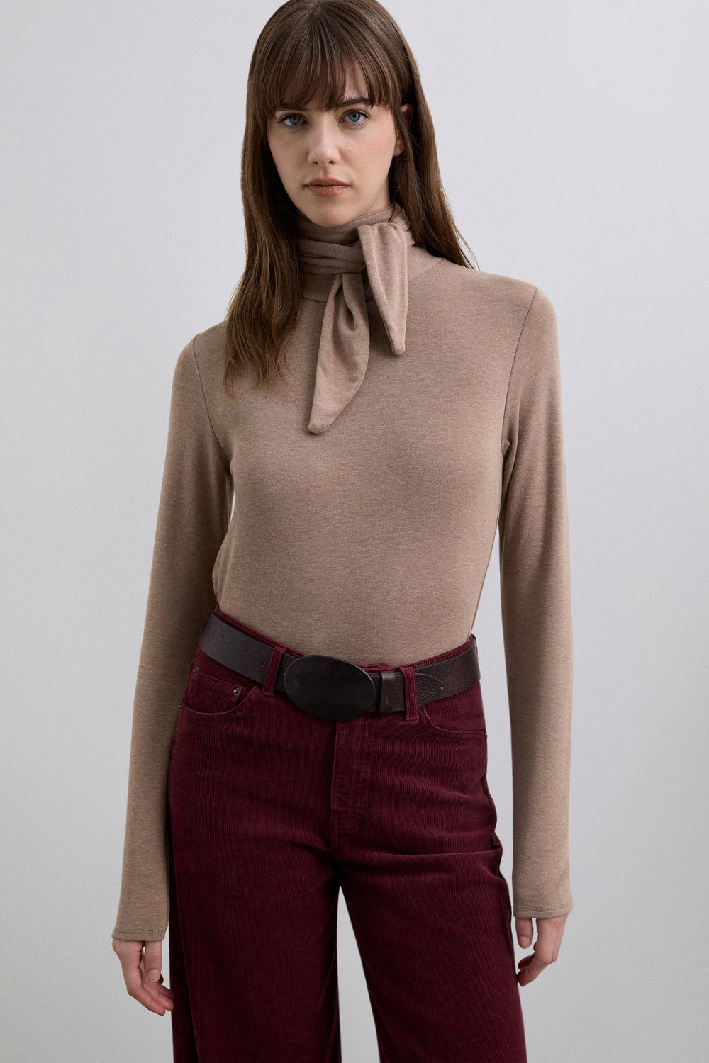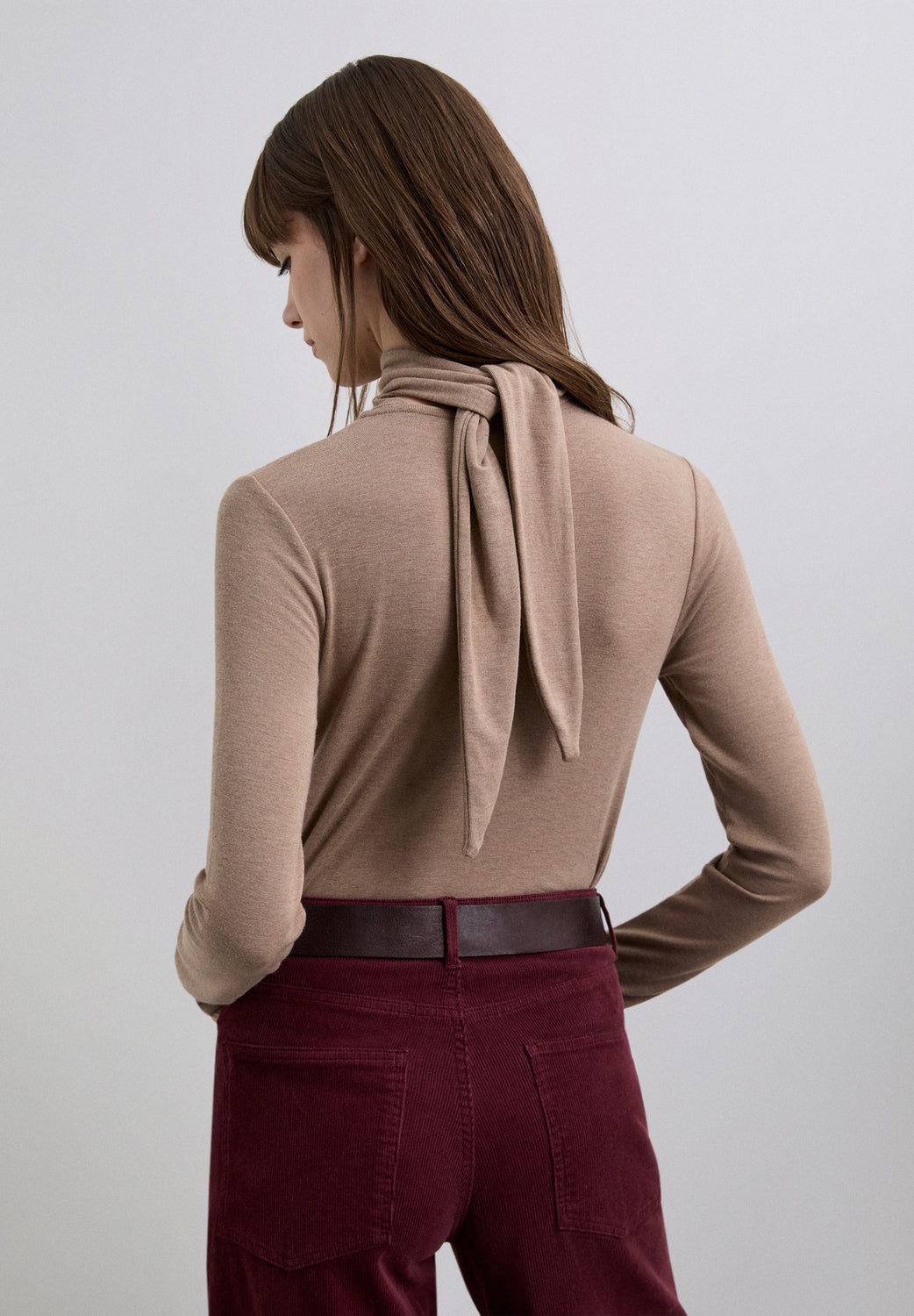 T-shirt de gola enrolada e pormenor de laço na gola estilo lenço de bolso ajustável. Manga comprida. Slim Fit.