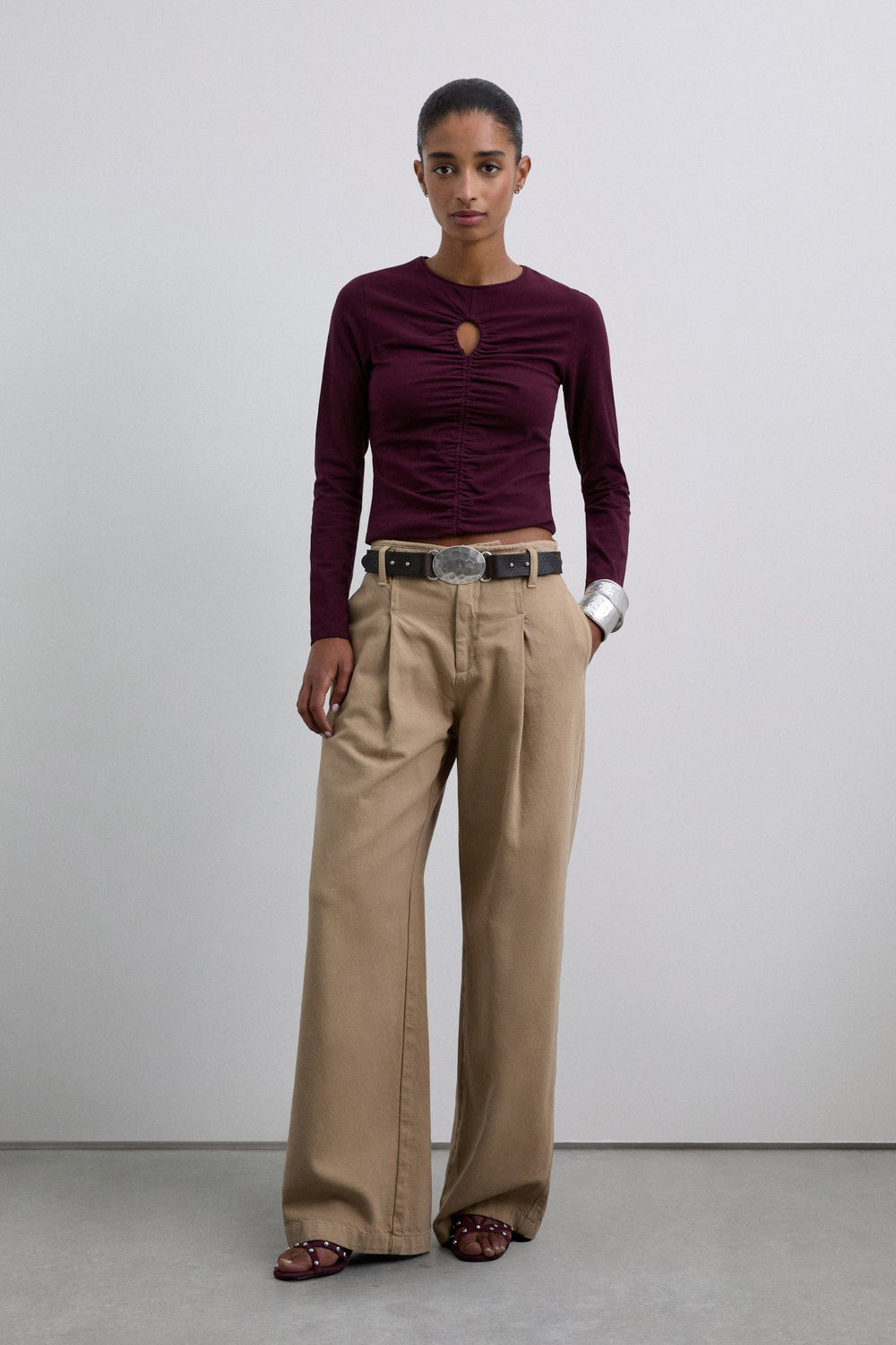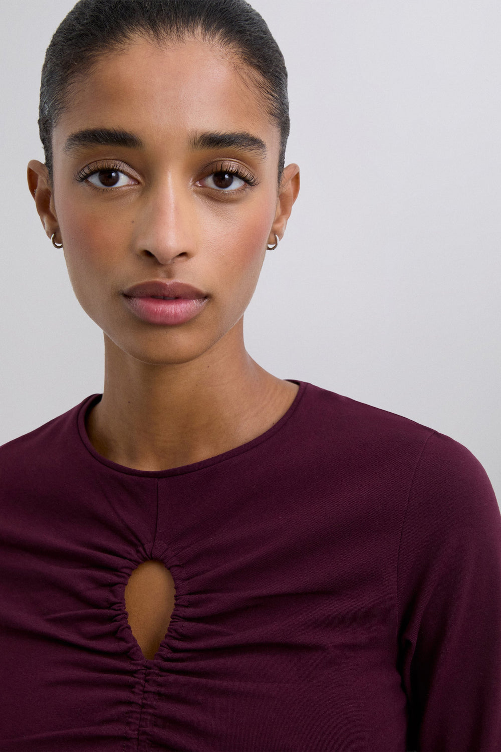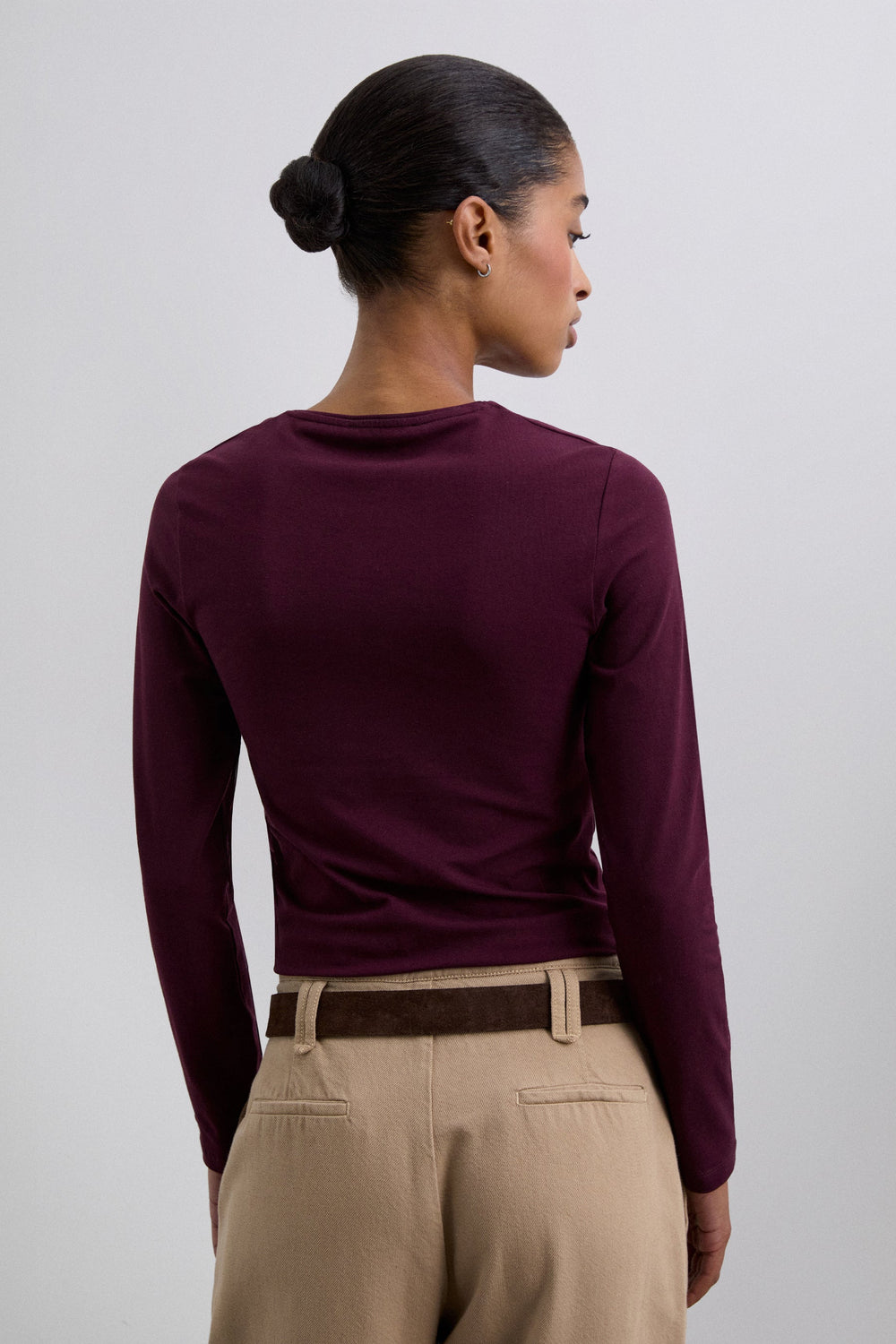 T-shirt confecionada em tecido ligeiramente elástico. Corte Slim Fit, decote redondo e manga comprida. Pormenor da abertura no decote e dobras à frente.