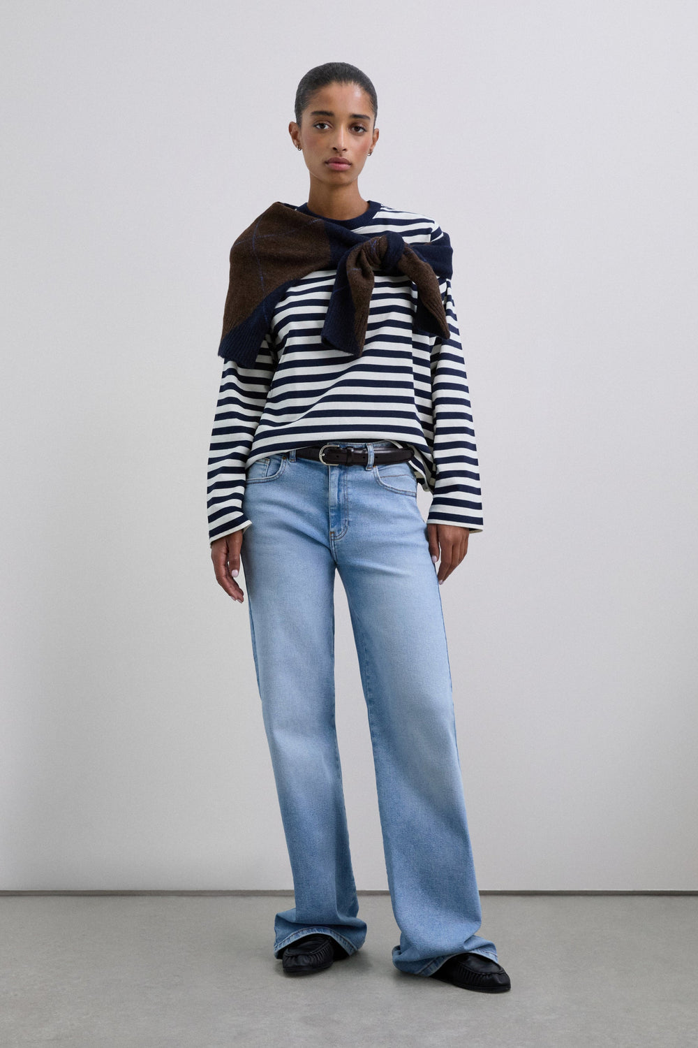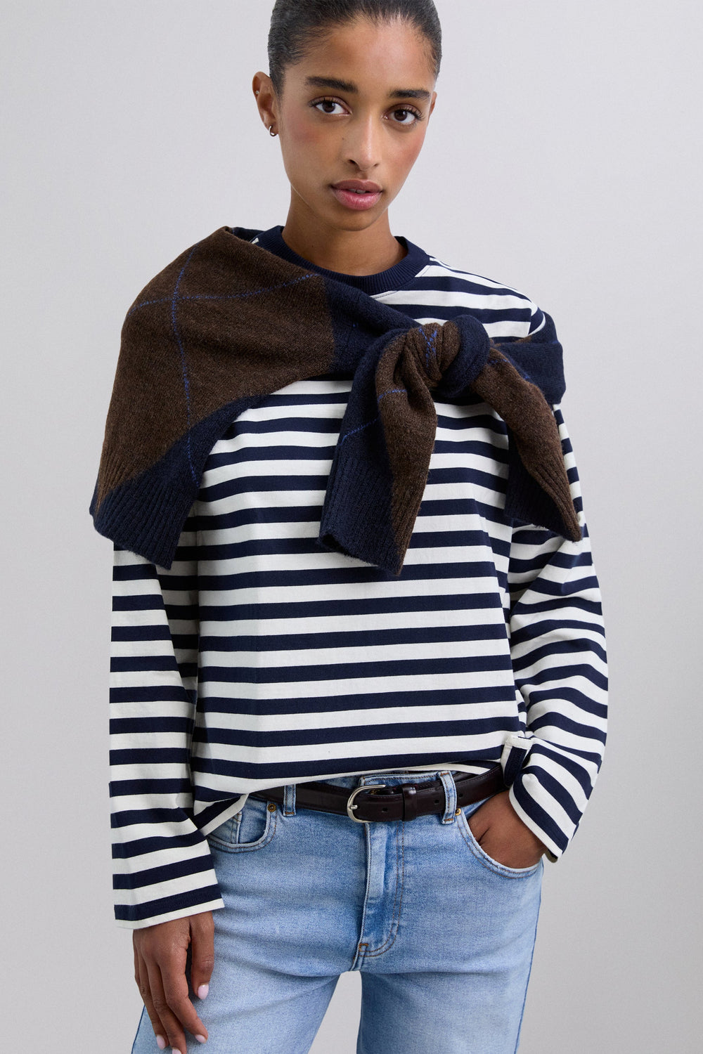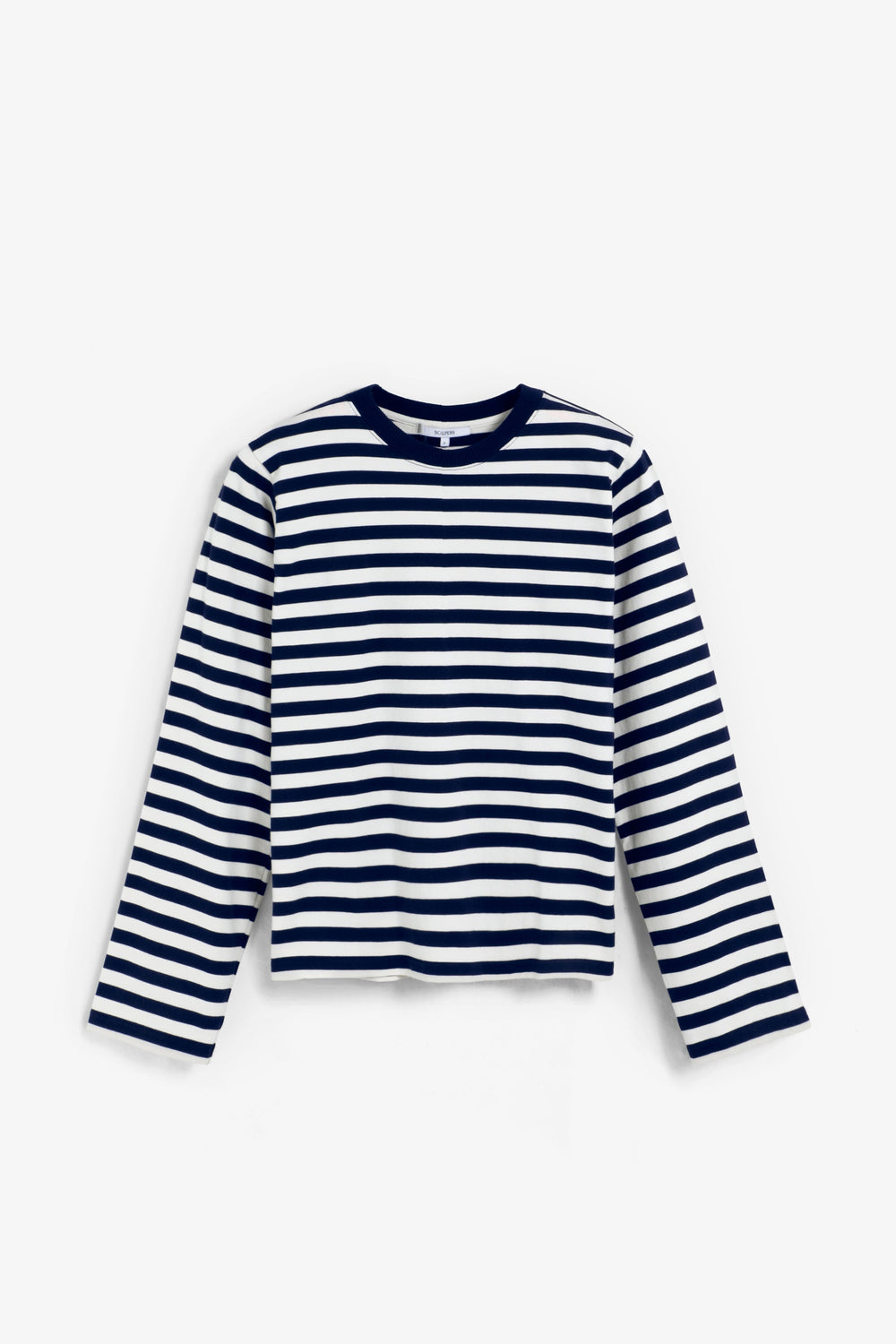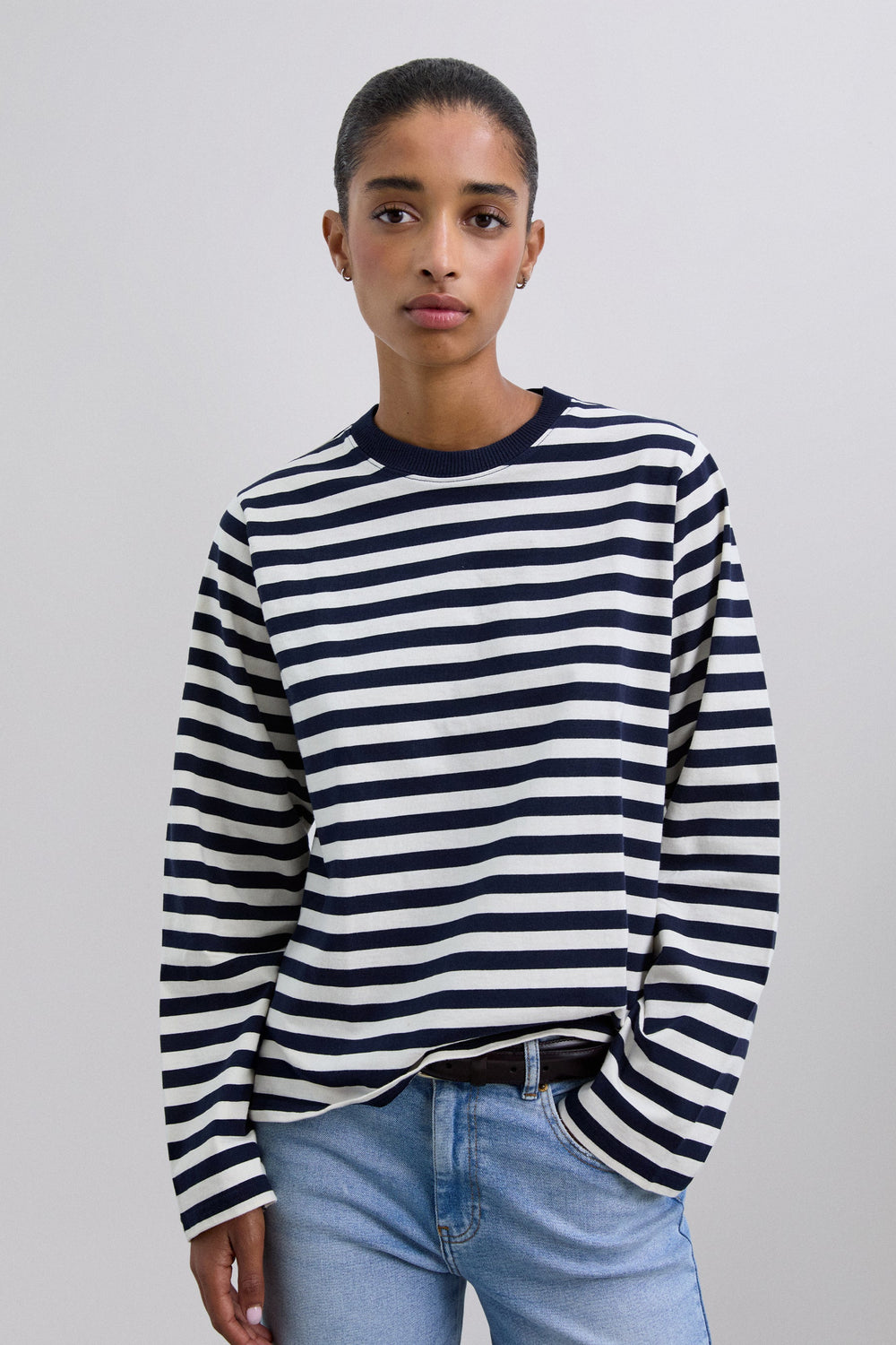 T-shirt às riscas confecionada em 100% algodão BCI. Manga comprida, corte regular. Pormenor da gola com linhas vivas.