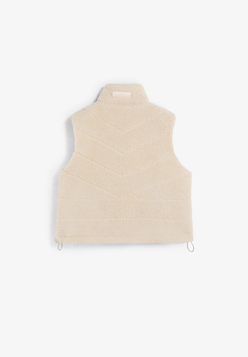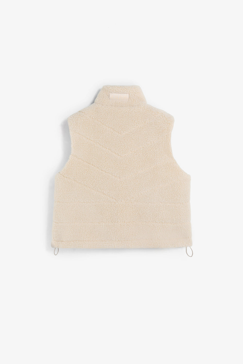 Colete de forro polar recortado. Corte justo. Dois bolsos à frente. Bainha ajustável com cordão. Gola alta. Fecho frontal com fecho de correr.