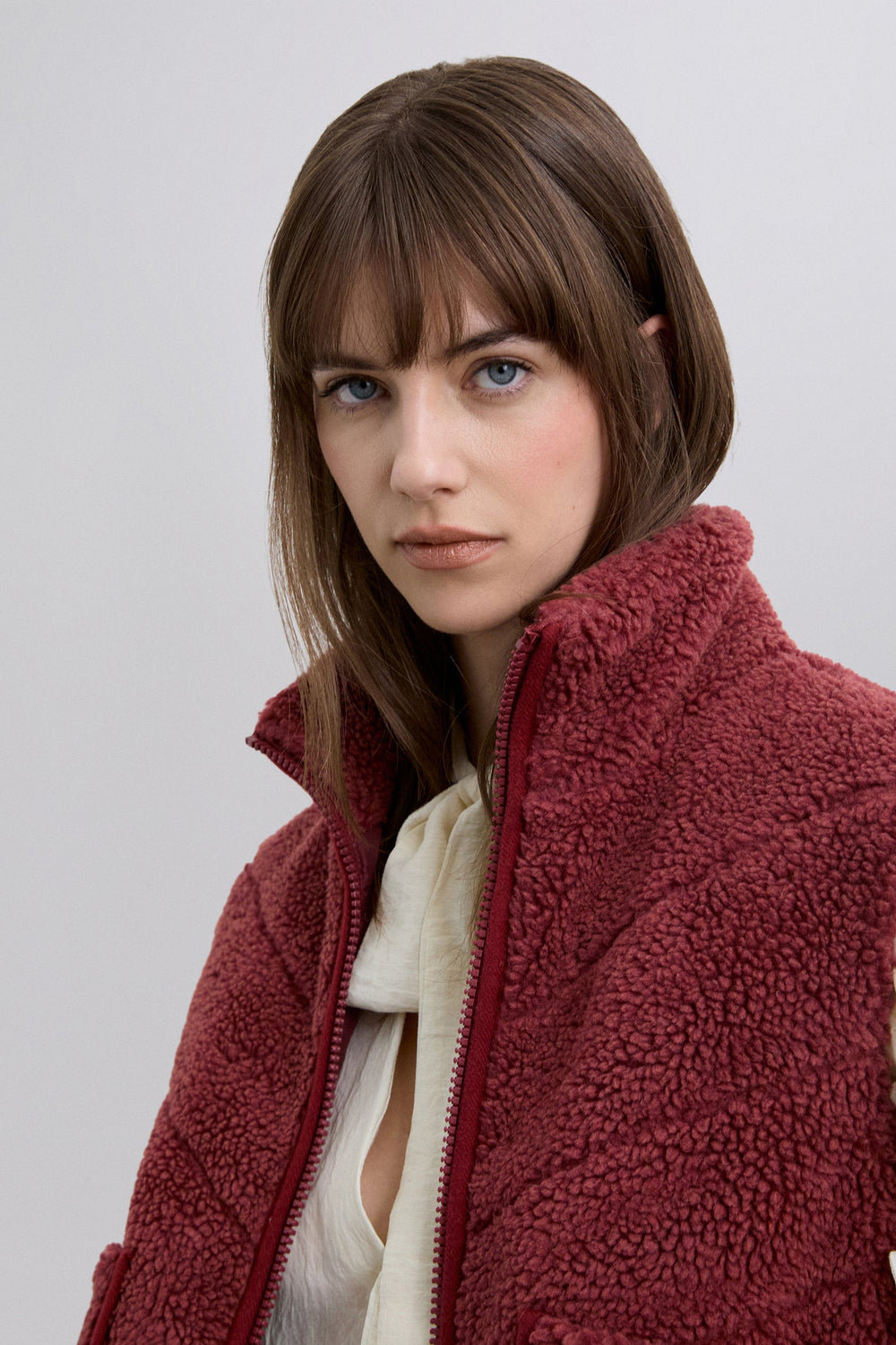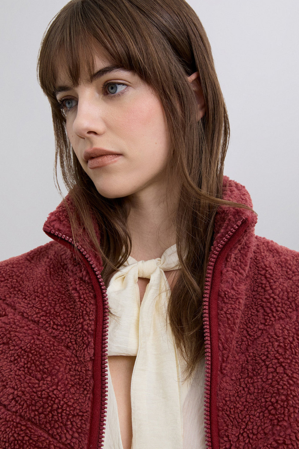Colete de forro polar recortado. Corte justo. Dois bolsos à frente. Bainha ajustável com cordão. Gola alta. Fecho frontal com fecho de correr.