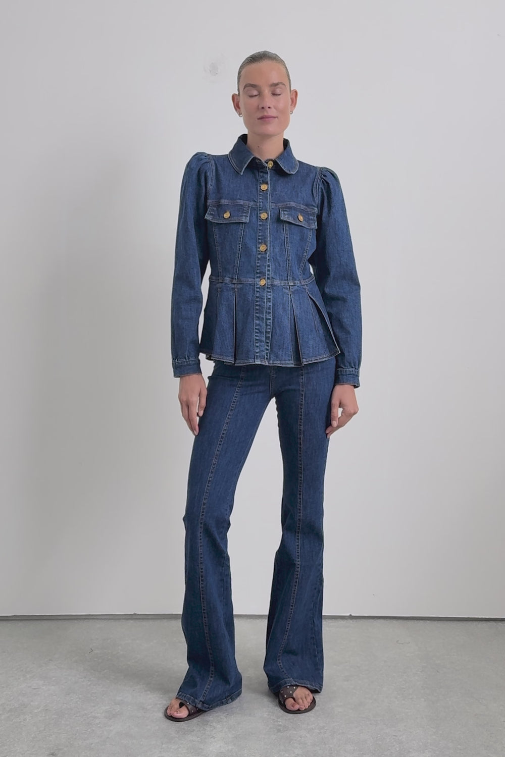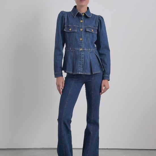 Camisa denim confecionada em algodão ligeiramente elástico. Slim fit, fecho com botões e manga abalonada comprida terminada em botões. Pormenor de pregas na bainha e franzidos nos ombros.