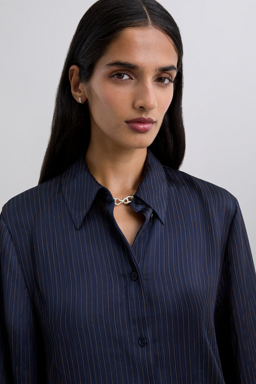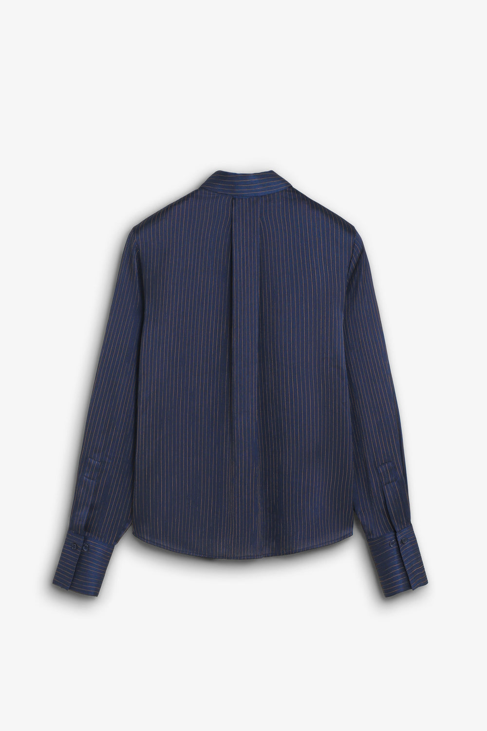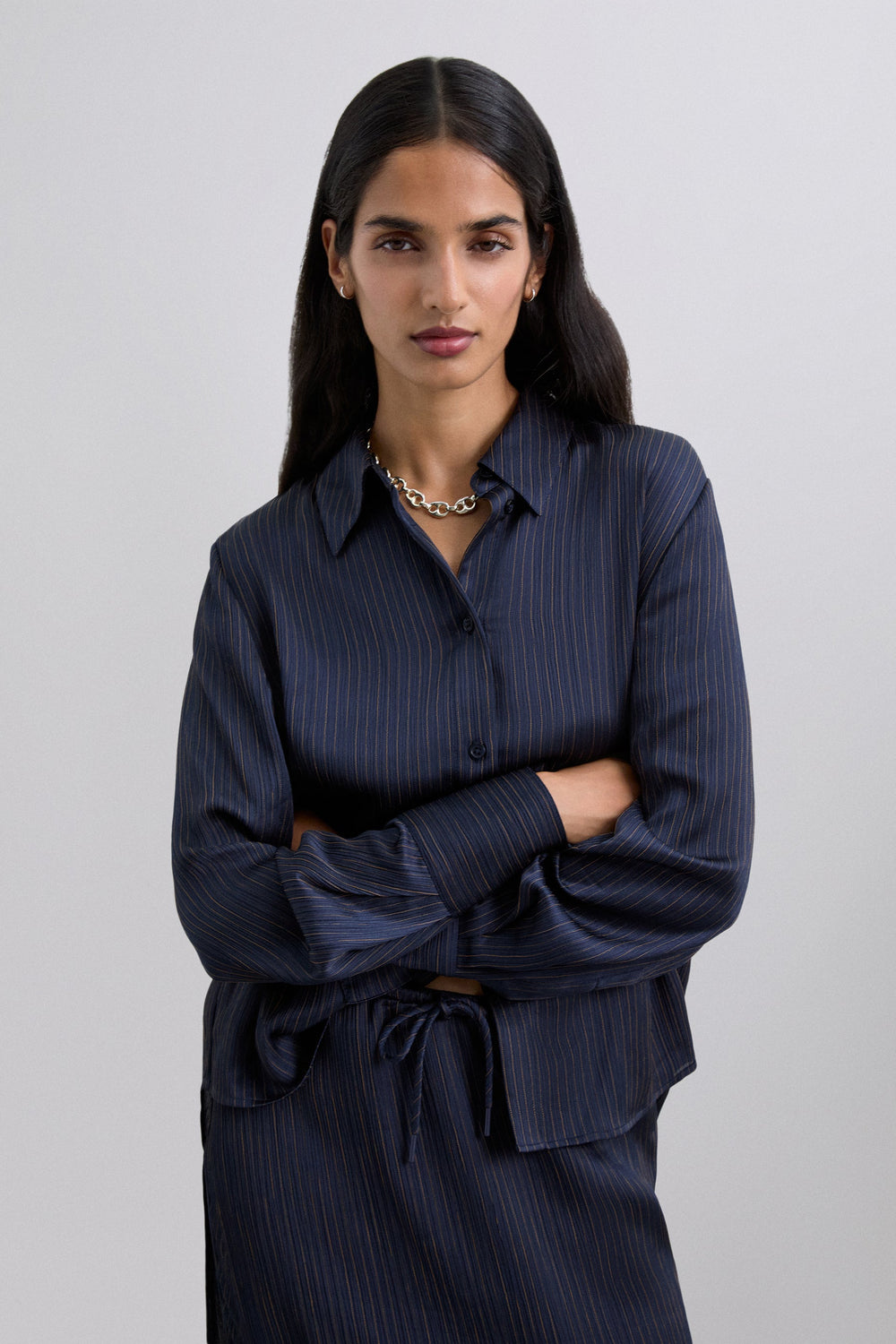 Camisa confecionada em tecido fluido com padrão de risca diplomática. Colarinho clássico. Fecho de botões e manga comprida com fecho de botão nos punhos.