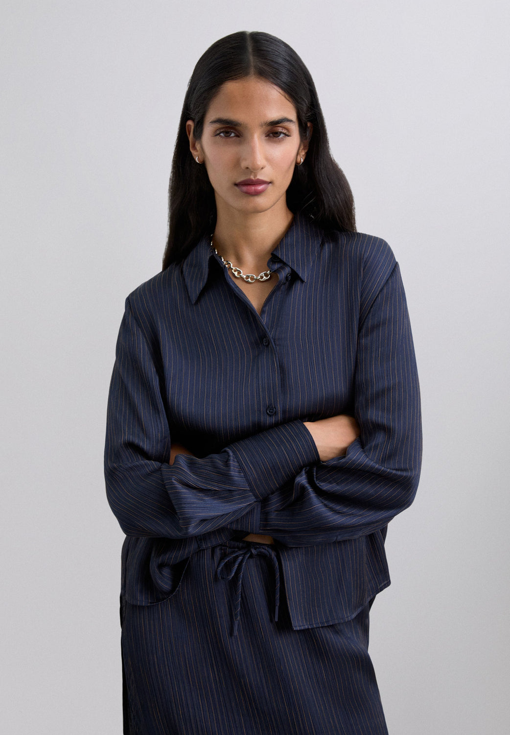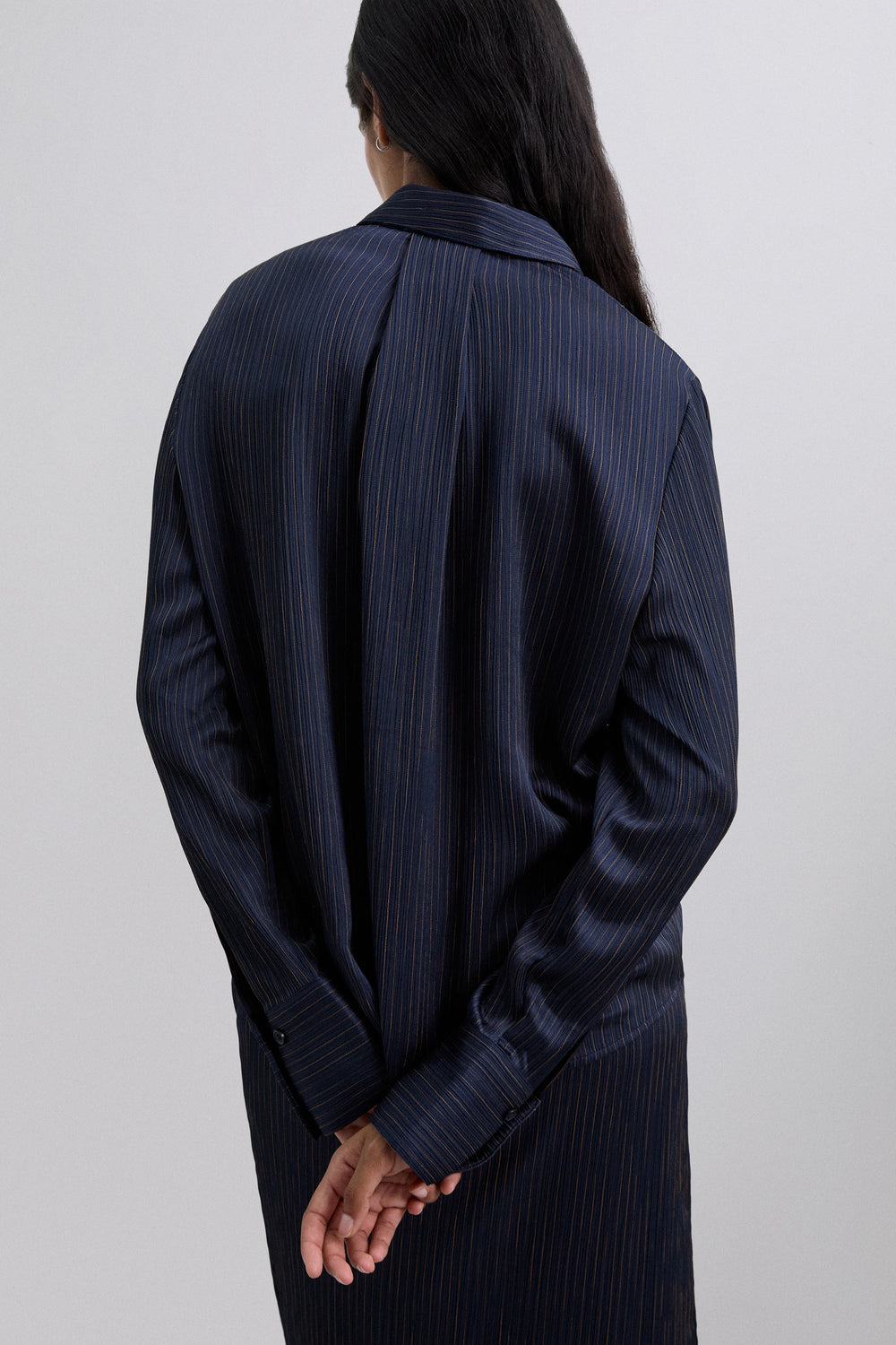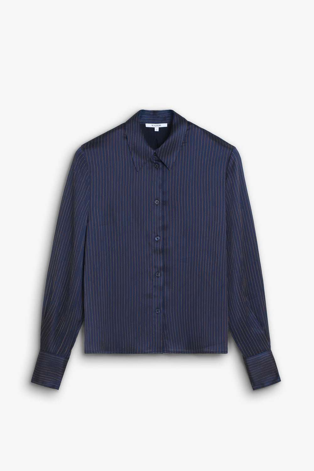 Camisa confecionada em tecido fluido com padrão de risca diplomática. Colarinho clássico. Fecho de botões e manga comprida com fecho de botão nos punhos.