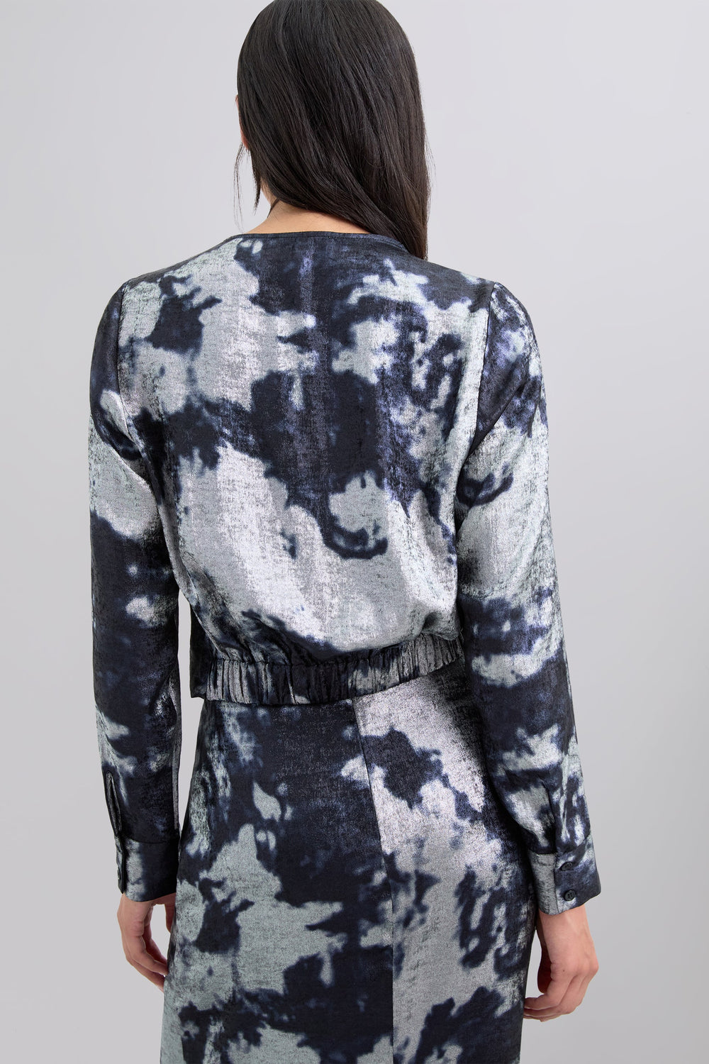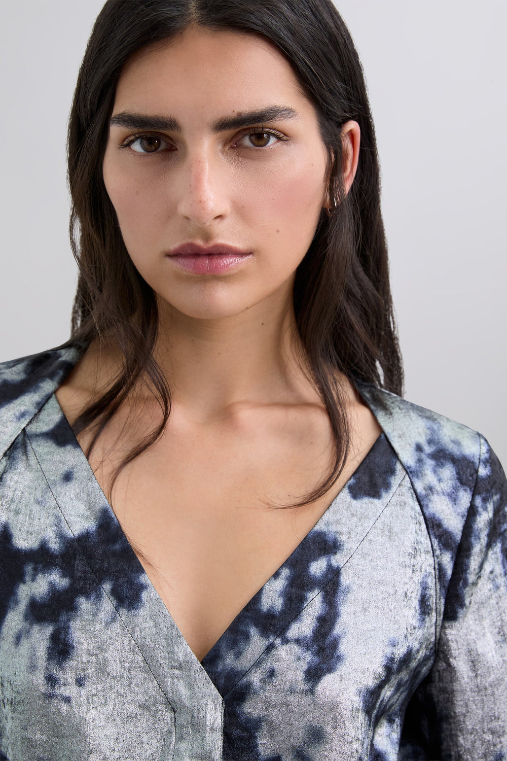 Blusa confecionada em tecido fluido com estampado tie-dye e pormenores metalizados. Corte slim fit. Decote em V. Manga comprida. Ligeiramente cropped.