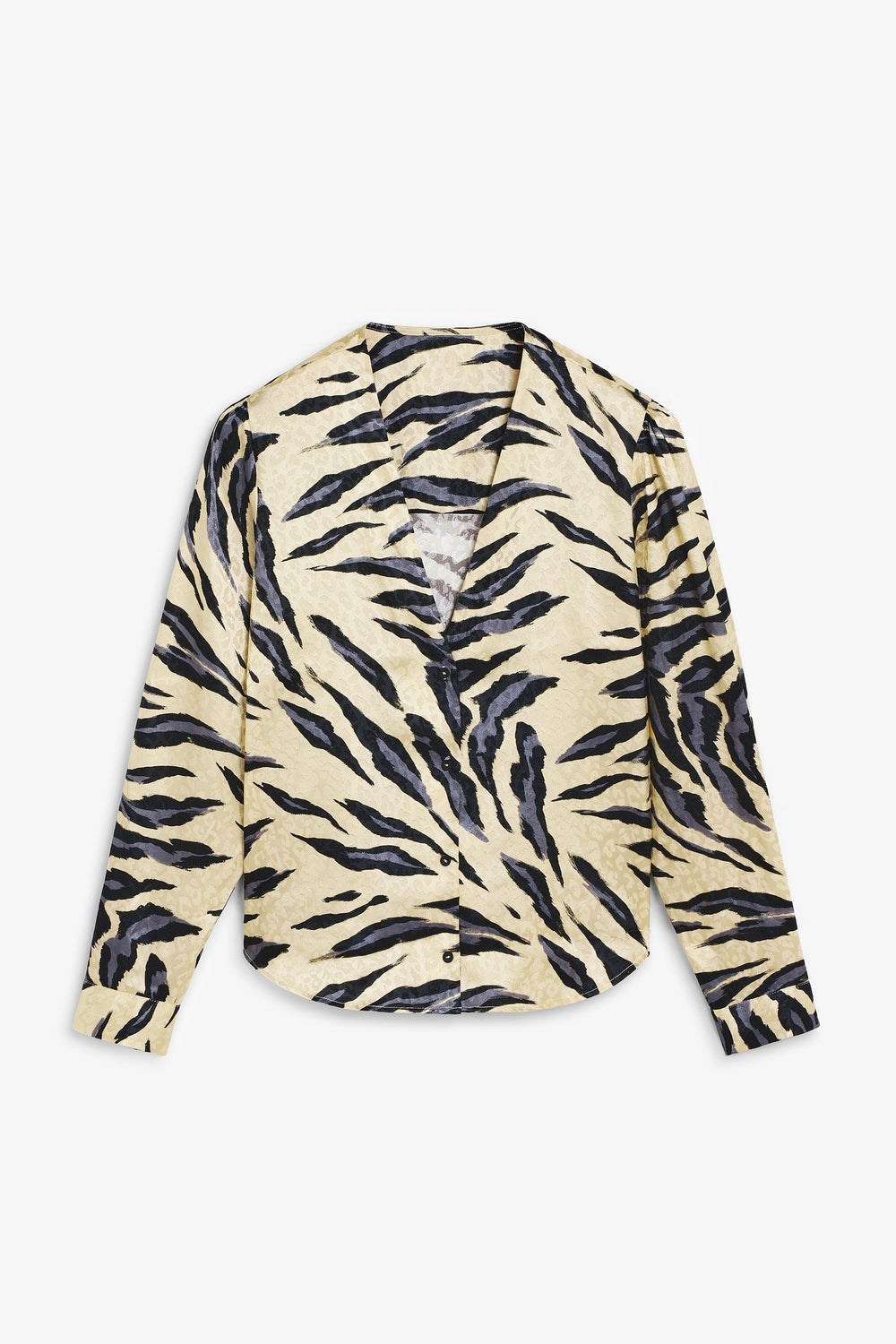 Blusa em tecido de cetim fluido com estampado animal. Ajuste regular, decote em V e fecho de botões. Manga comprida ligeiramente abalonada terminada em punho.