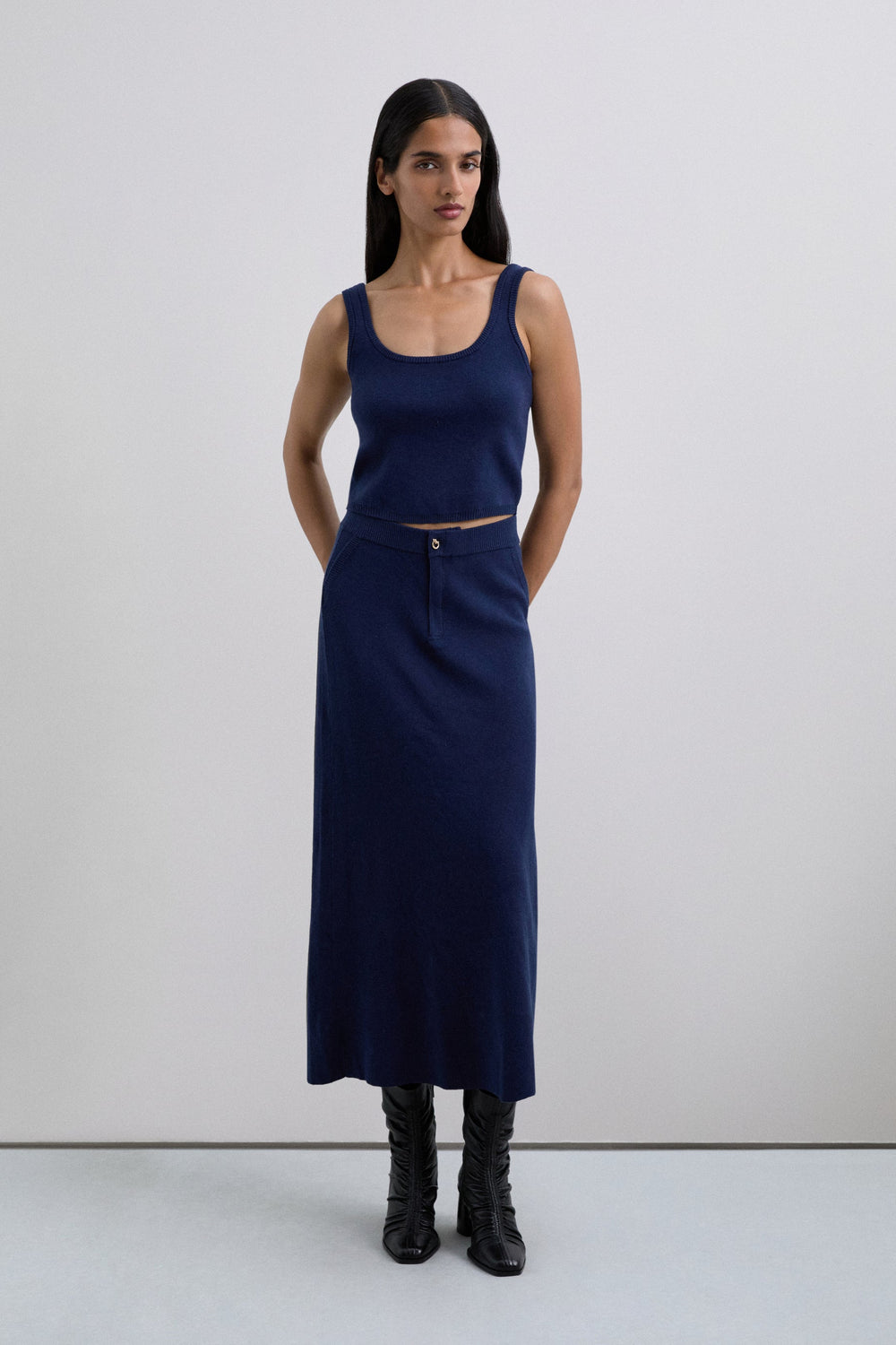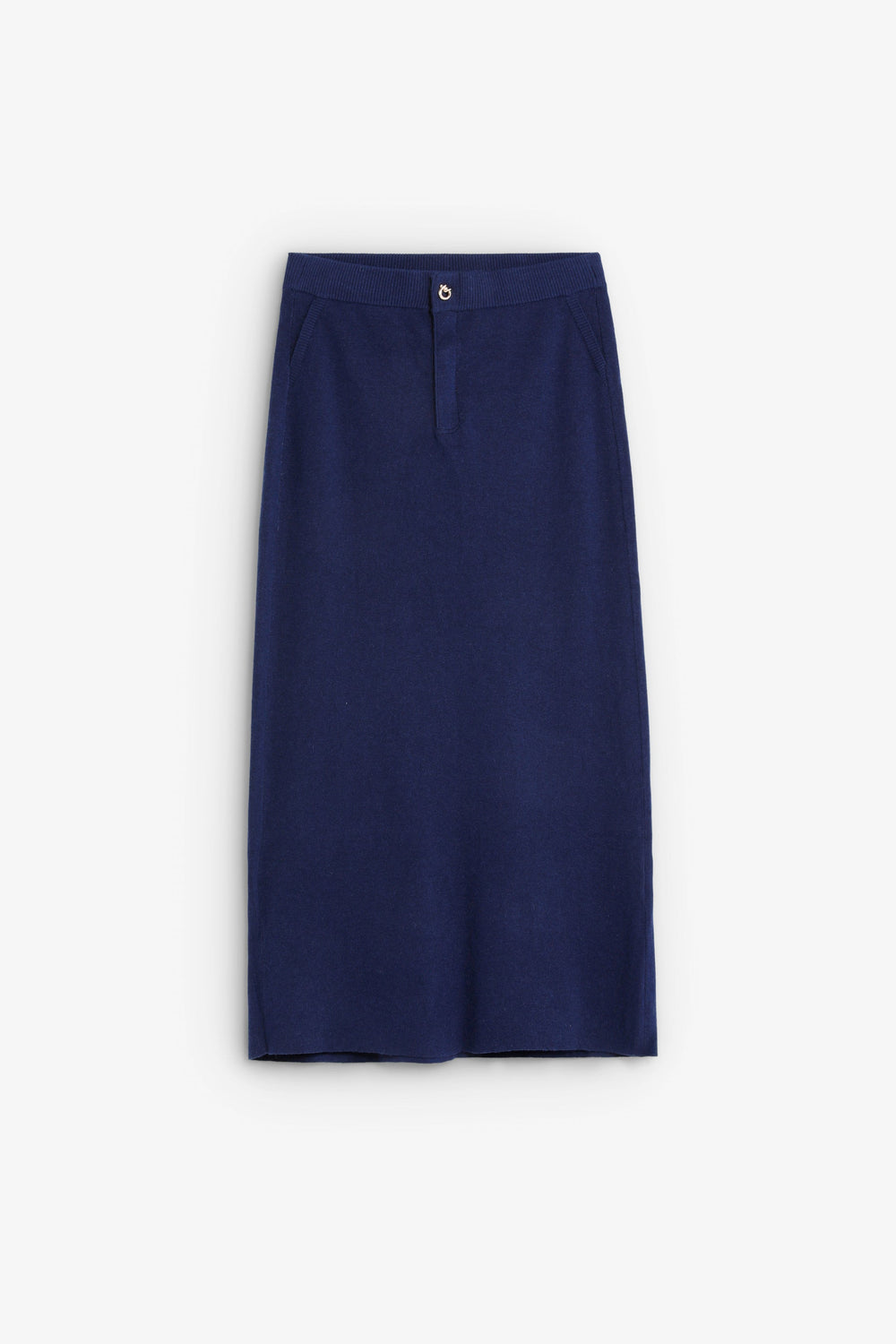 Saia midi de malha confecionada em mistura de algodão. Corte midi. Fecho com botão. Cintura e punhos acabados em nervuras.