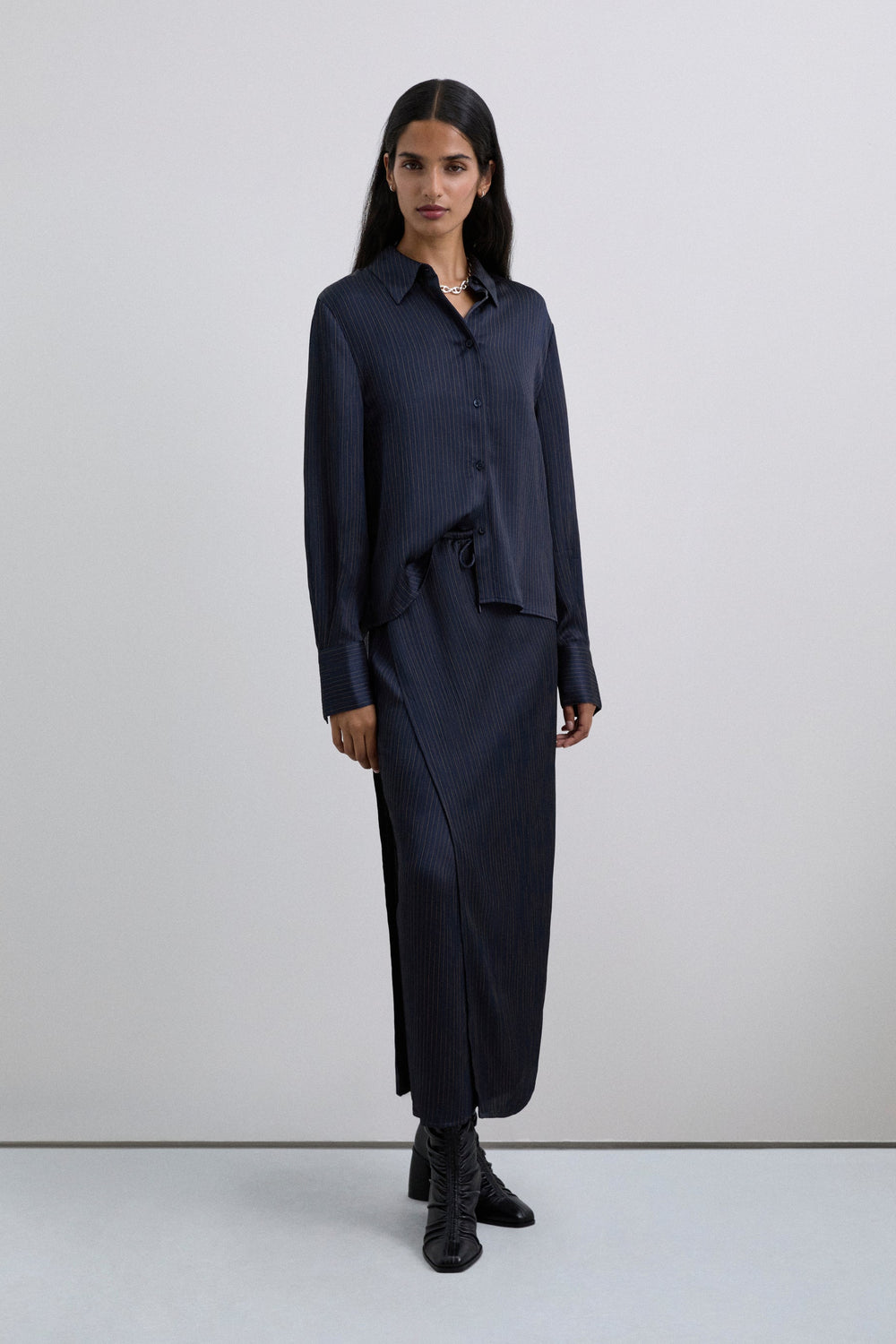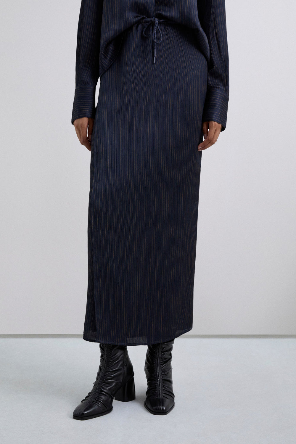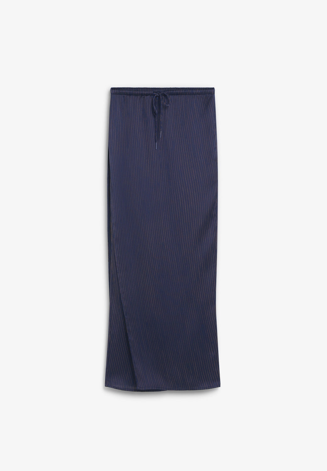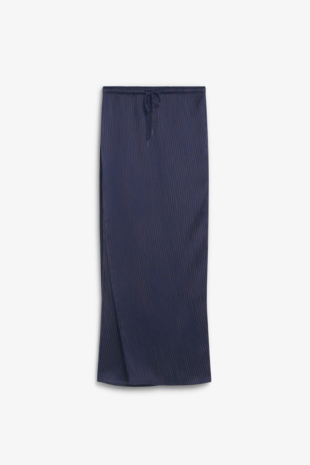 Saia comprida às riscas. Cintura elástica com cordão ajustável. Corte direito com fenda lateral