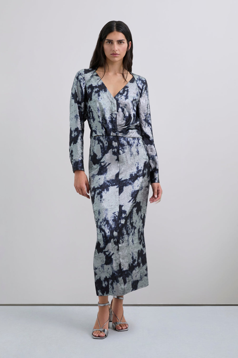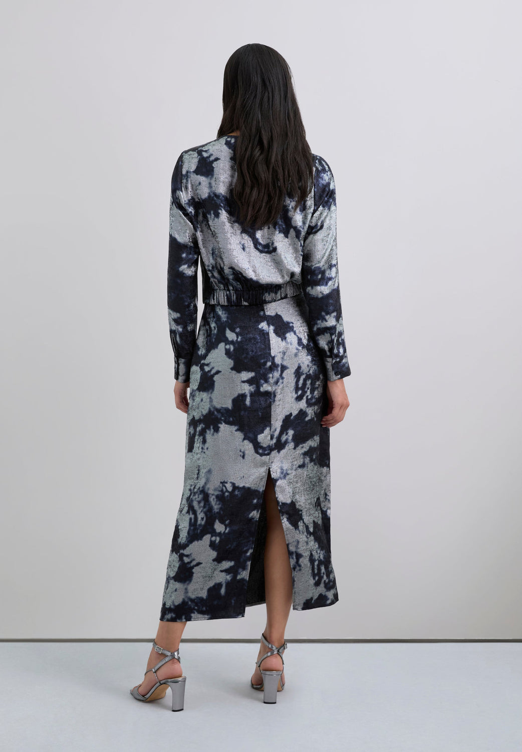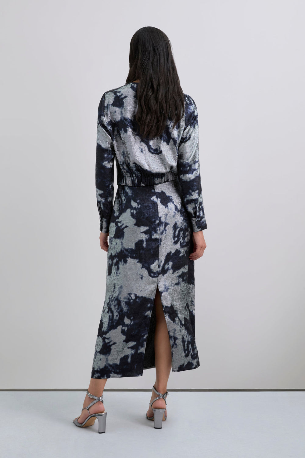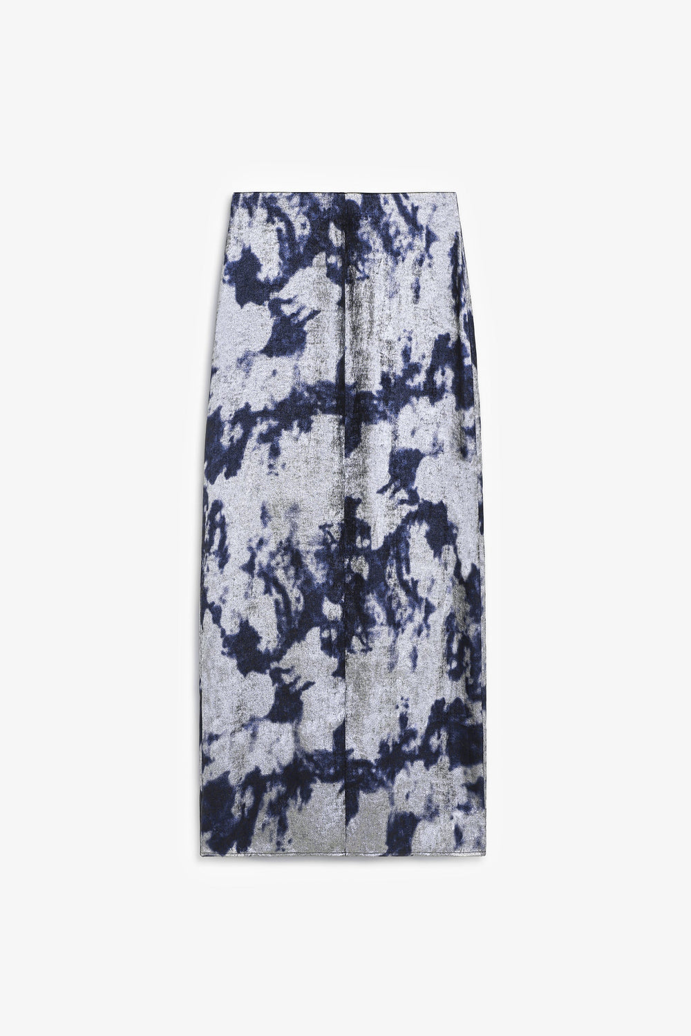 Saia confecionada em tecido fluido com padrão tie-dye com pormenores metalizados. Corte slim fit. Midi. Abertura traseira. Fecho com zip lateral oculto.