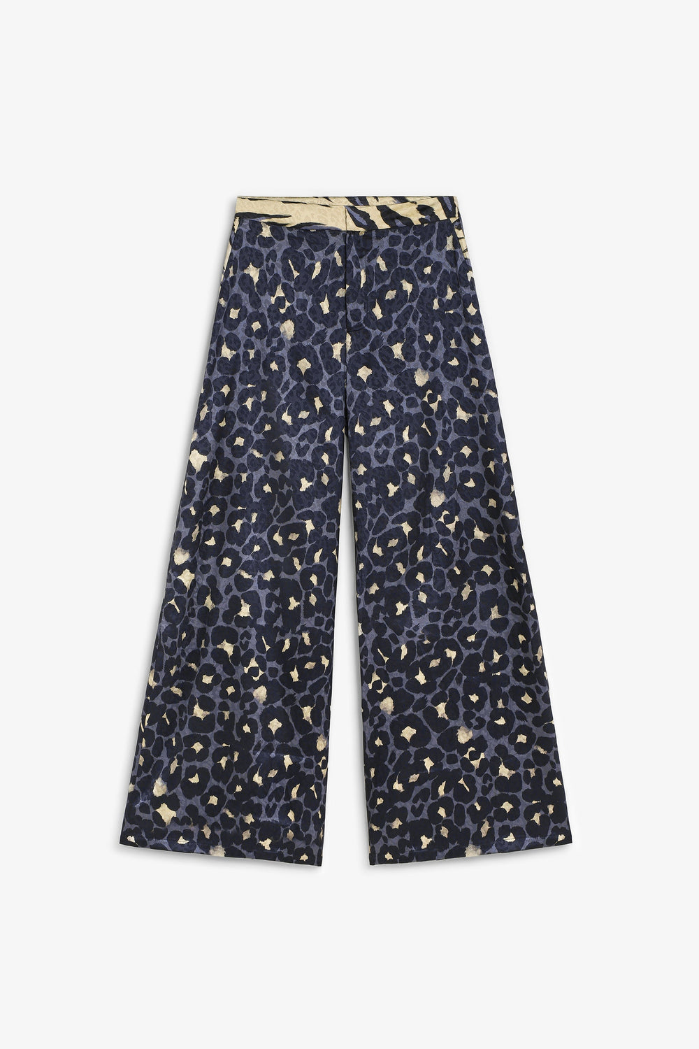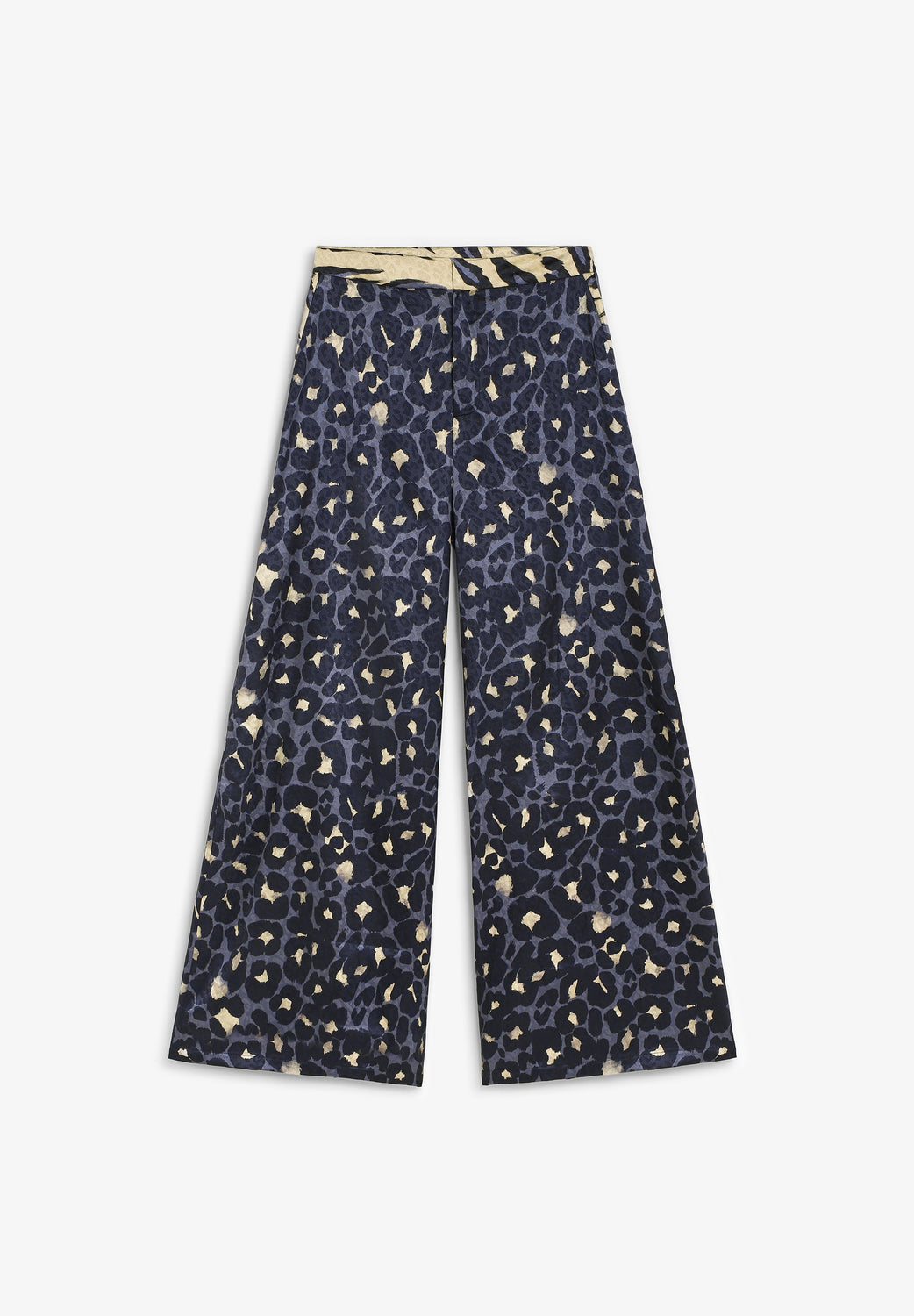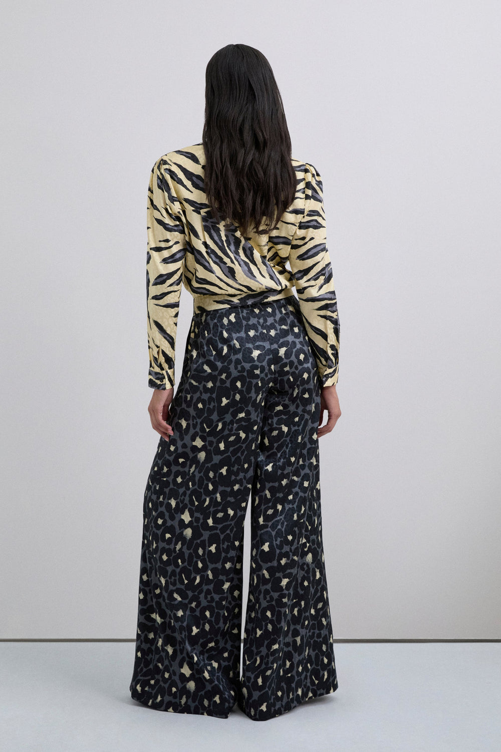 Calças fluidas. Fecho de correr oculto por uma aba com colchete e botão. Cintura elástica. Dois bolsos laterais. Estampado animal padrão. Tecido fluido com acabamento acetinado.