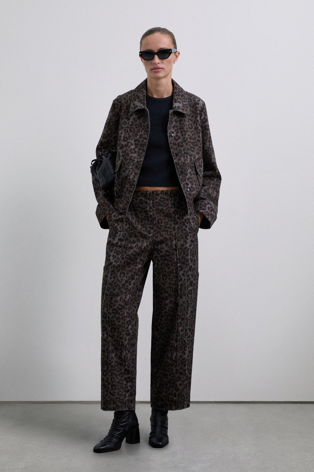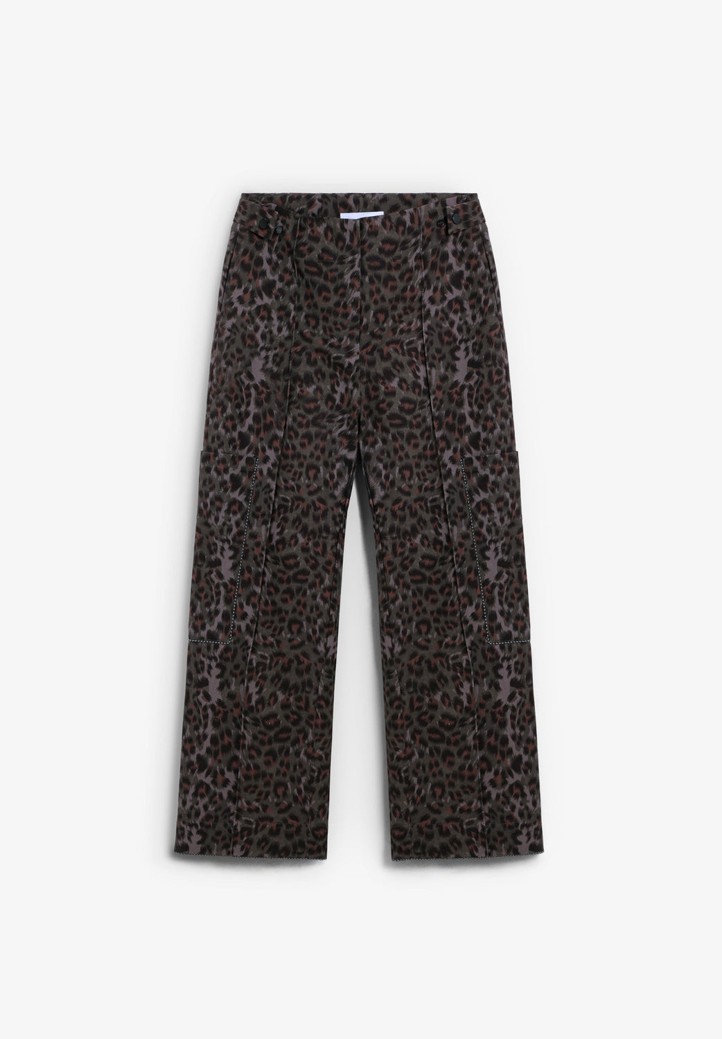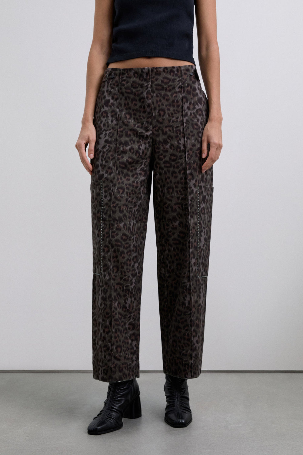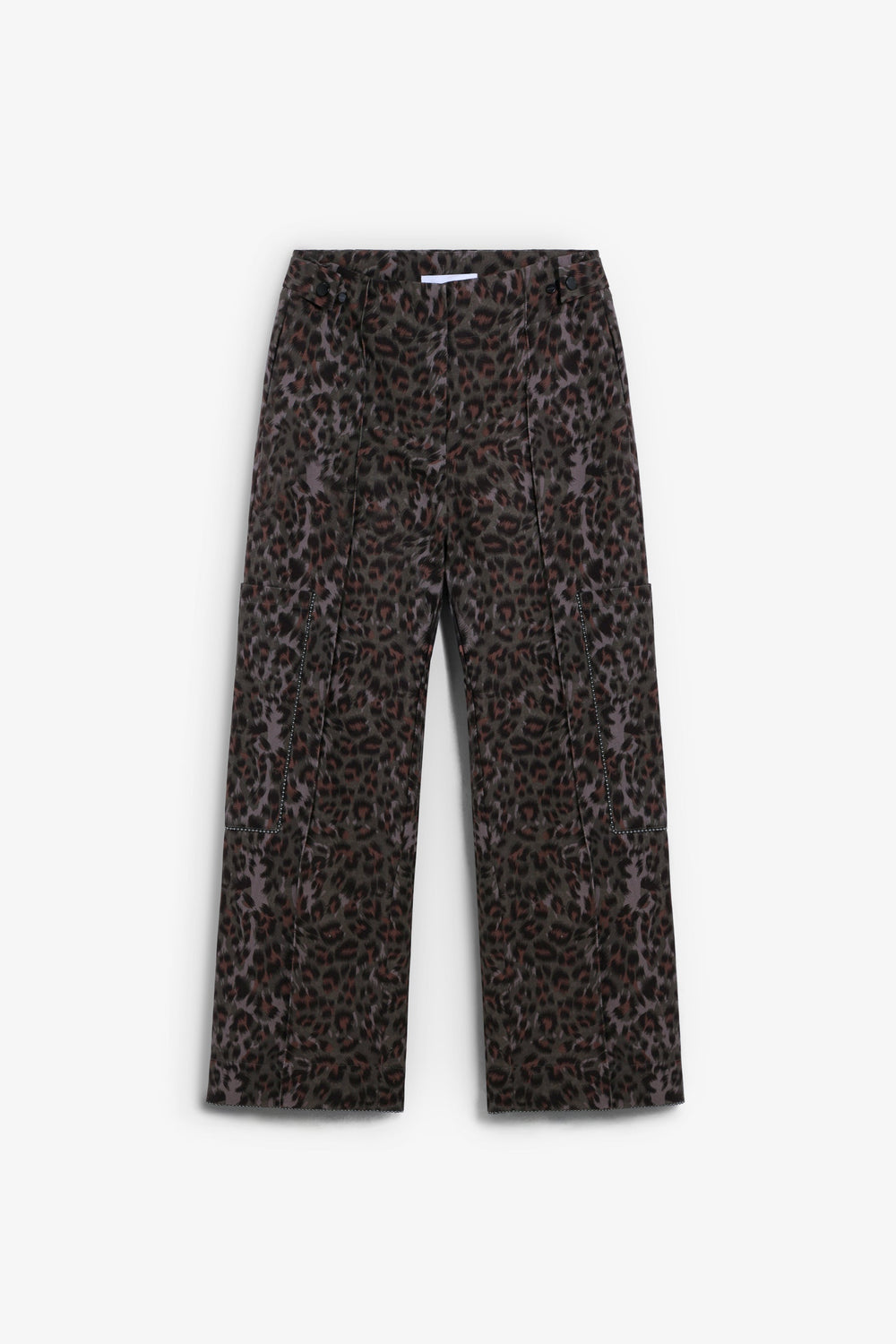 Calças com padrão de estampado animal. Fecho de correr à frente. Bolsos laterais estilo cargo. Pormenores nas costuras principais. Botões ajustáveis na anca.
