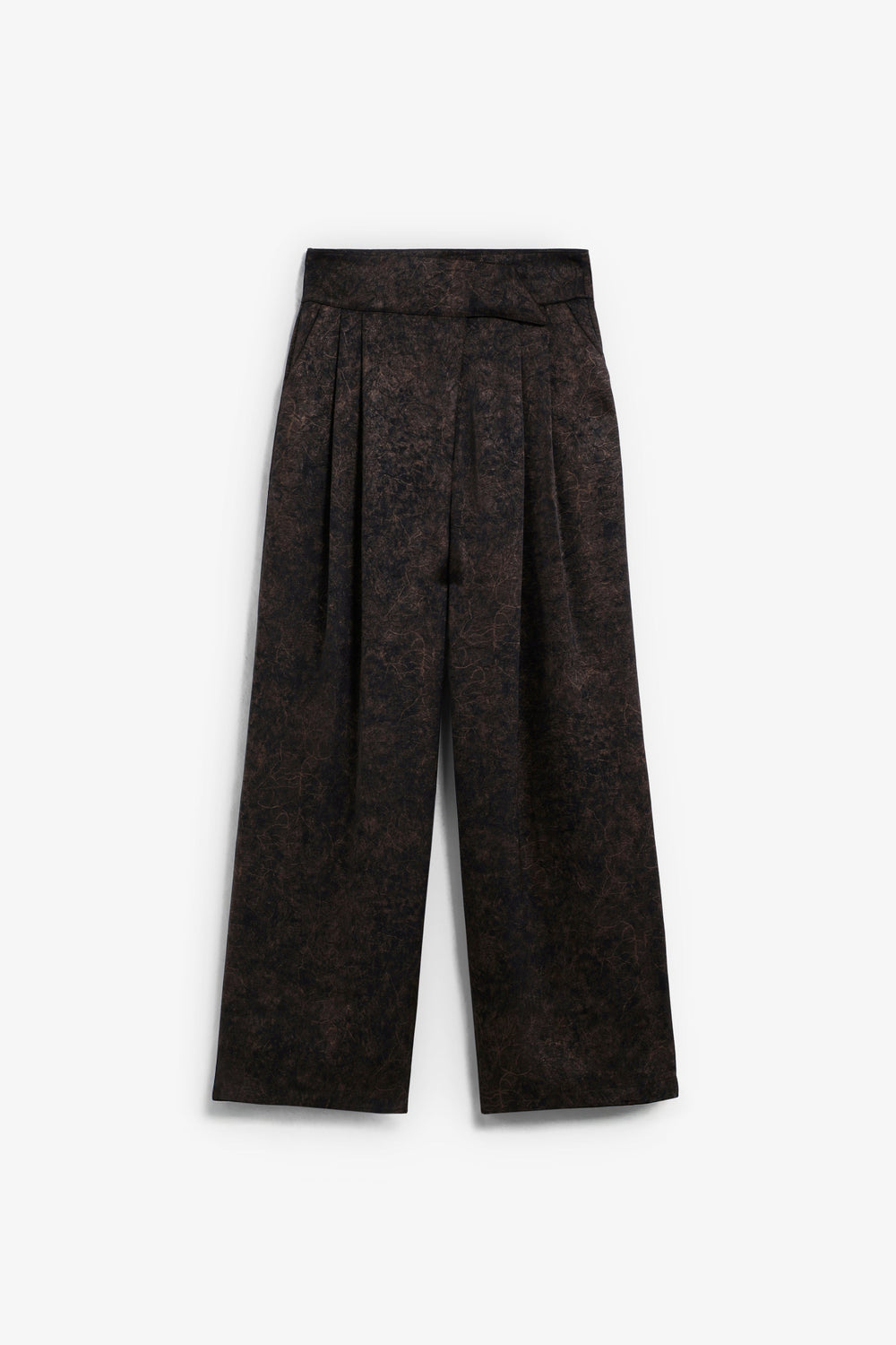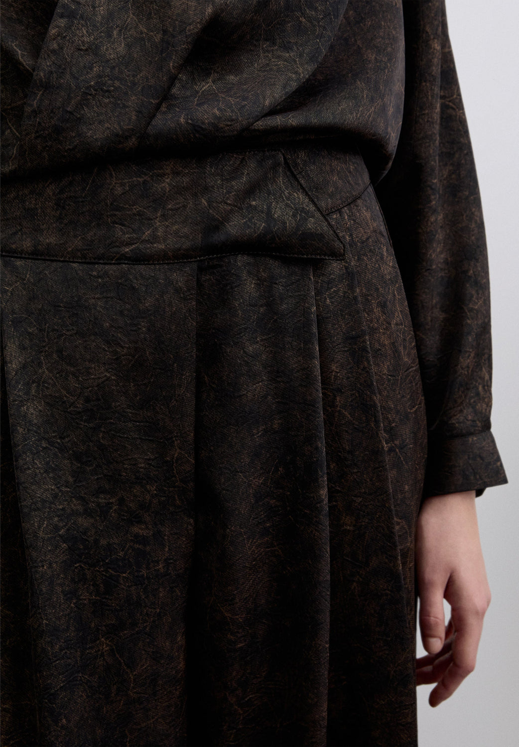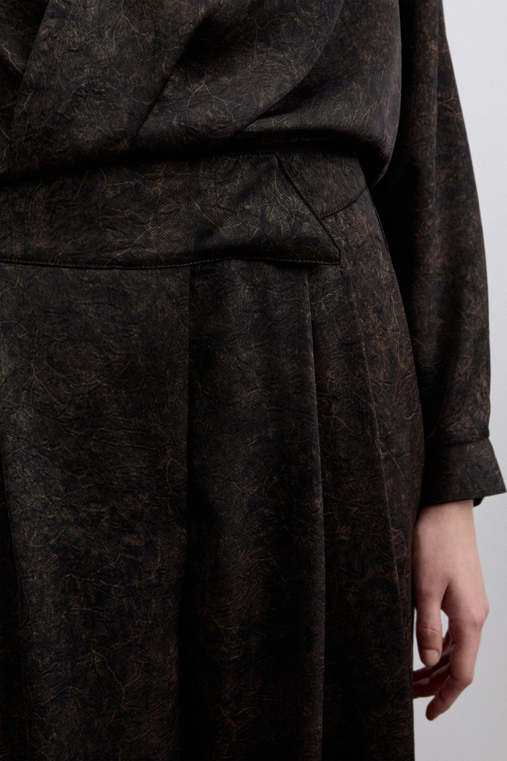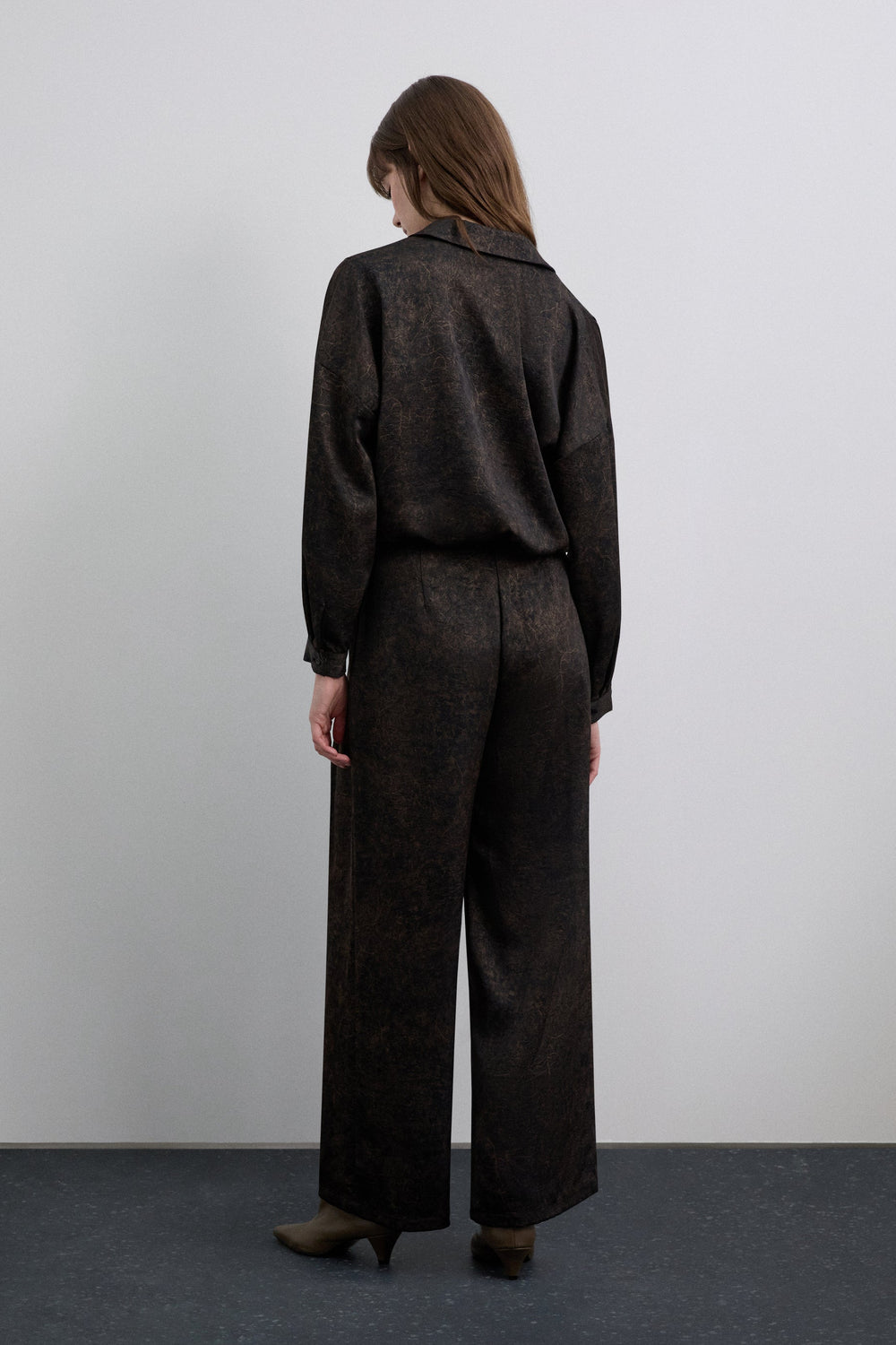 Calças confecionadas em tecido fluido com acabamento acetinado. Padrão com efeito mármore. Corte culottes. Fecho com zip frontal e bolsos laterais.