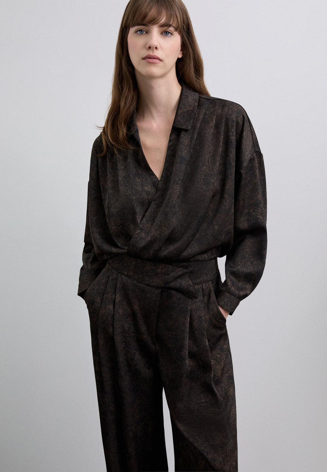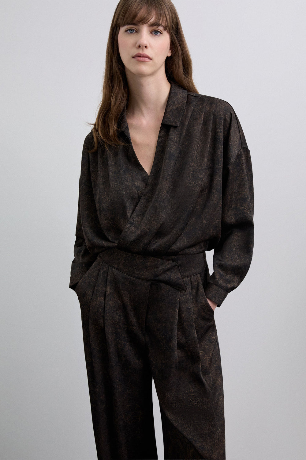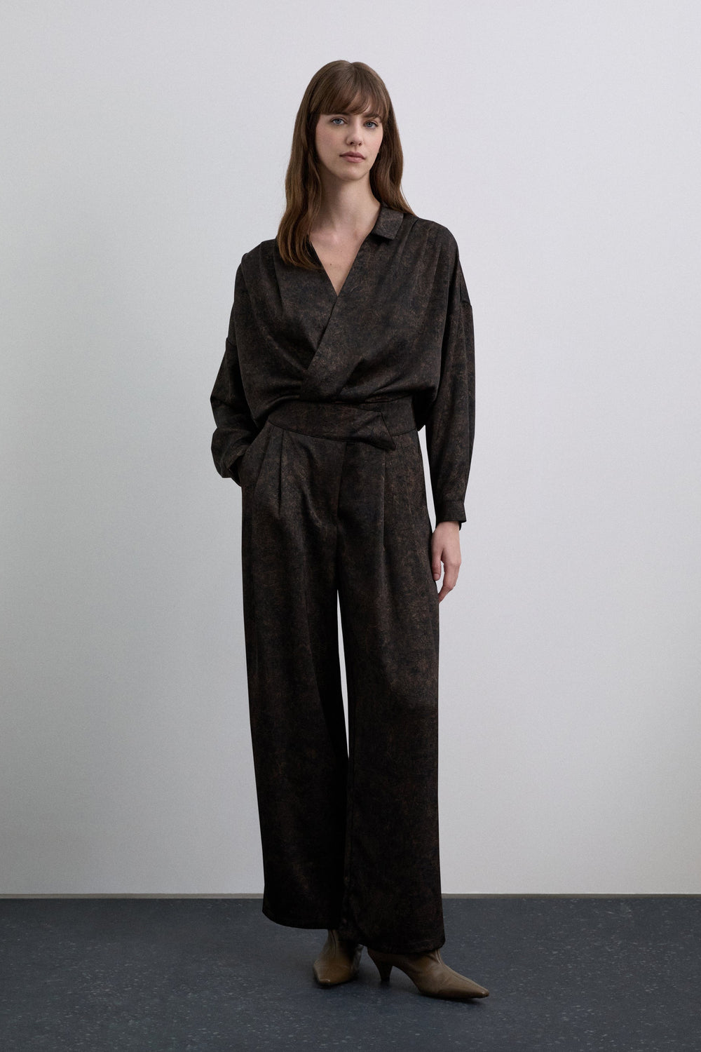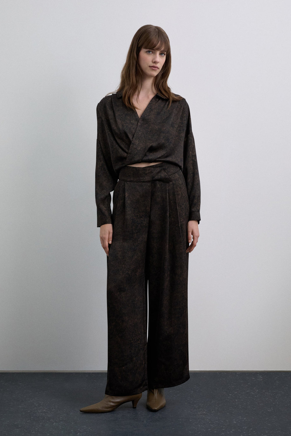 Calças confecionadas em tecido fluido com acabamento acetinado. Padrão com efeito mármore. Corte culottes. Fecho com zip frontal e bolsos laterais.