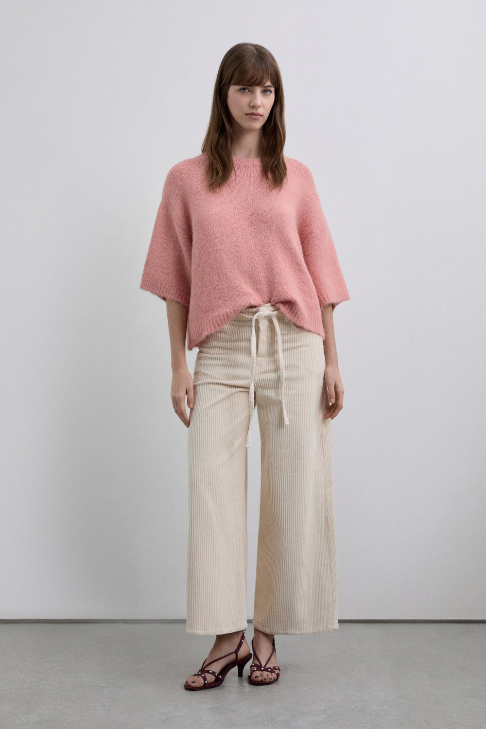 Calças confecionadas em algodão BCI. Full length. Efeito bombazina. Cordão no tom na cintura. Bolsos laterais e atrás.