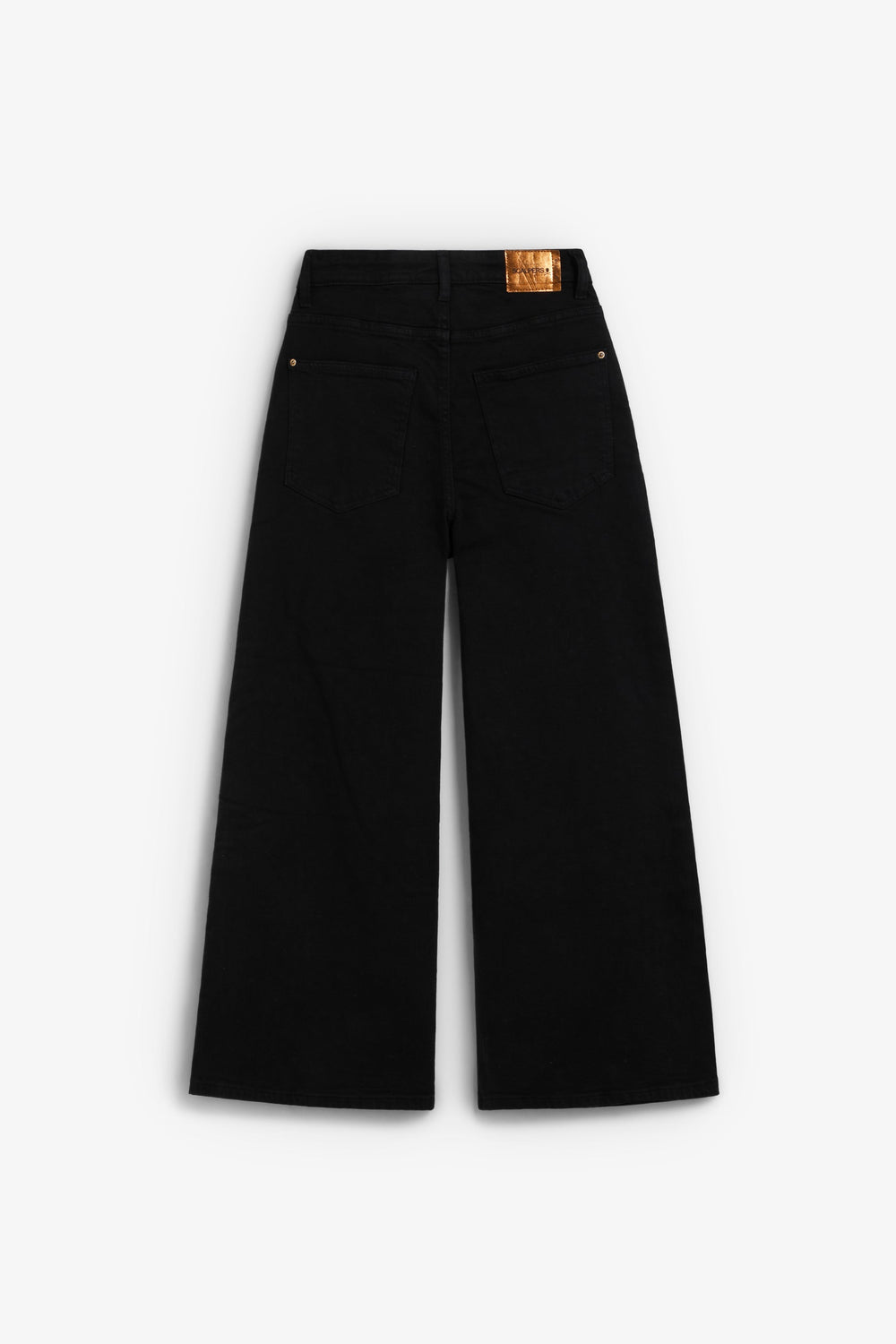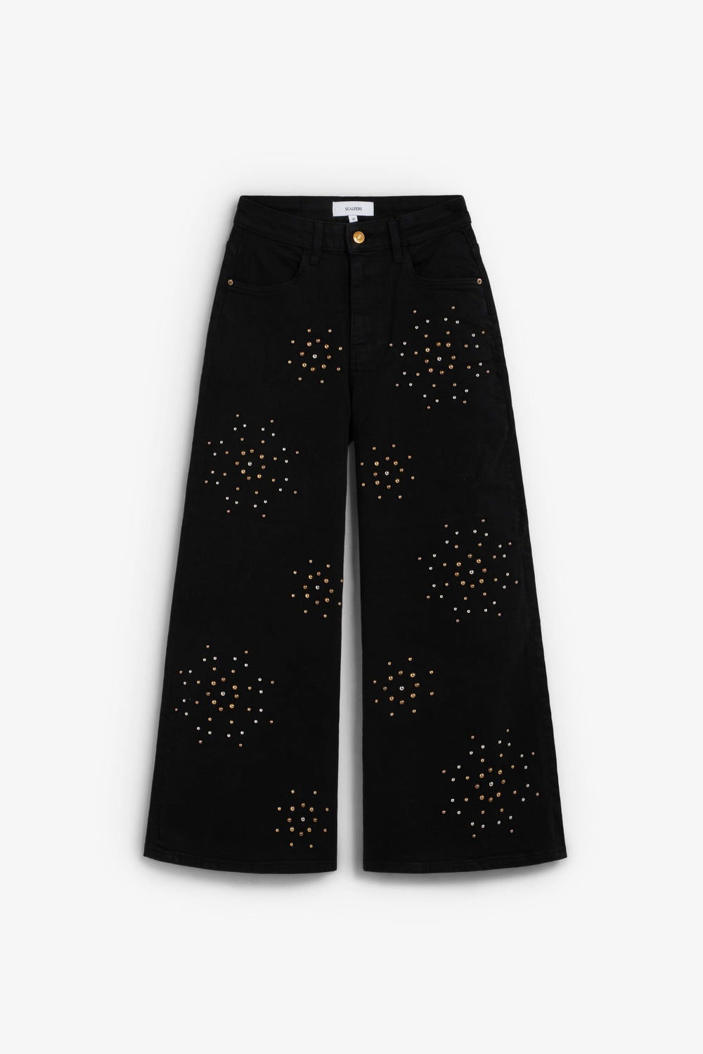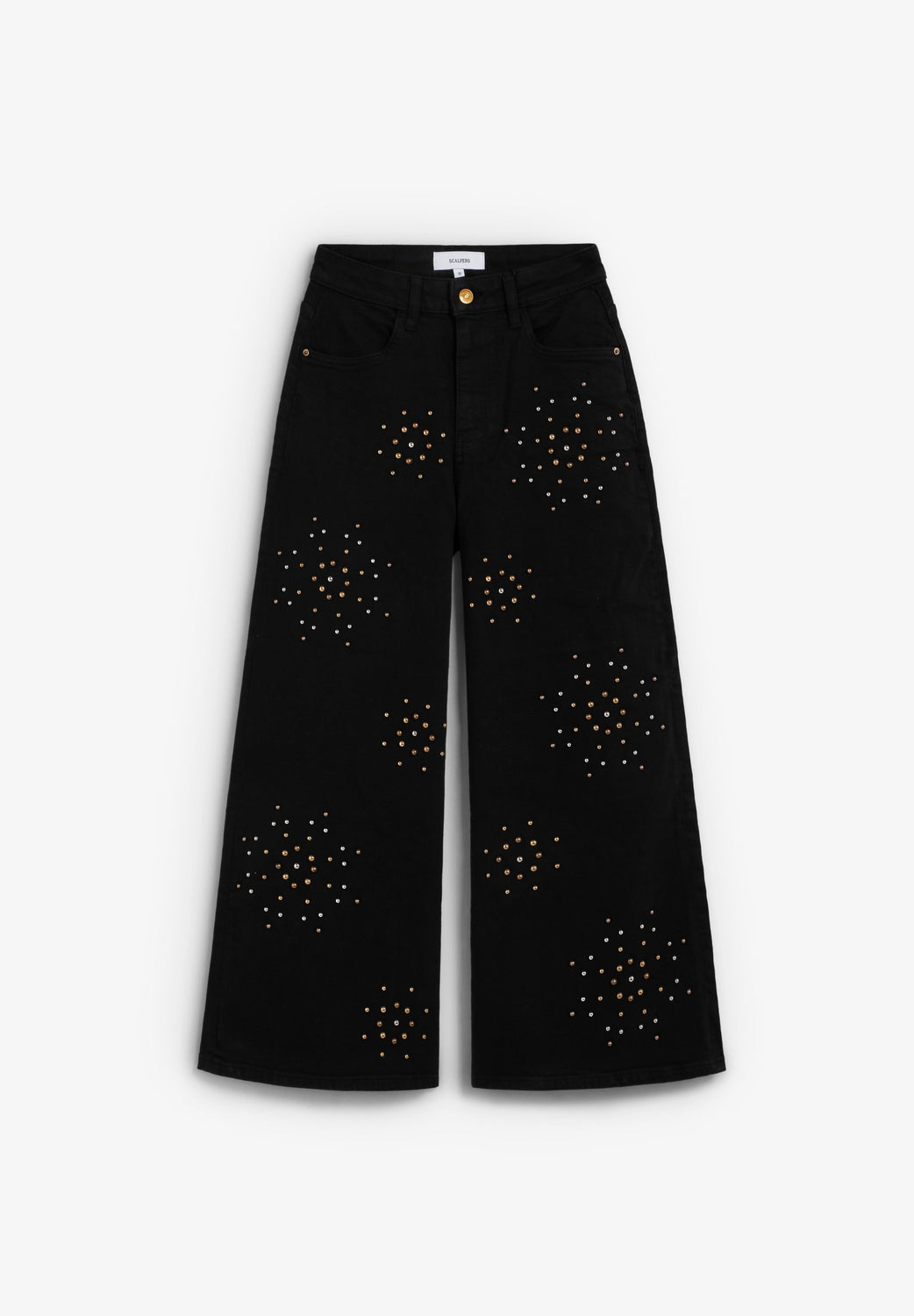 Calças denim confecionadas em algodão e elastano. Pormenor de tachas à frente. Corte culottes, cintura alta e fecho com zip e botão. Bolsos à frente e atrás.