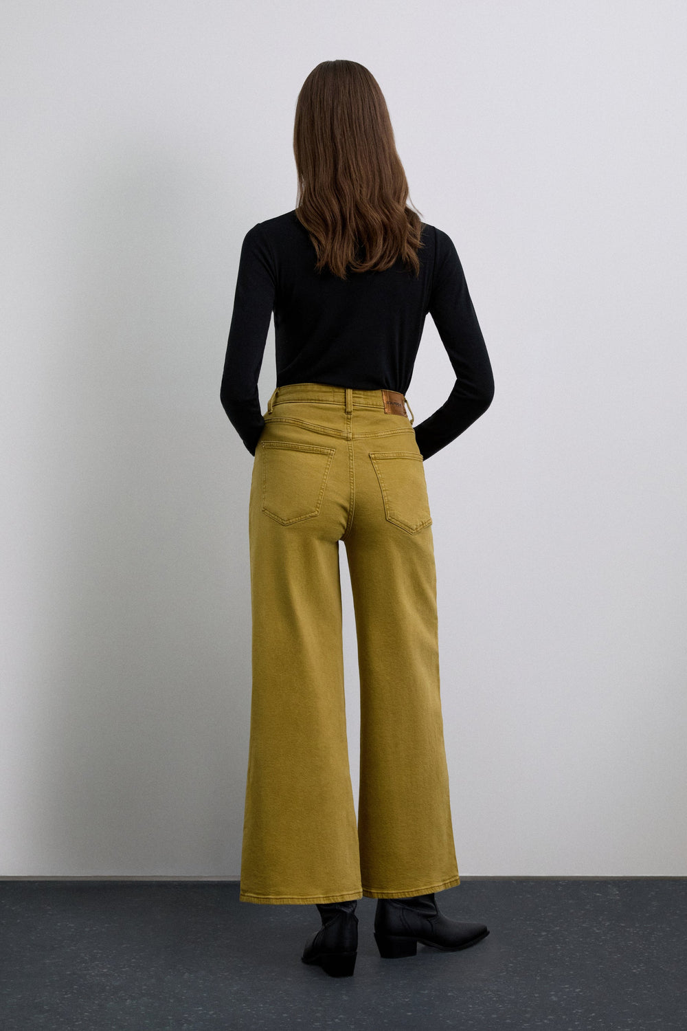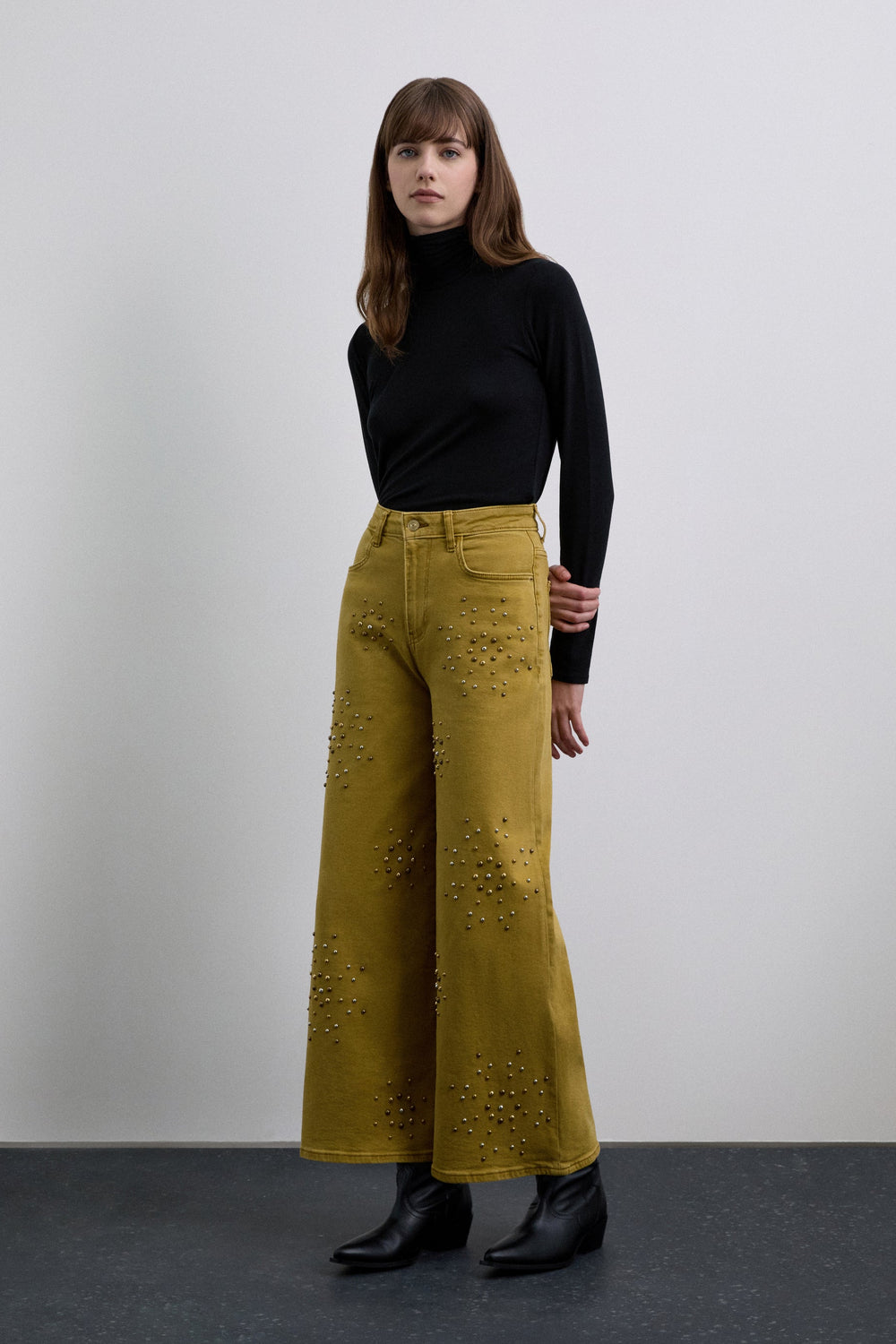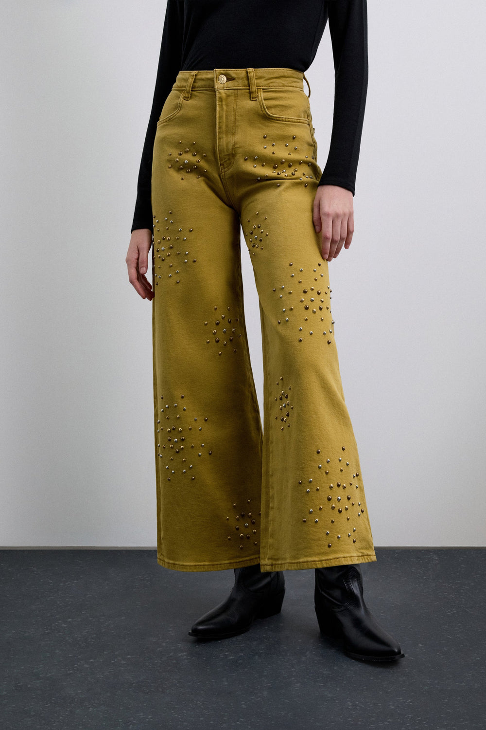 Calças denim confecionadas em algodão e elastano. Pormenor de tachas à frente. Corte culottes, cintura alta e fecho com zip e botão. Bolsos à frente e atrás.