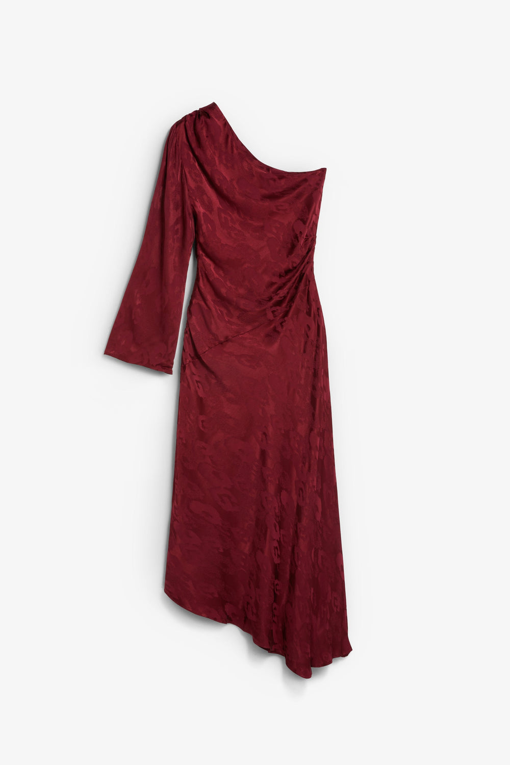 Vestido assimétrico acetinado. Estampado Jacquard. Manga comprida assimétrica. Bainha fluida assimétrica.