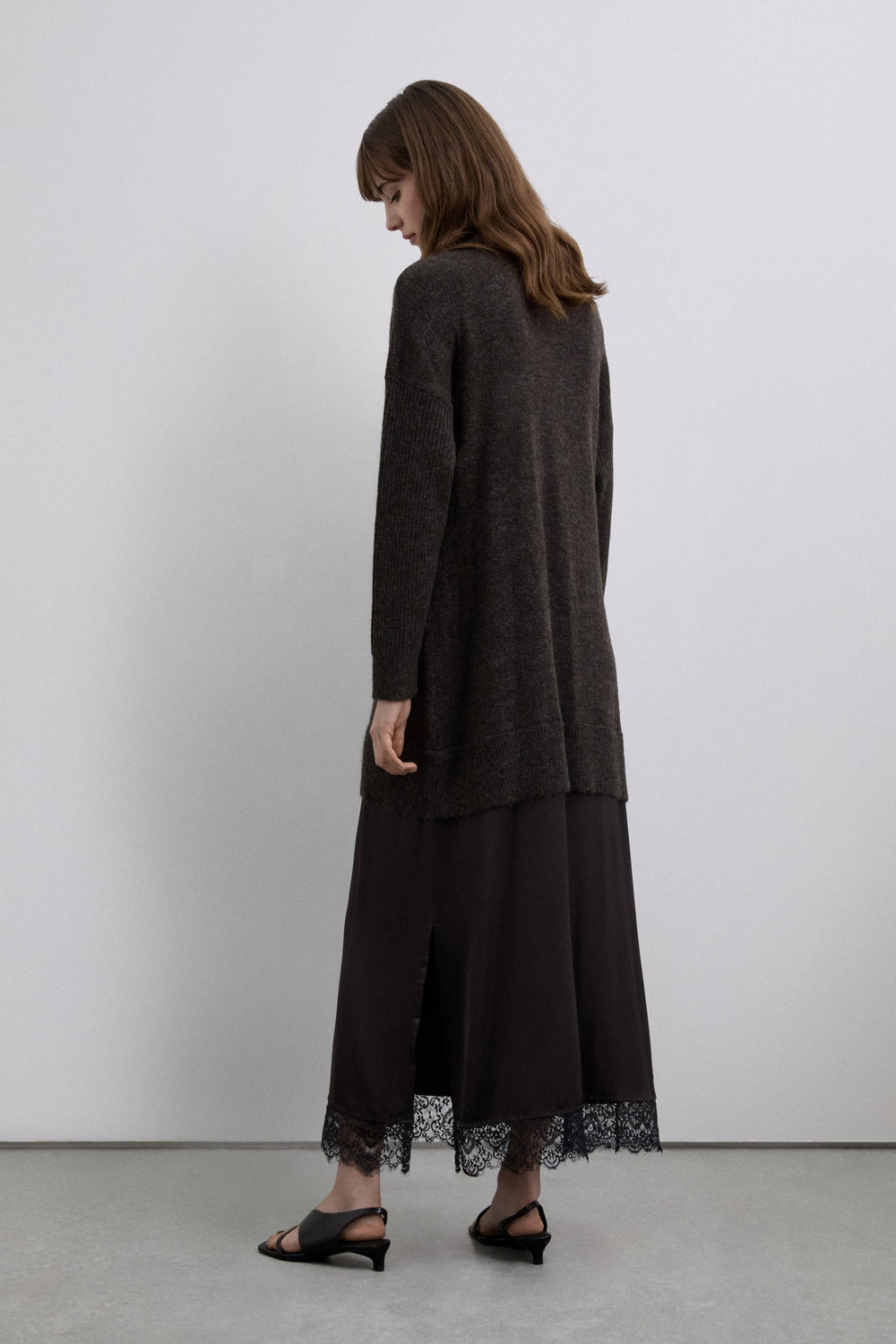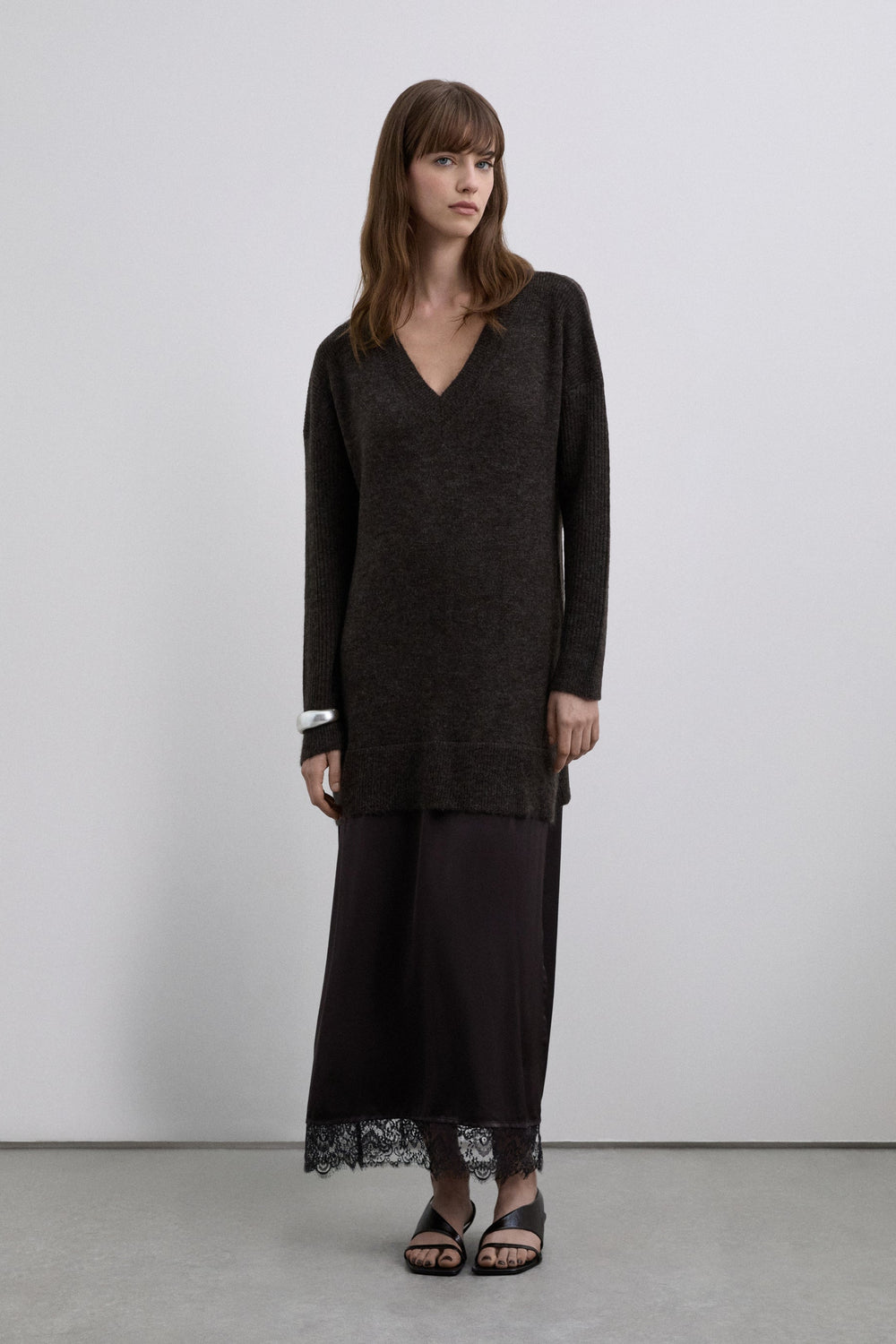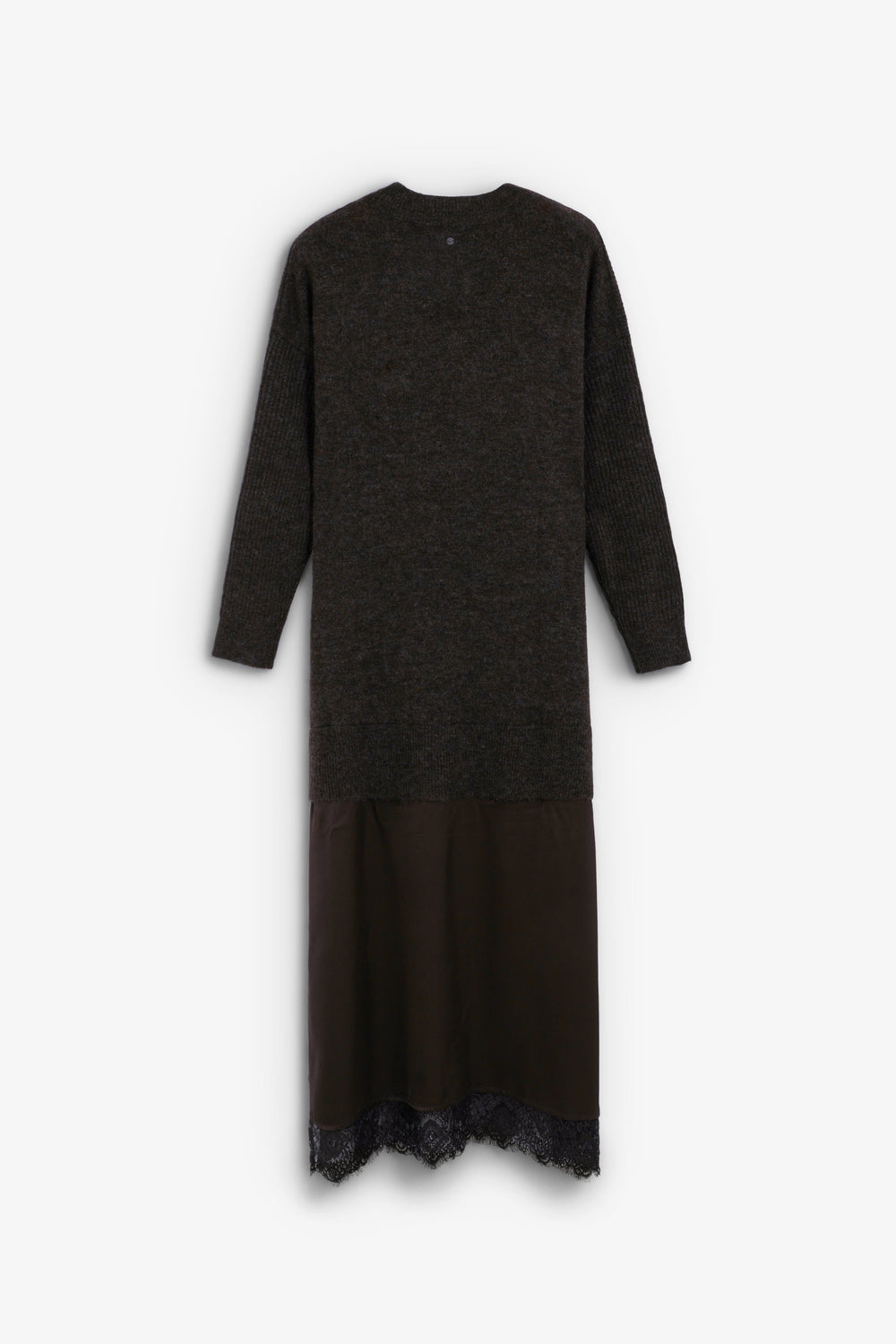 Vestido folgado confecionado em mistura de lã e viscose. Comprimento midi e decote em V. Manga comprida. Acabamento canelado no decote, nos punhos e na bainha com pormenor rendado em castanho e preto.