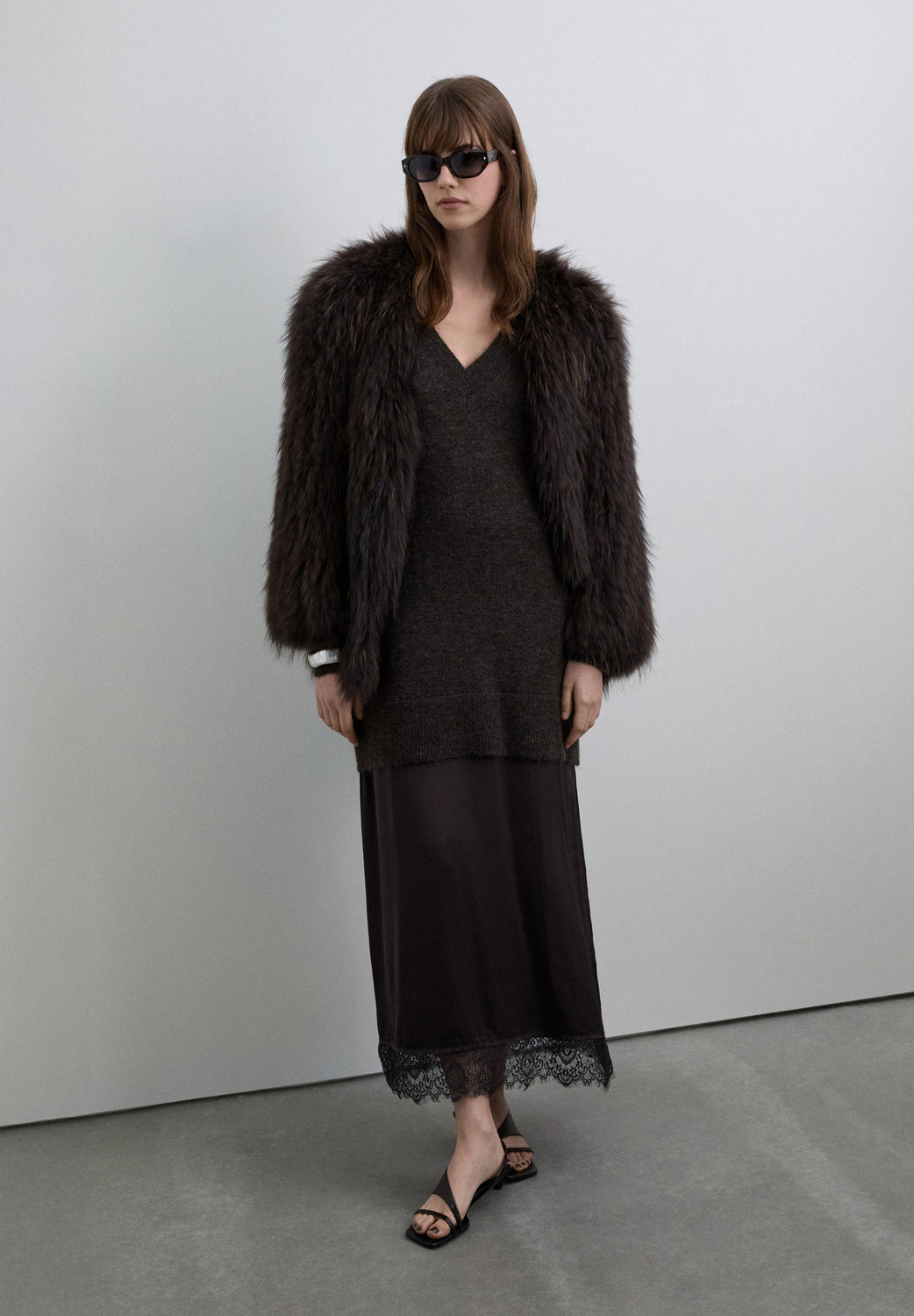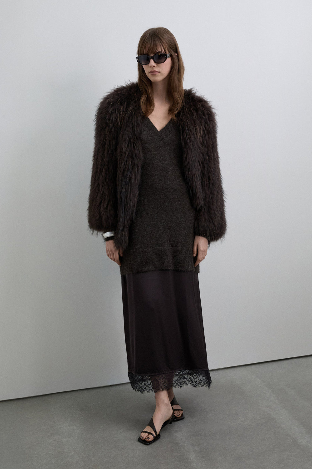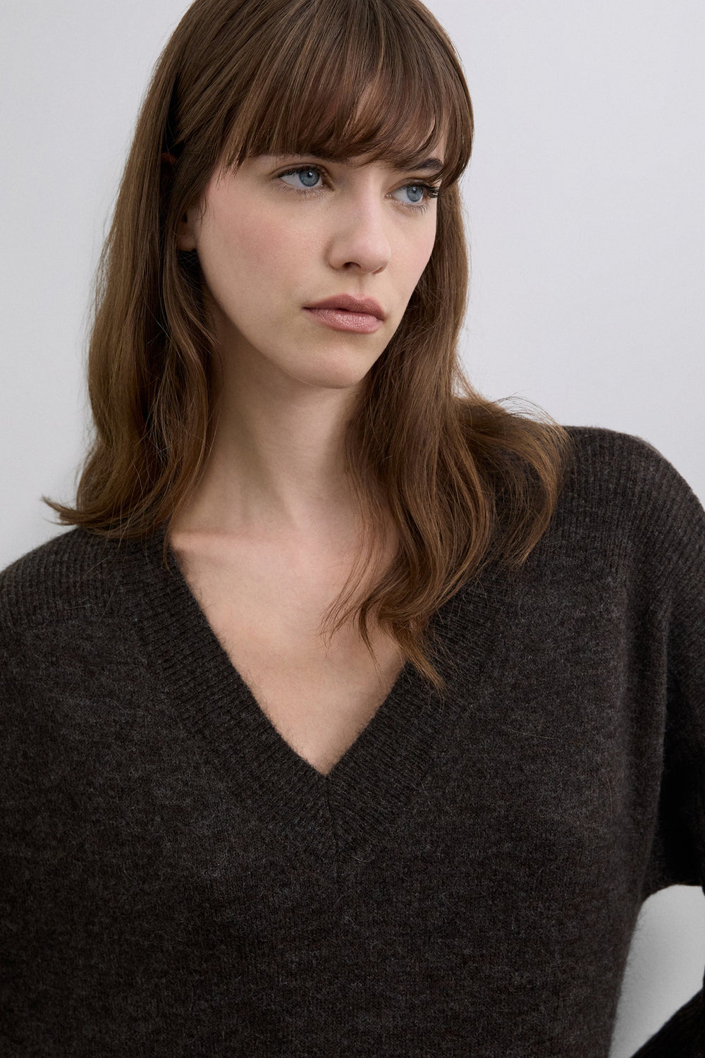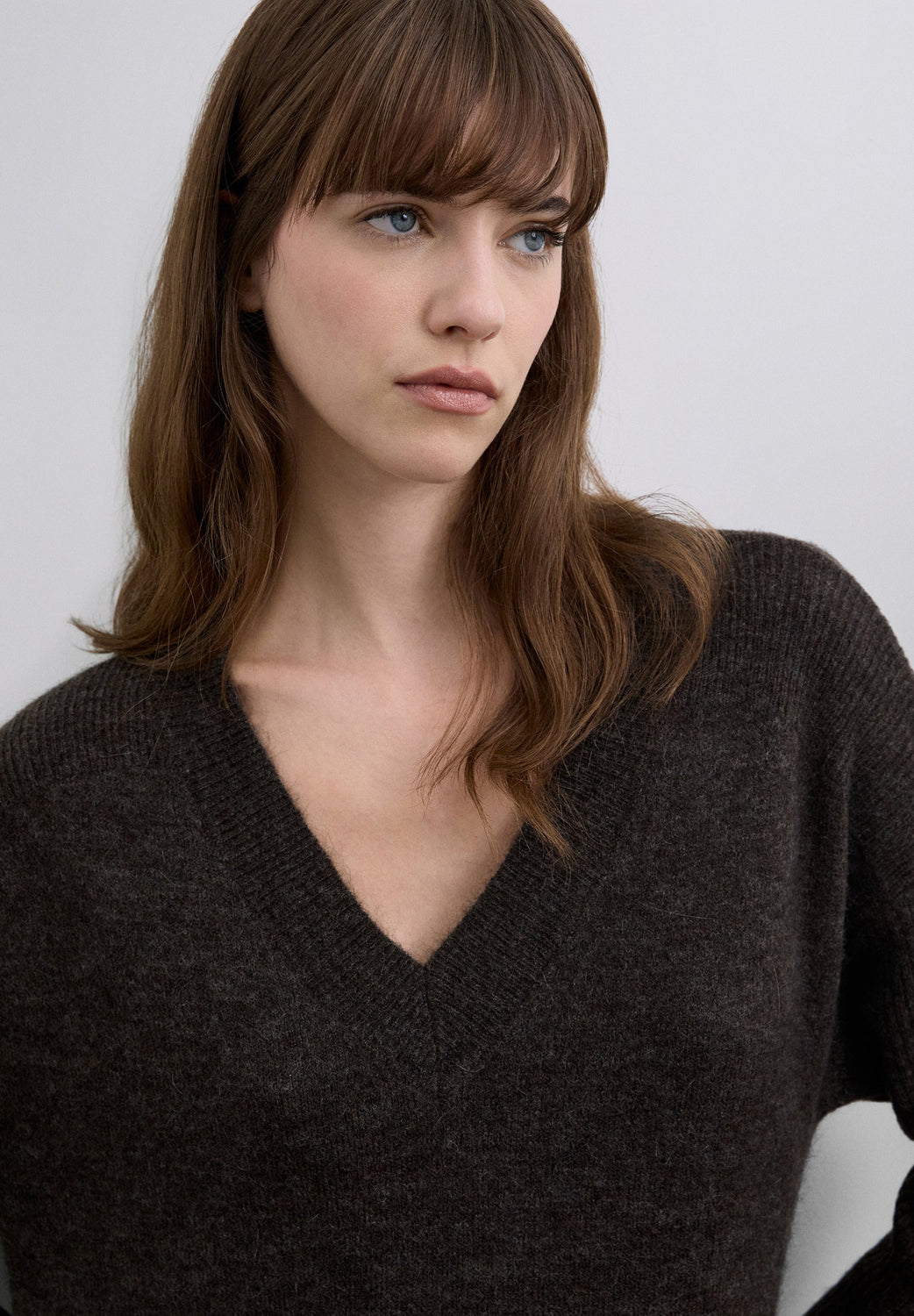 Vestido folgado confecionado em mistura de lã e viscose. Comprimento midi e decote em V. Manga comprida. Acabamento canelado no decote, nos punhos e na bainha com pormenor rendado em castanho e preto.