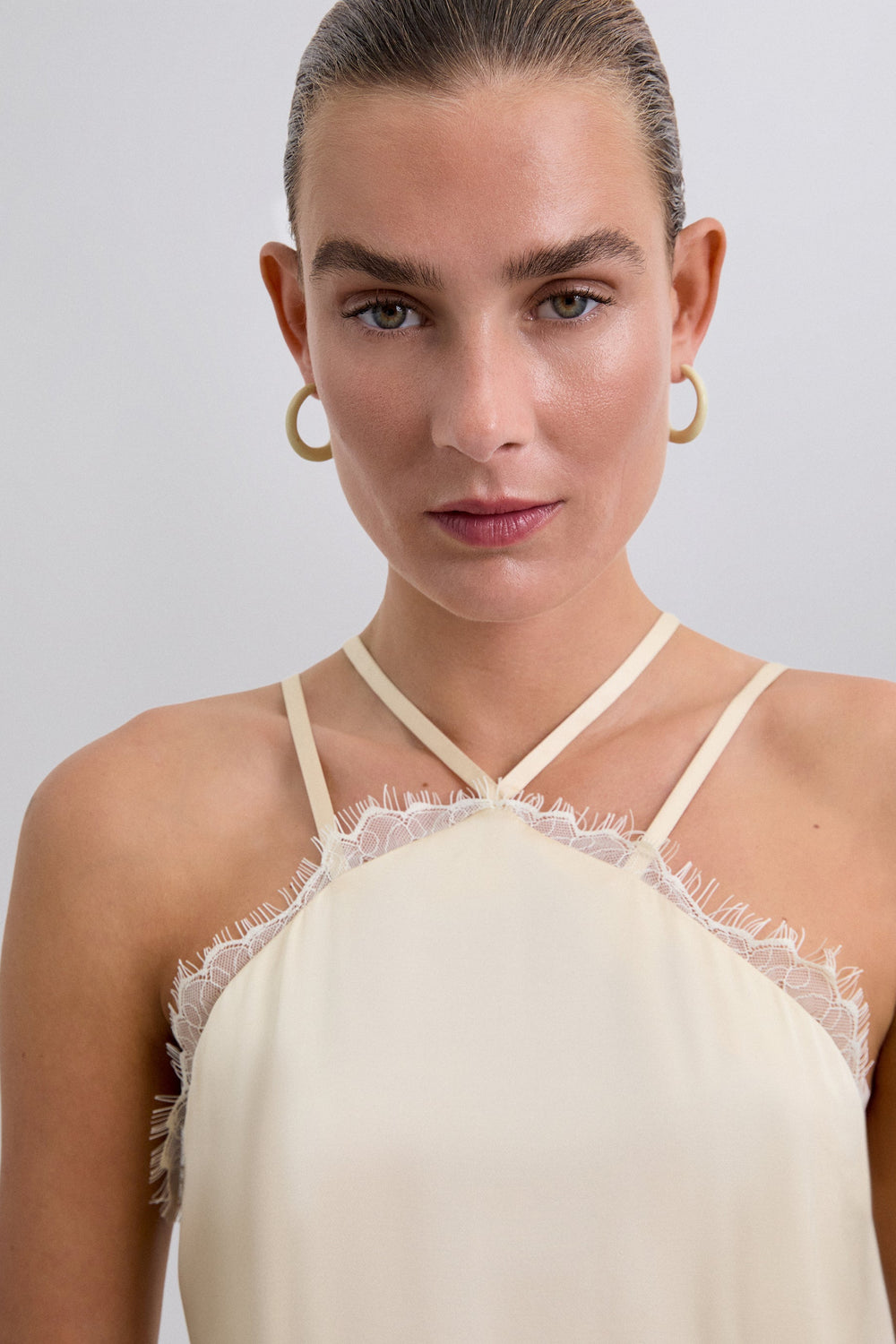 Vestido de corte midi em tecido fluido com acabamento acetinado. Alças finas. Pormenor de renda no decote. Motivos assimétricos. Abertura na bainha.