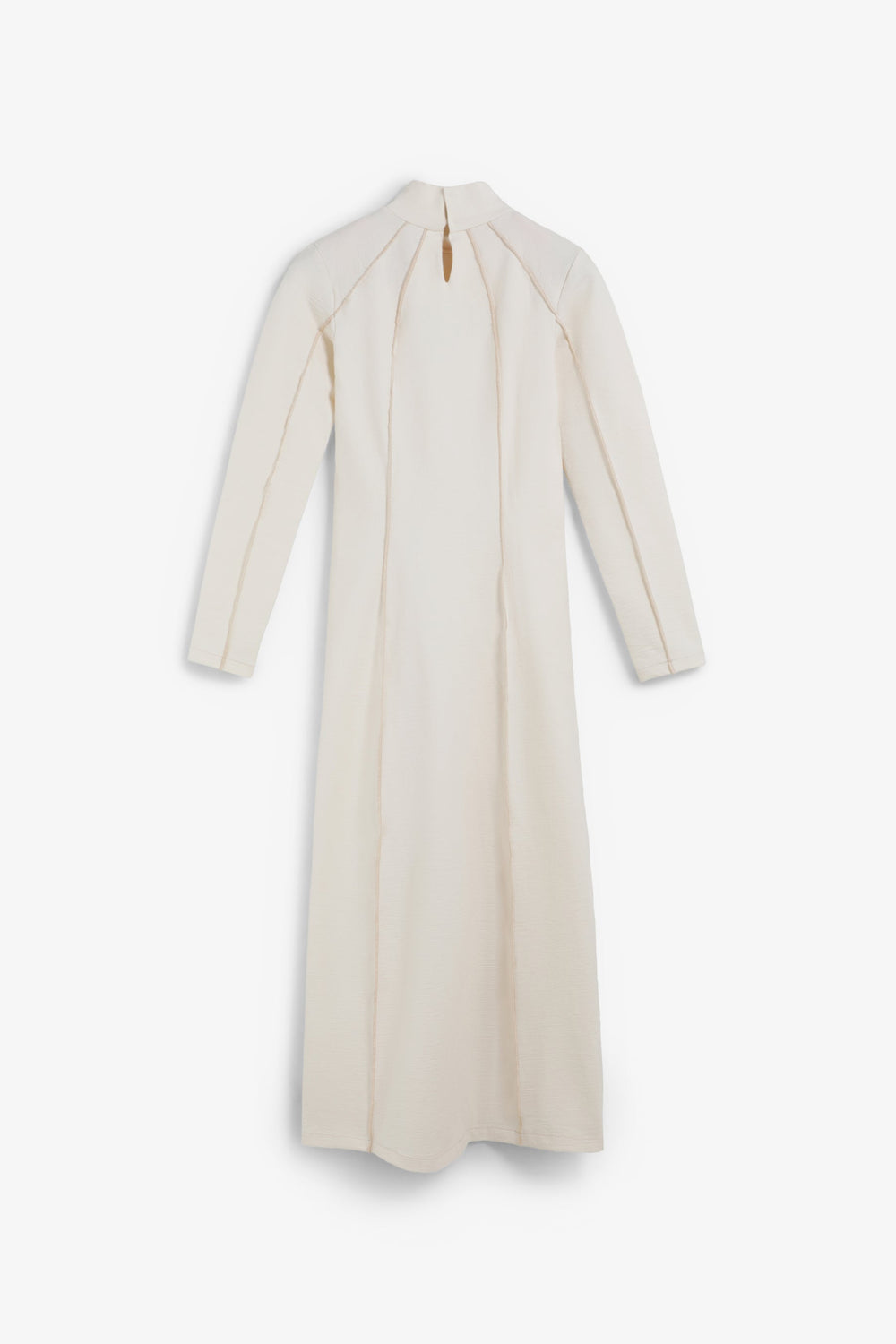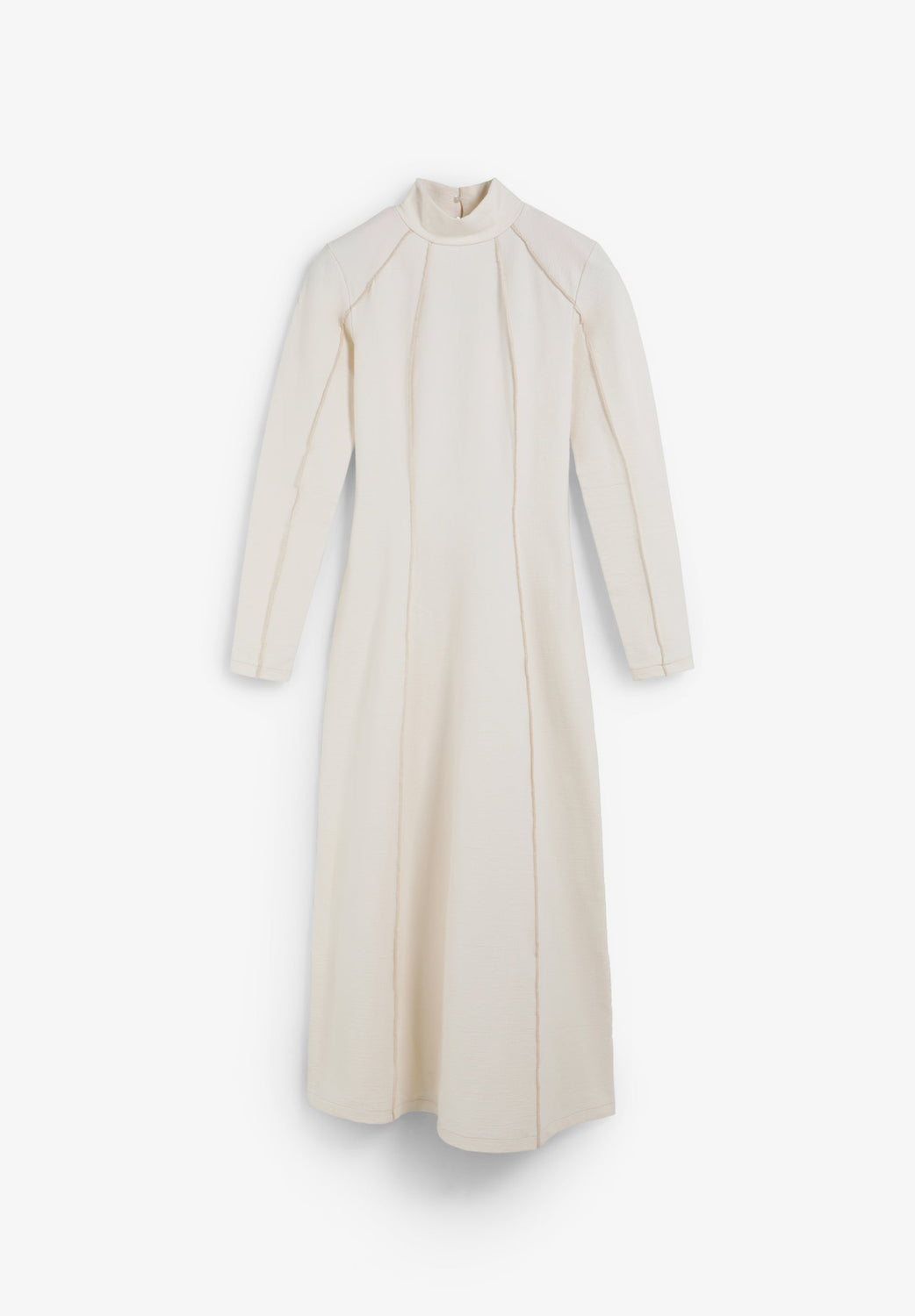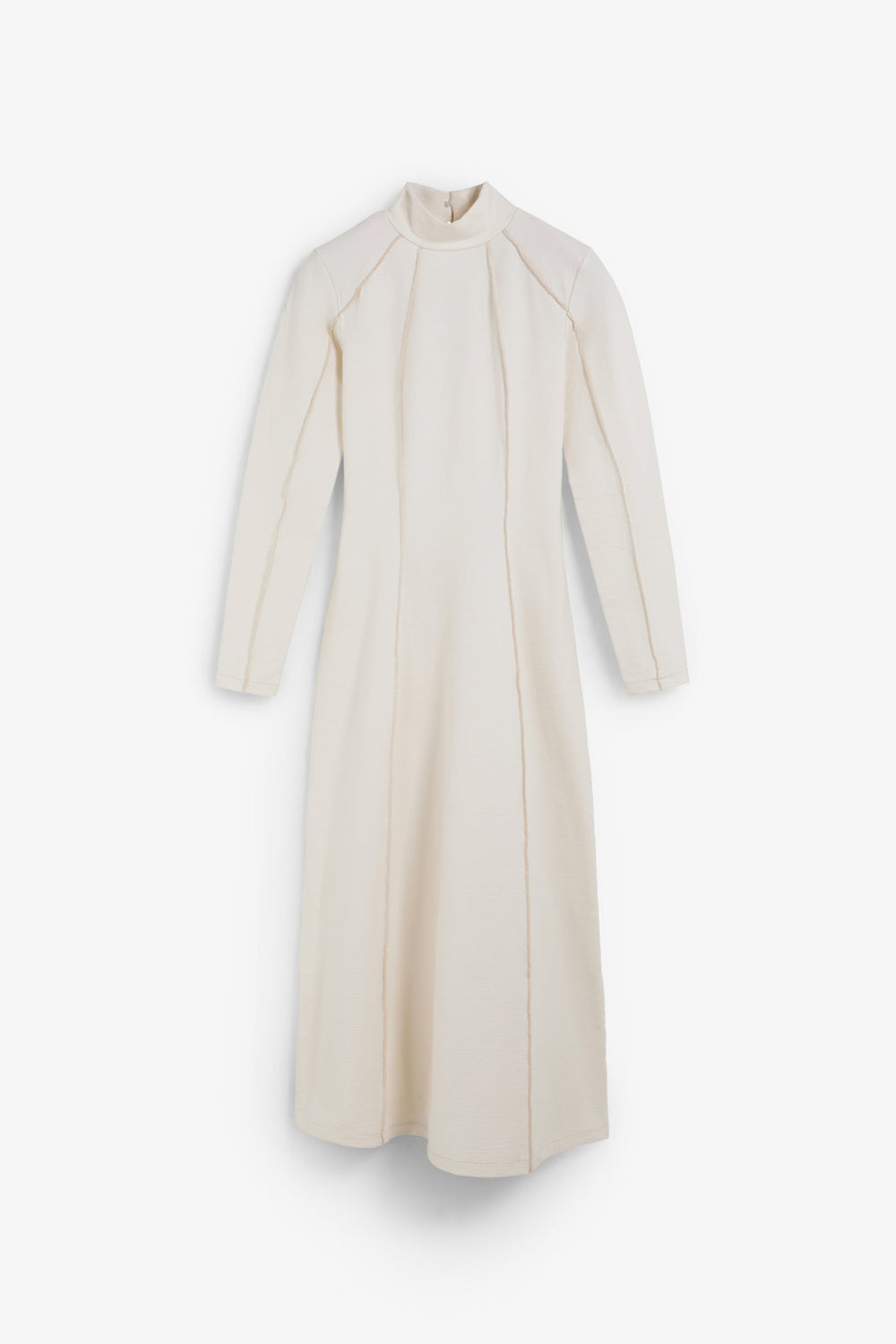 Vestido midi de malha confecionado em algodão BCI. Mangas compridas. Gola alta. Ponto overlock.