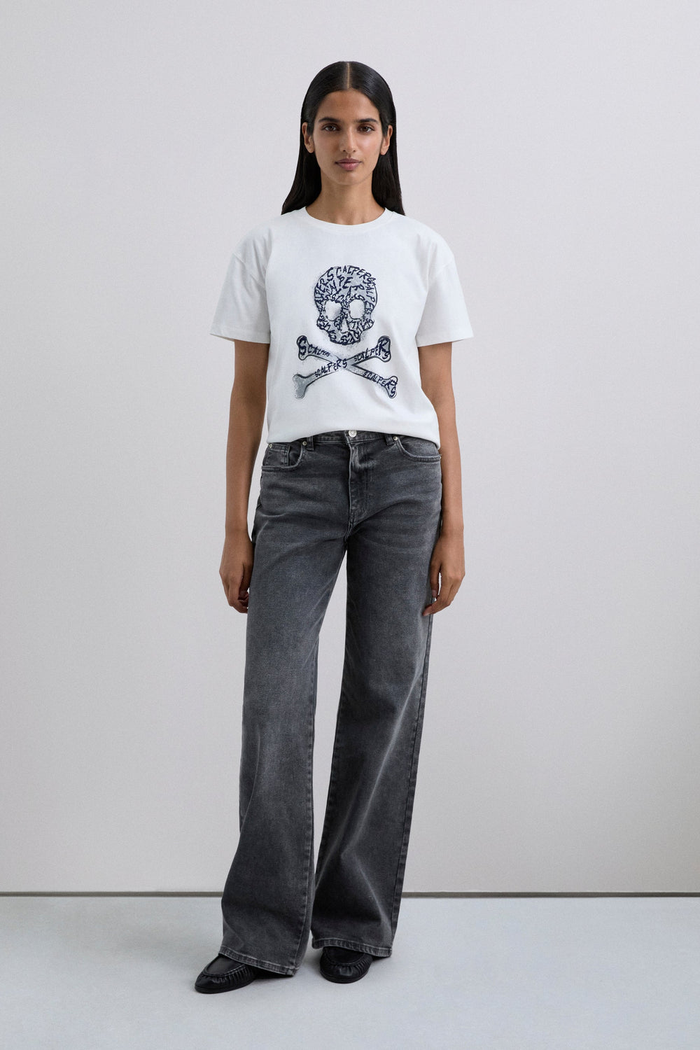 T-shirt confecionada em 100% algodão BCI com padrão de skull.. Corte regular fit, decote redondo e manga curta.