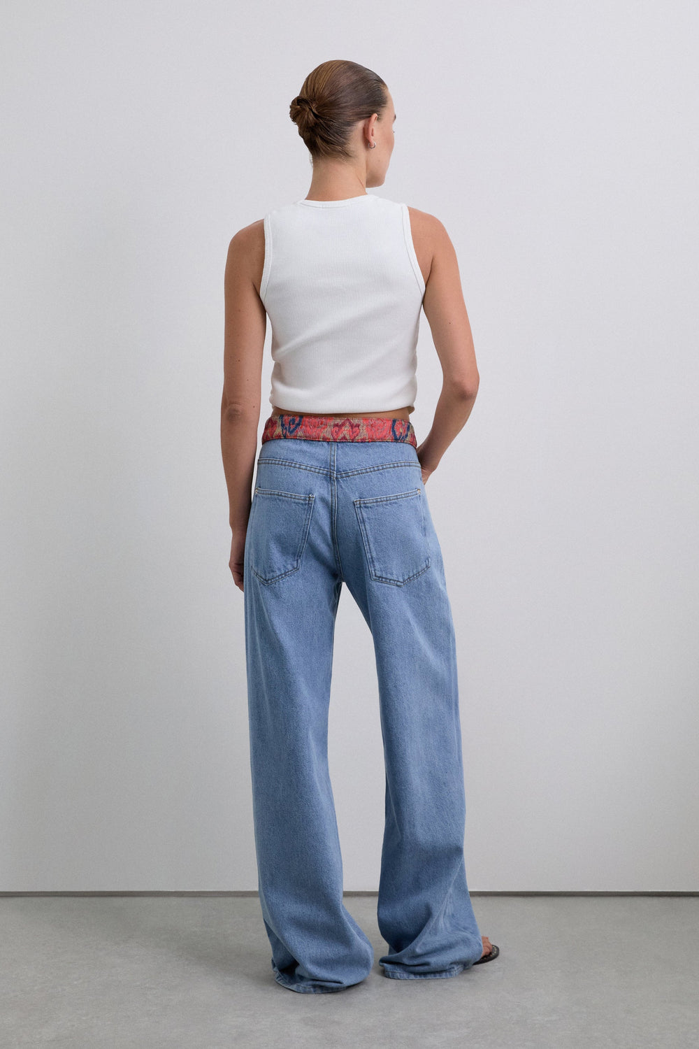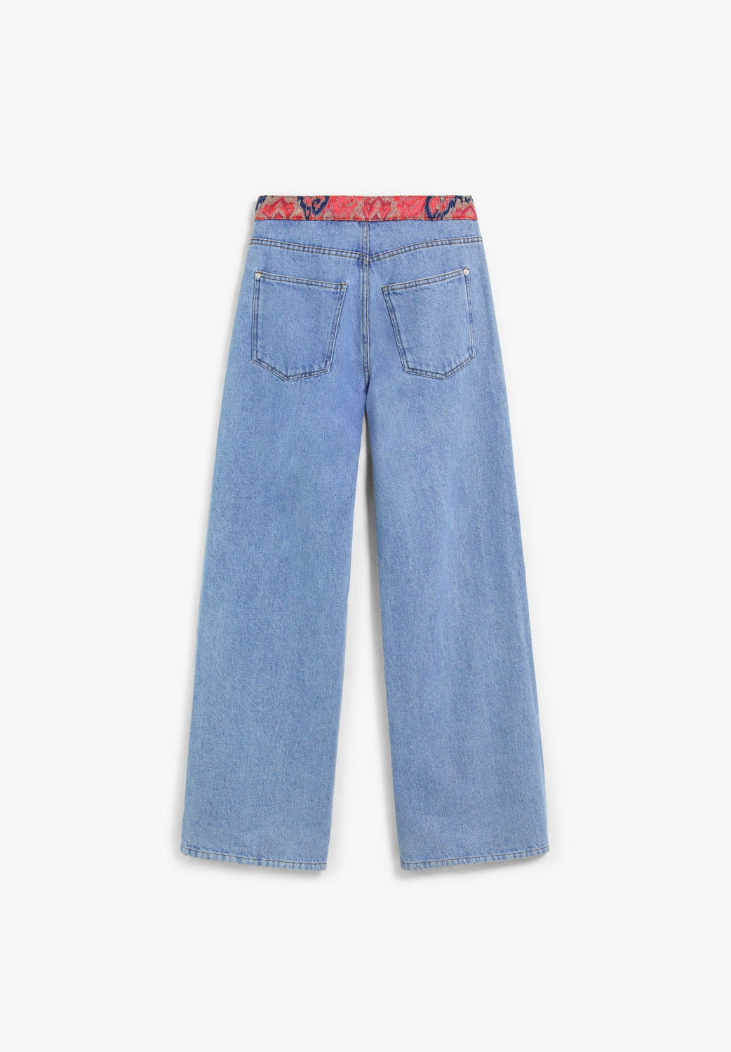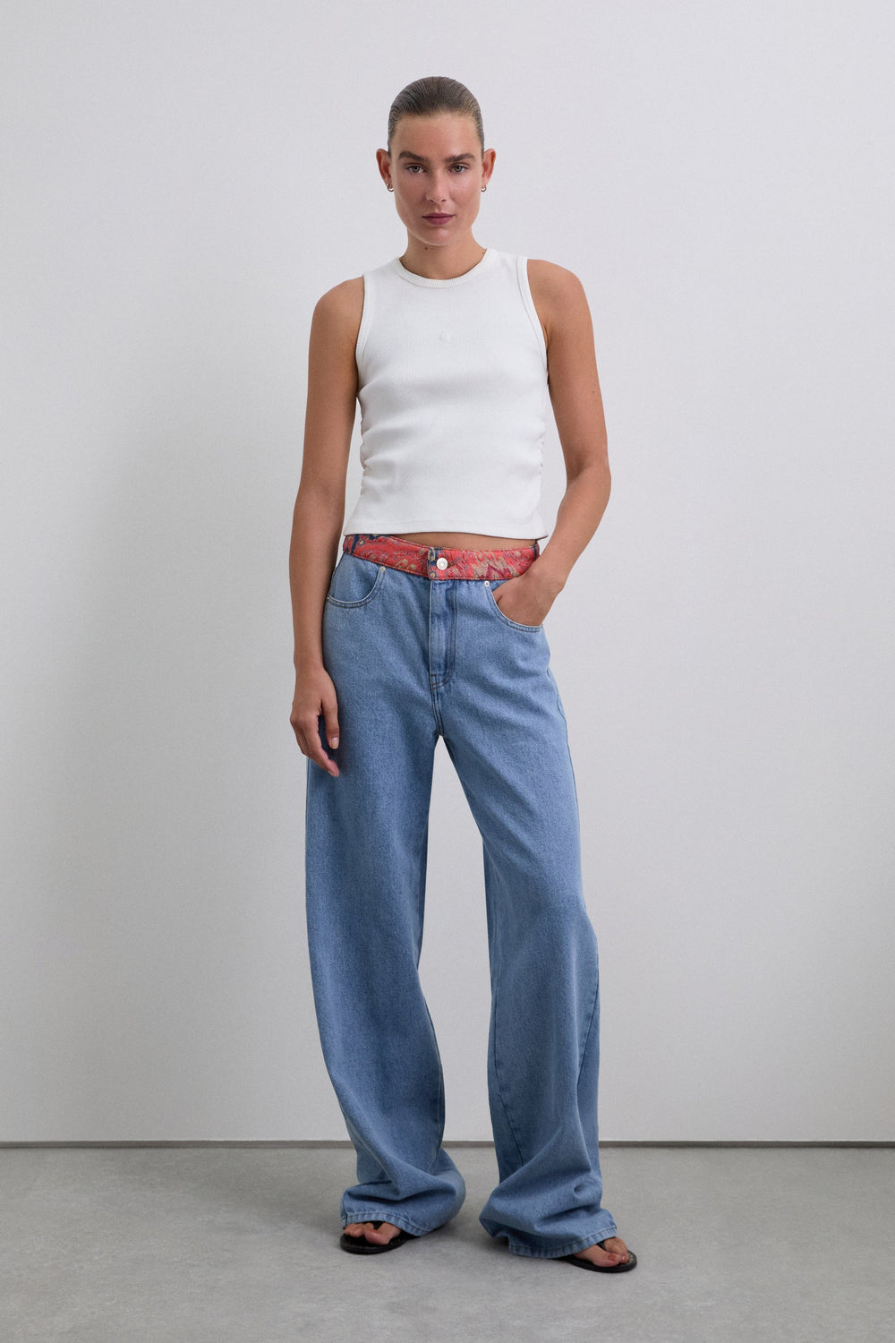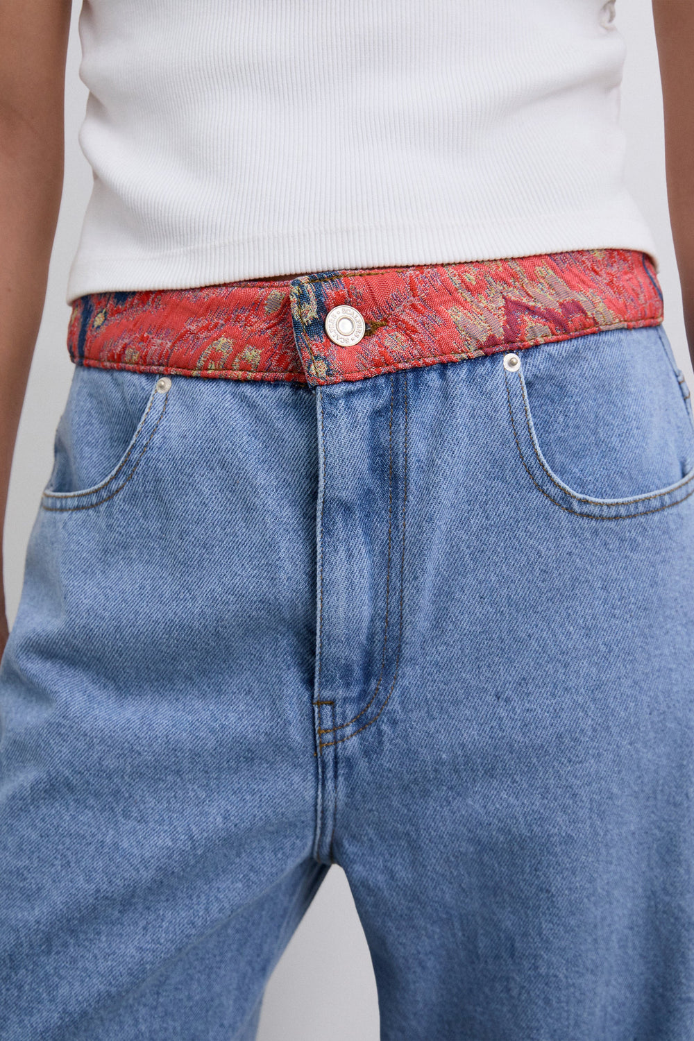 Calças denim compridas, mid waist. Tecido em contraste na cintura. Fecho com botão. Bolsos à frente e atrás.