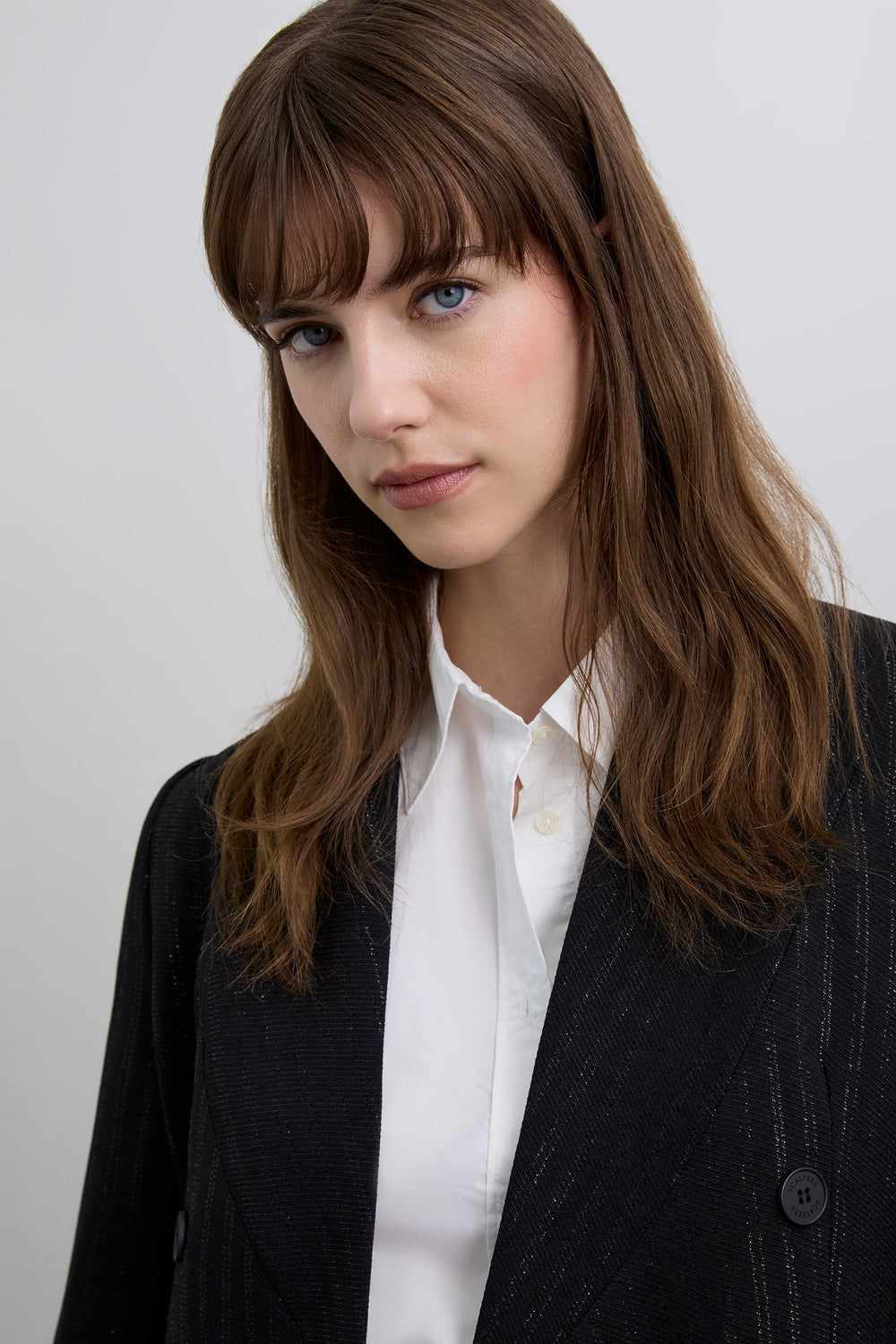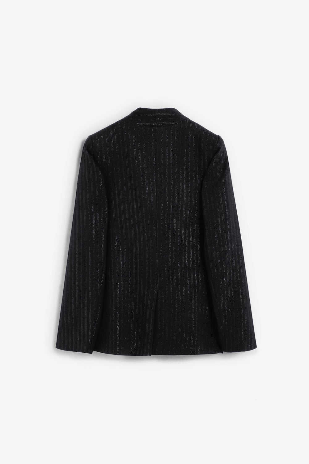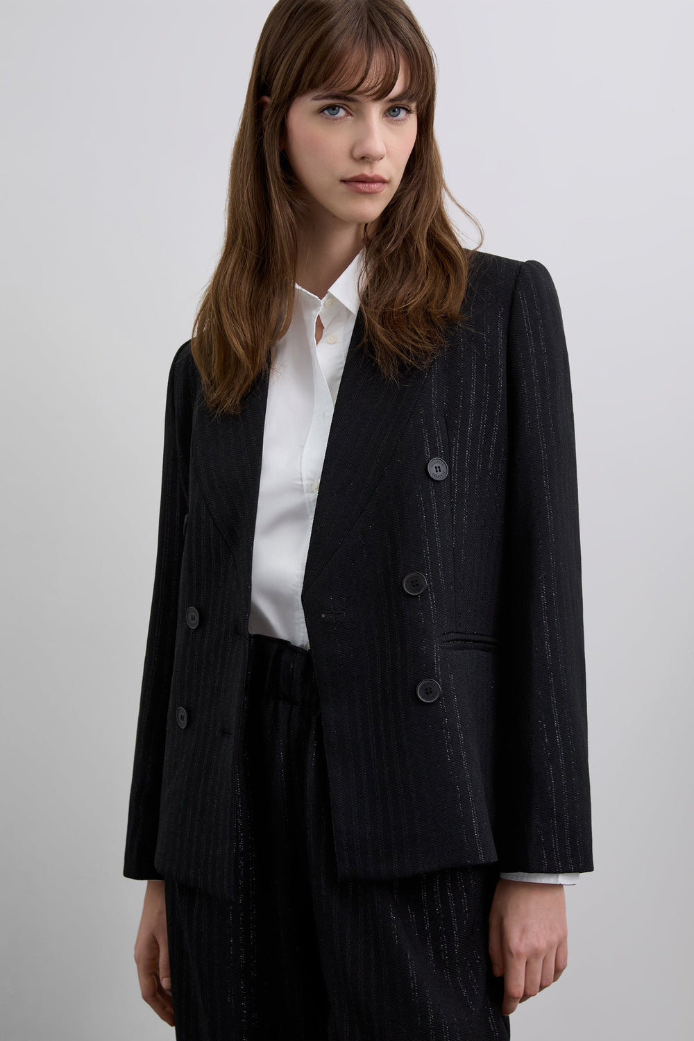 Blazer de risca diplomática e dupla abotoadura. Gola lapela. Corte Regular Fit. Fecho cruzado com botões à frente. Bolsos à frente com aba.