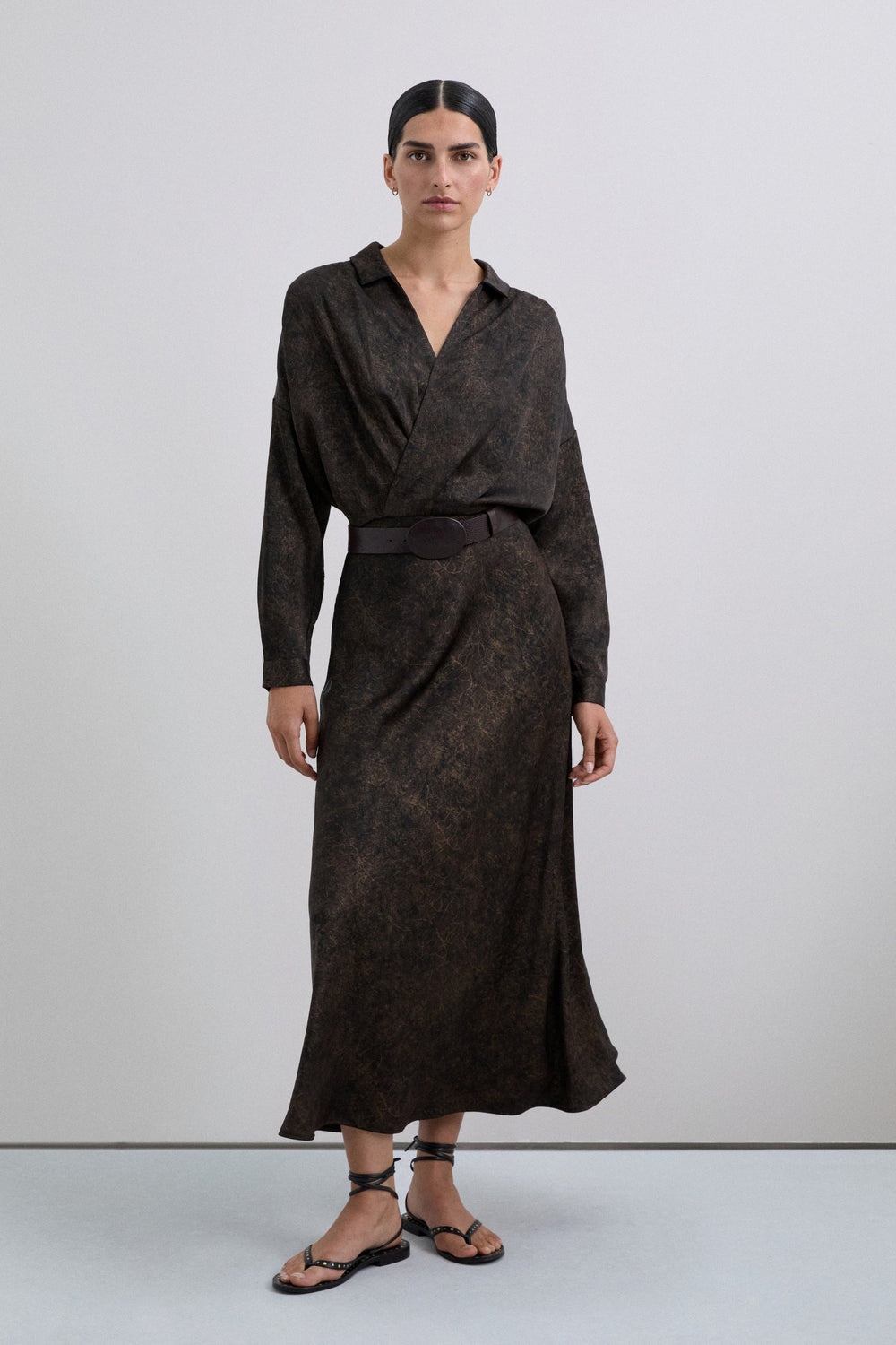 Saia confecionada em tecido fluido com acabamento acetinado. Padrão com efeito mármore. Regular fit. Corte midi. Fecho com zip lateral oculto.