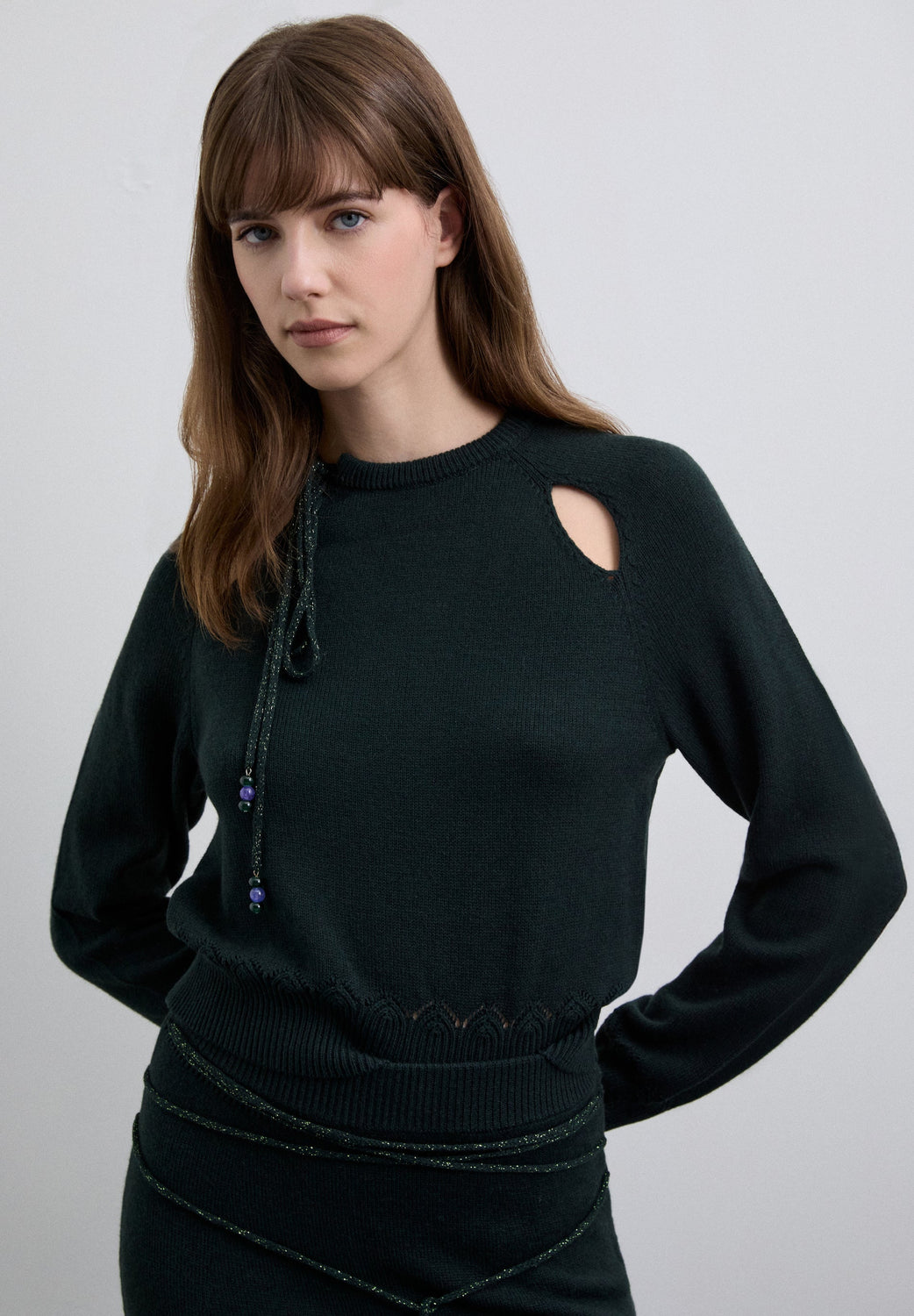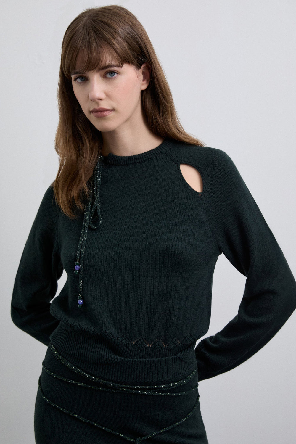 Sweater confecionada em mistura de lã. Regular fit. Decote redondo com fita rematada com contas. Manga comprida raglã com aberturas à frente e terminação em punhos acabados com padrão decorativo.