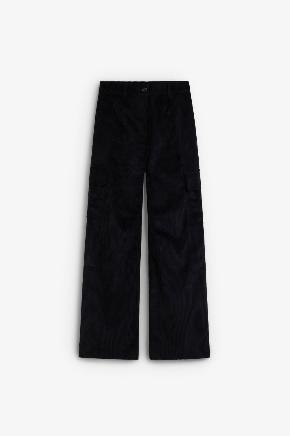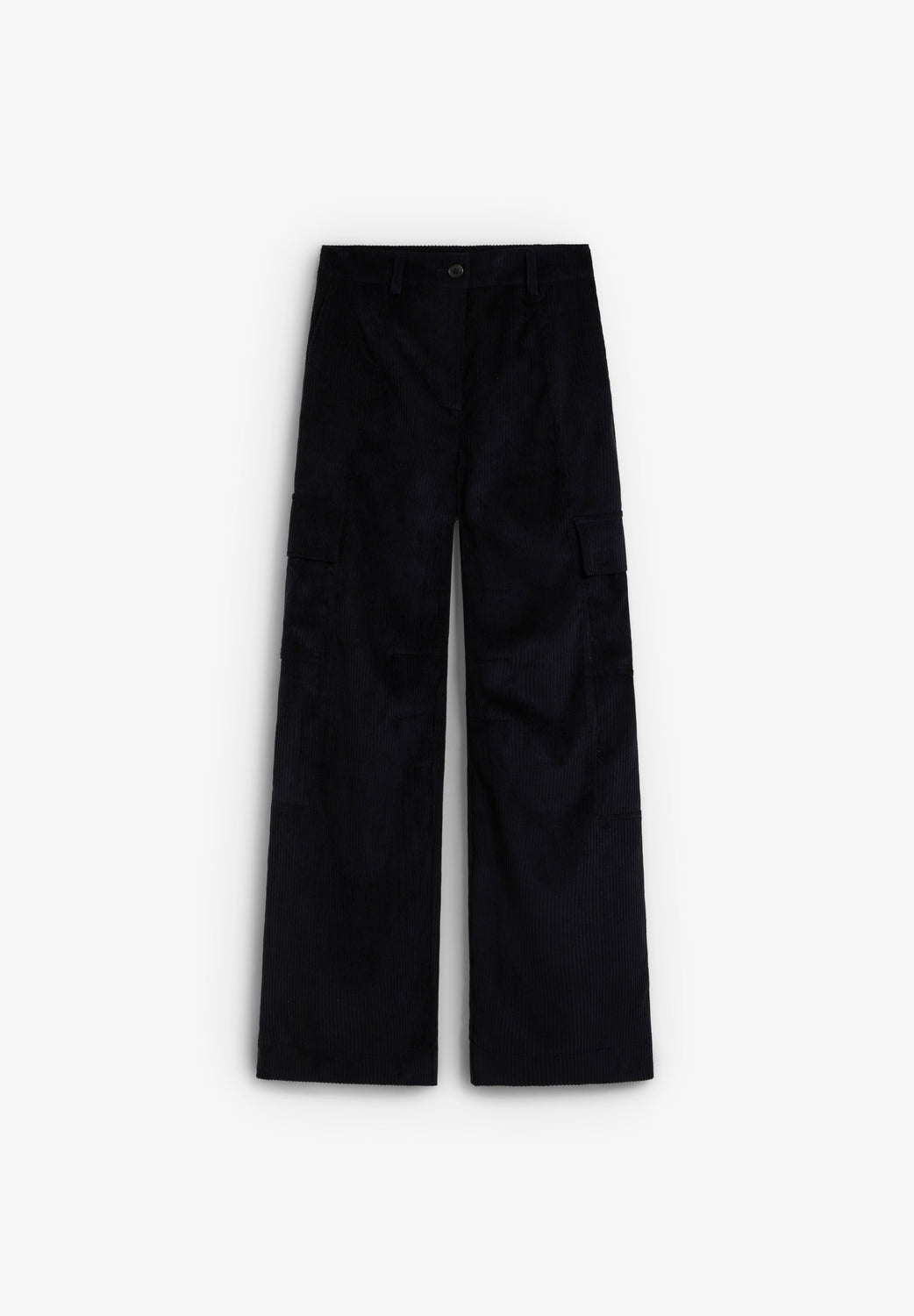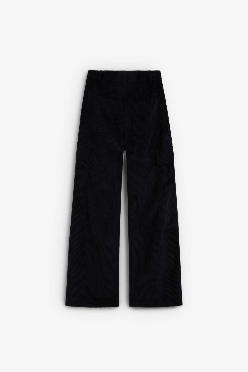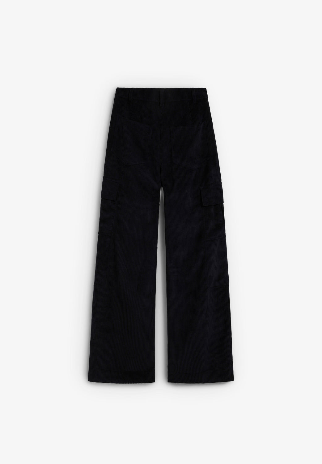 Calças cargo de bombazina de cintura alta. Comprimento total. Bolsos de remendo no peito. Dois bolsos à frente e dois atrás. Presilhas na cintura. Fecho com botão e zip.