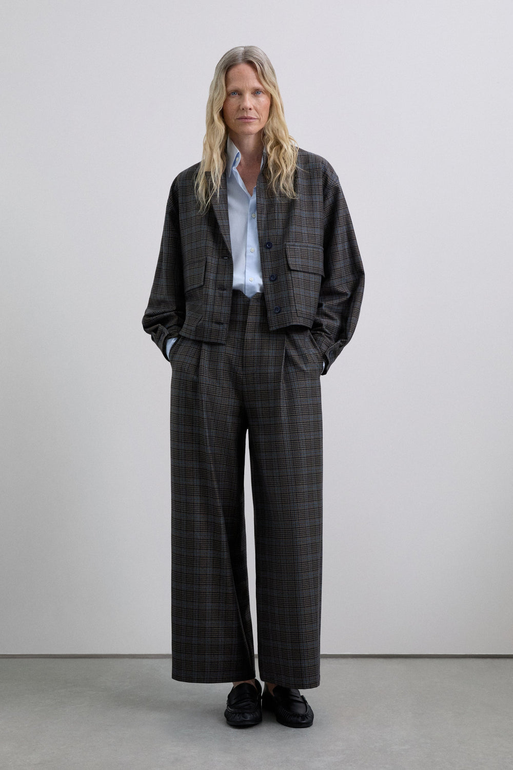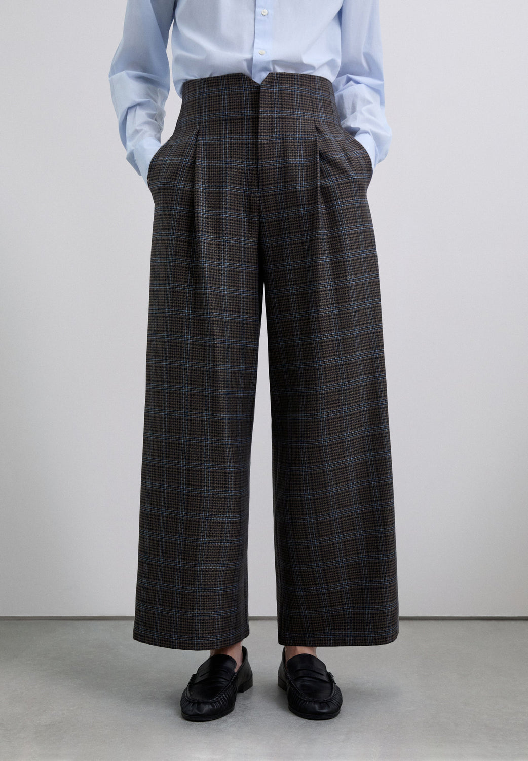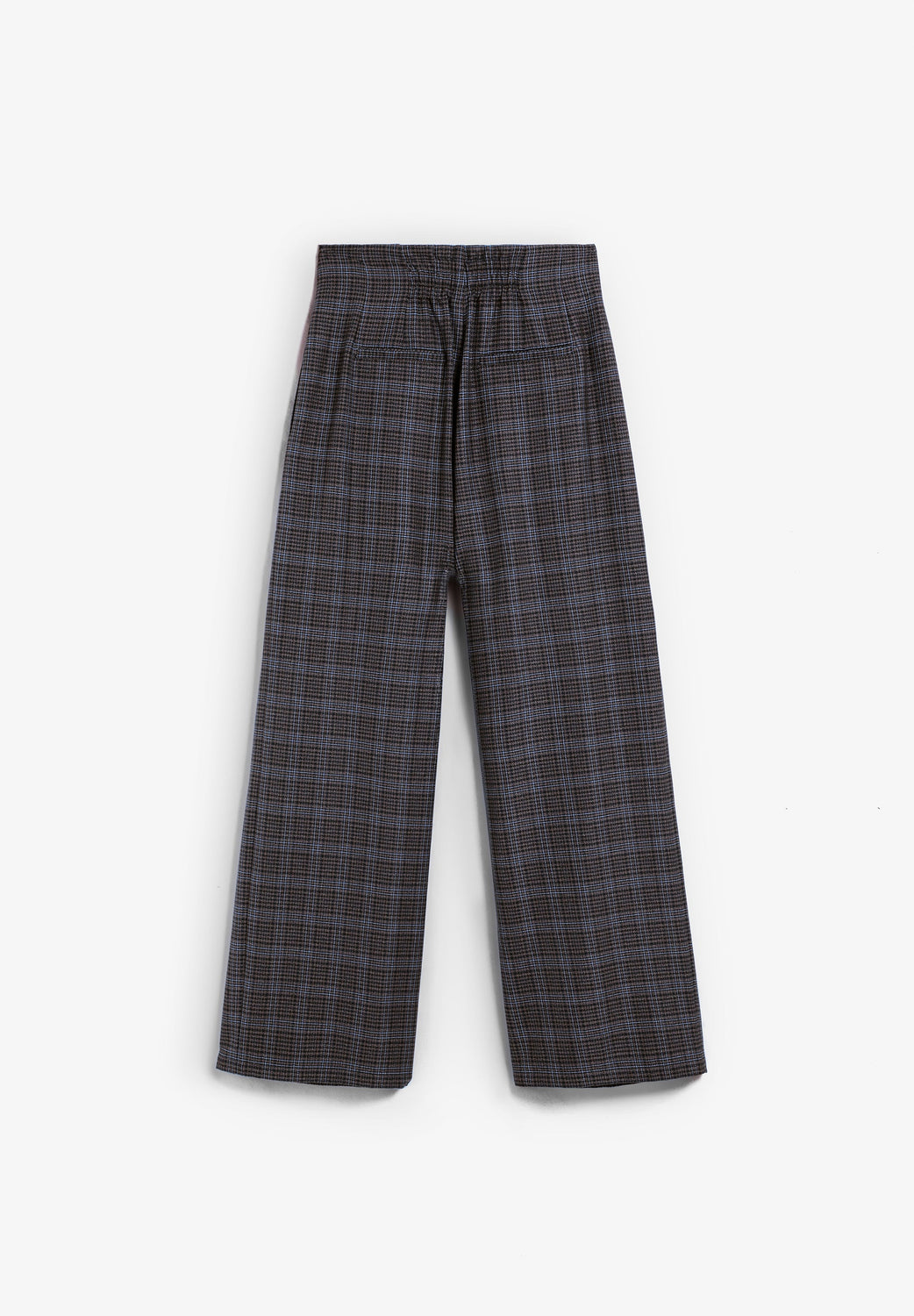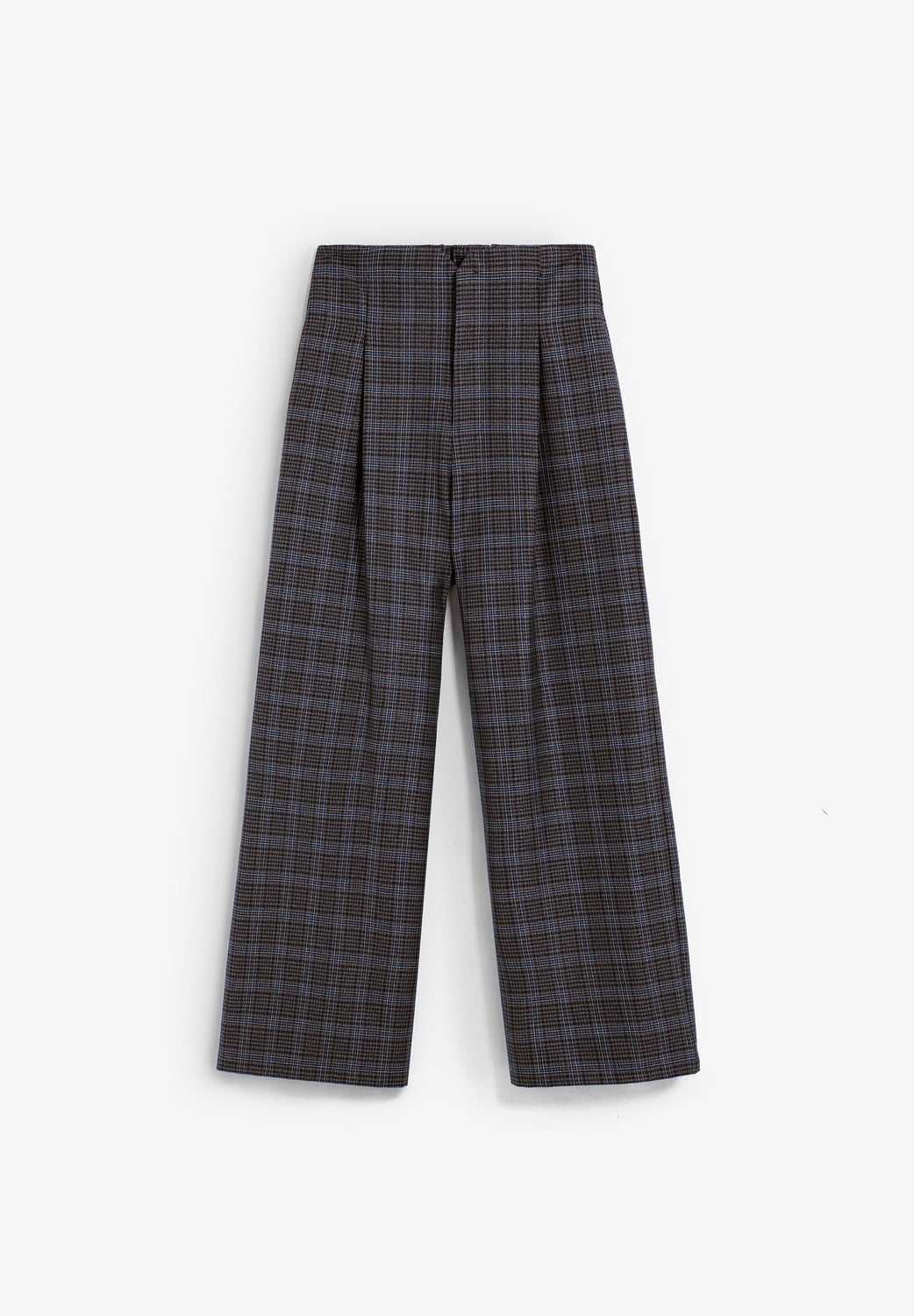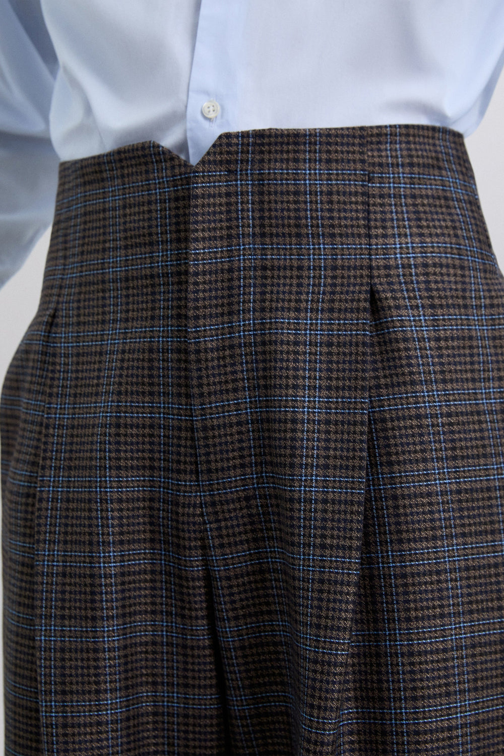 Calças de corte culotte. Pormenor de prega à frente. Fecho oculto com zip e botão. Padrão em xadrez.