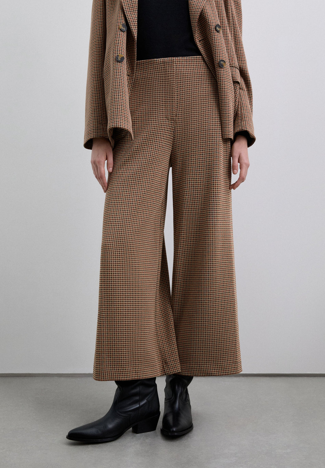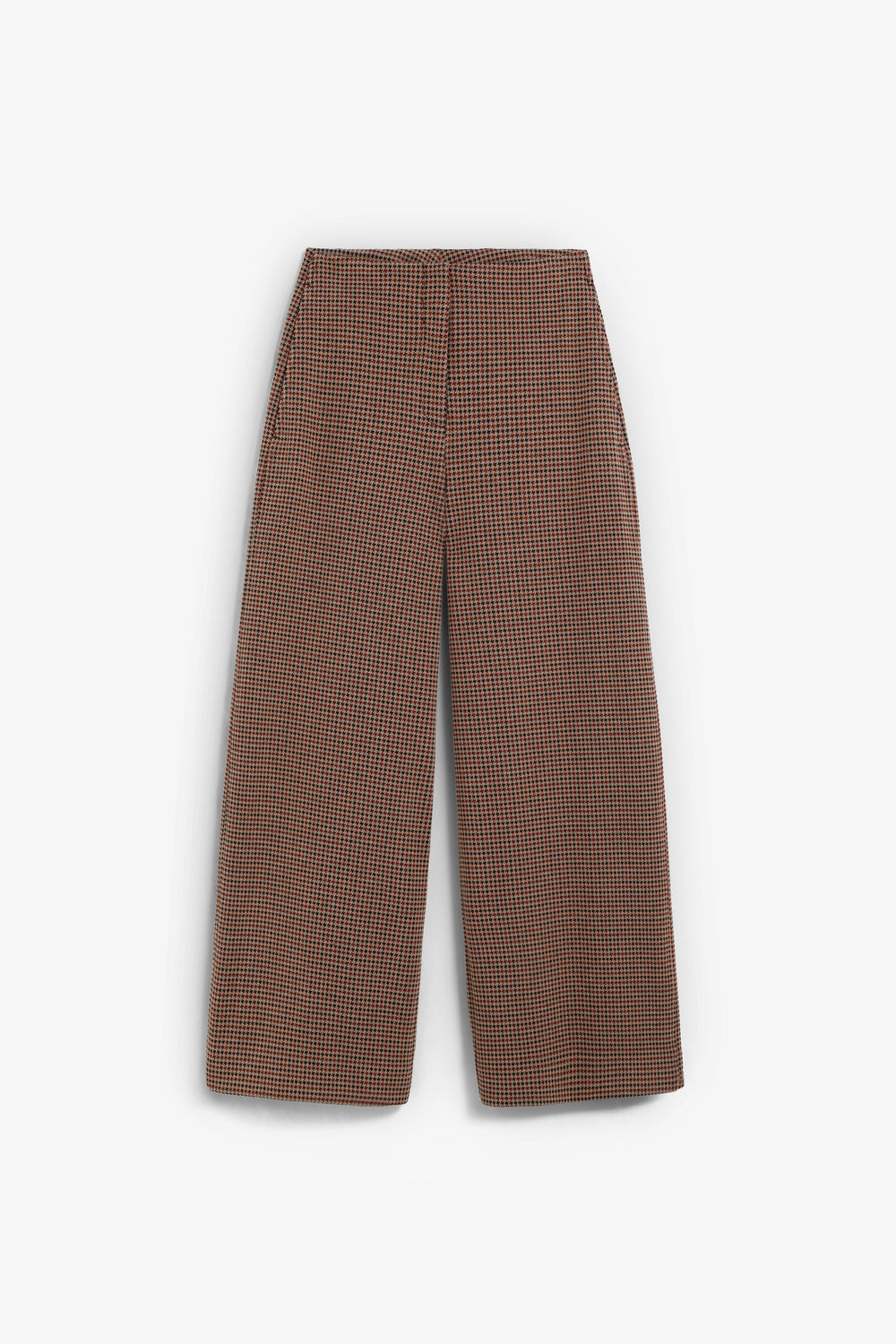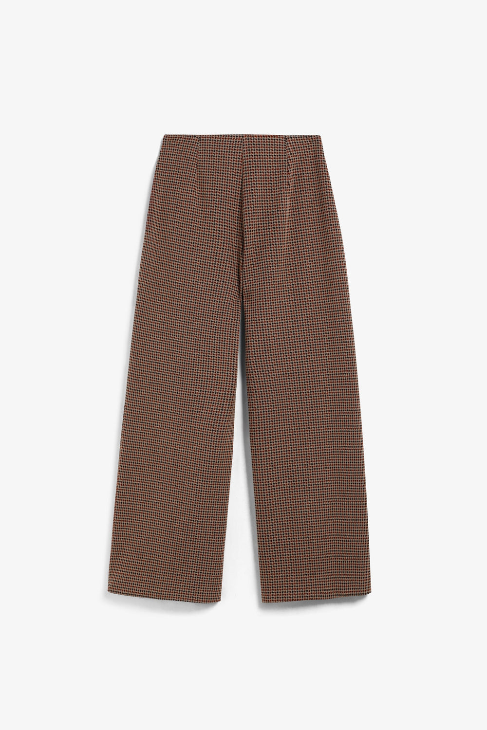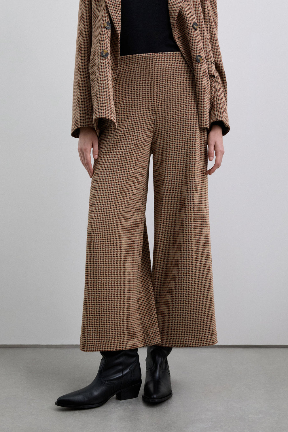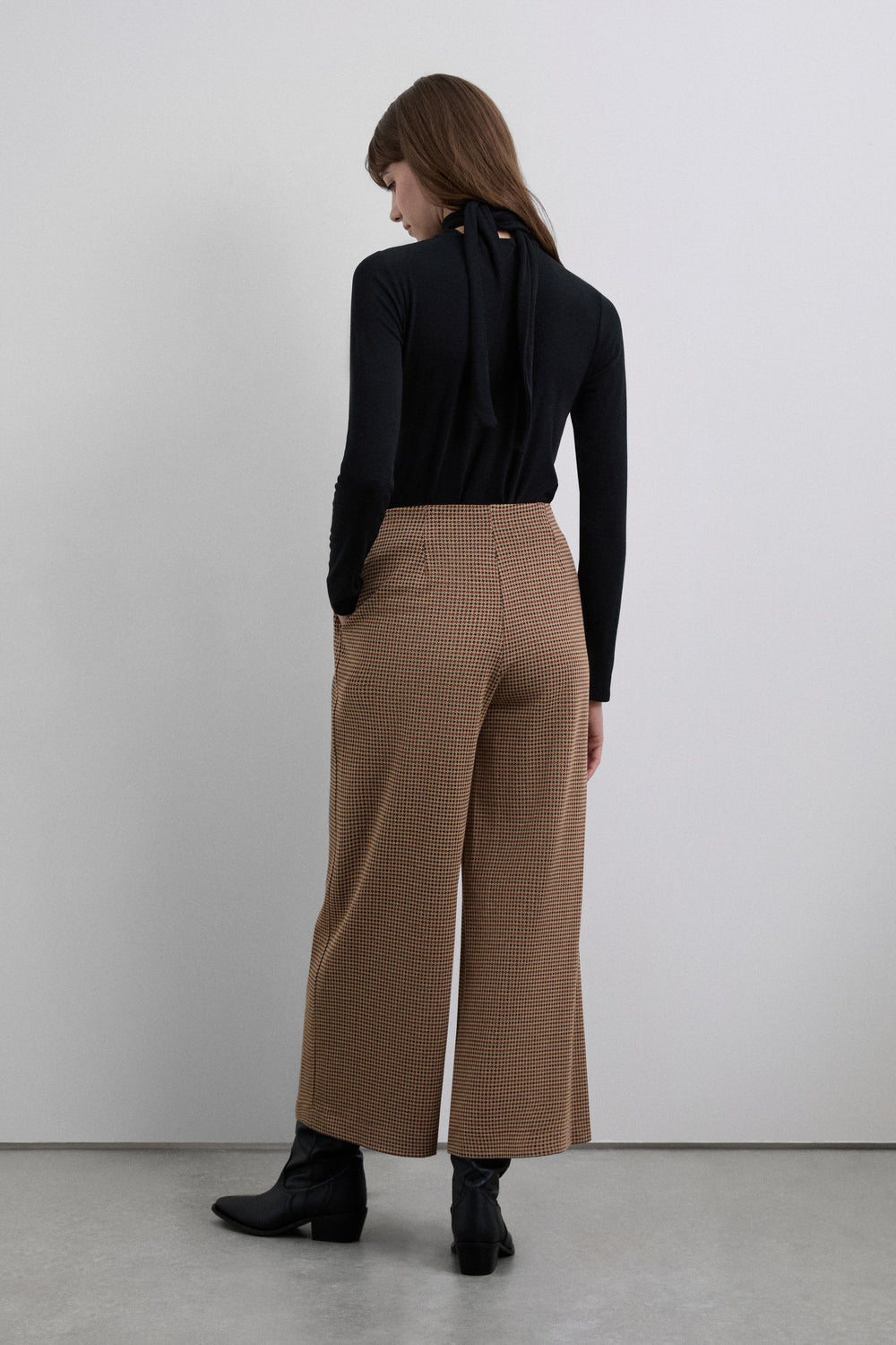 Calças com padrão pata de galo. Regular fit. Franzidos na cintura. Fecho de correr. Bolsos laterais.