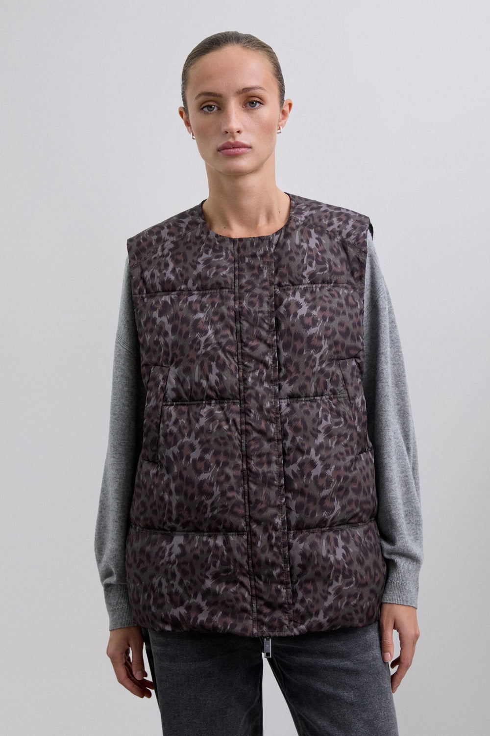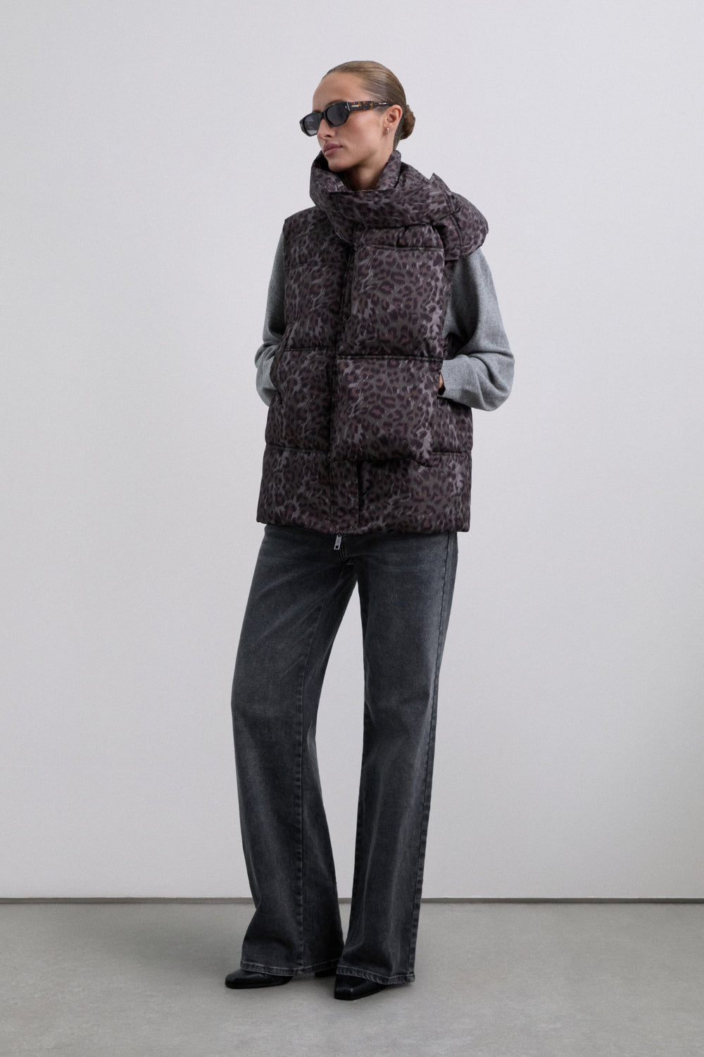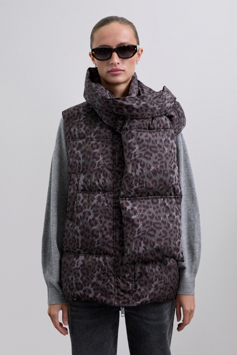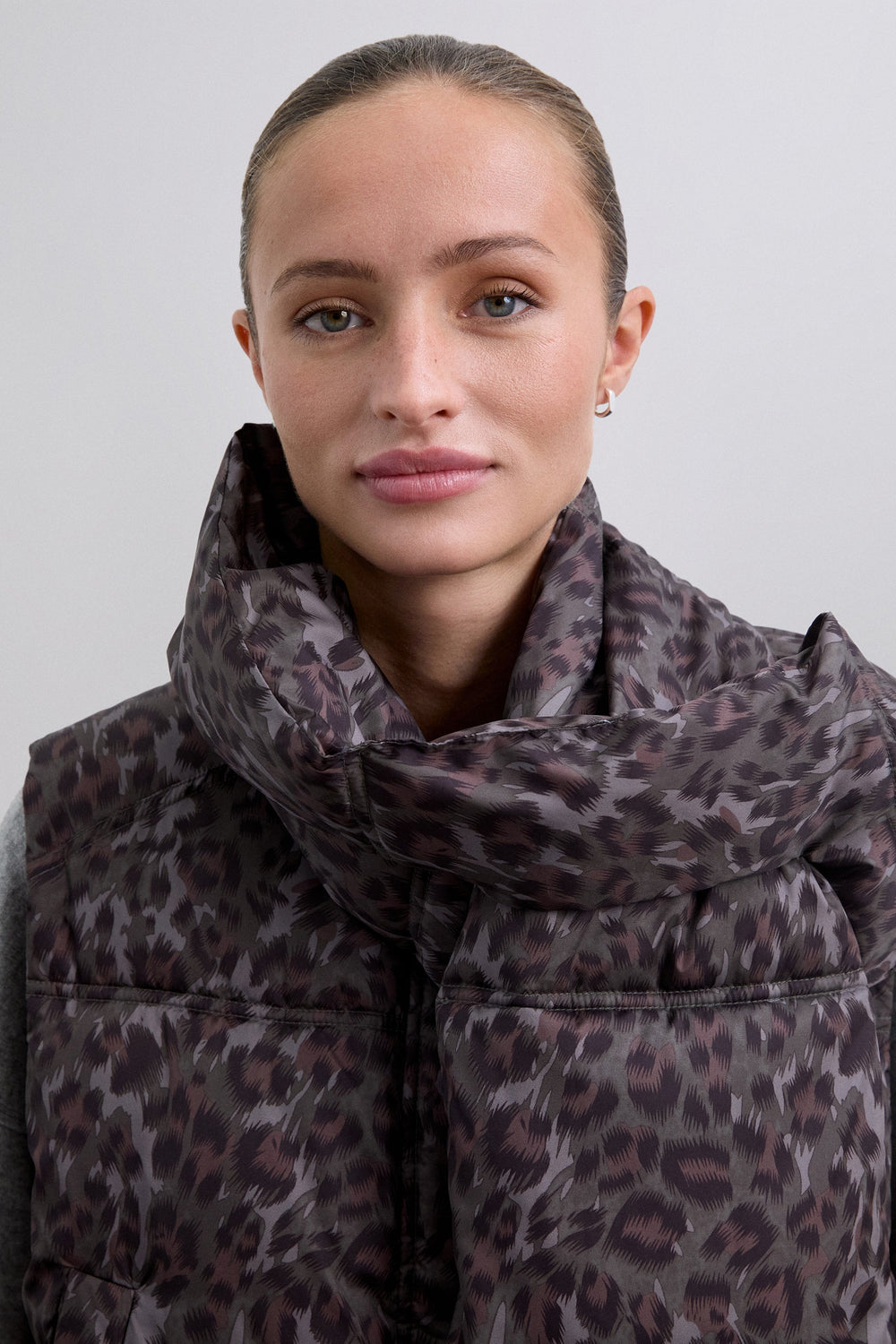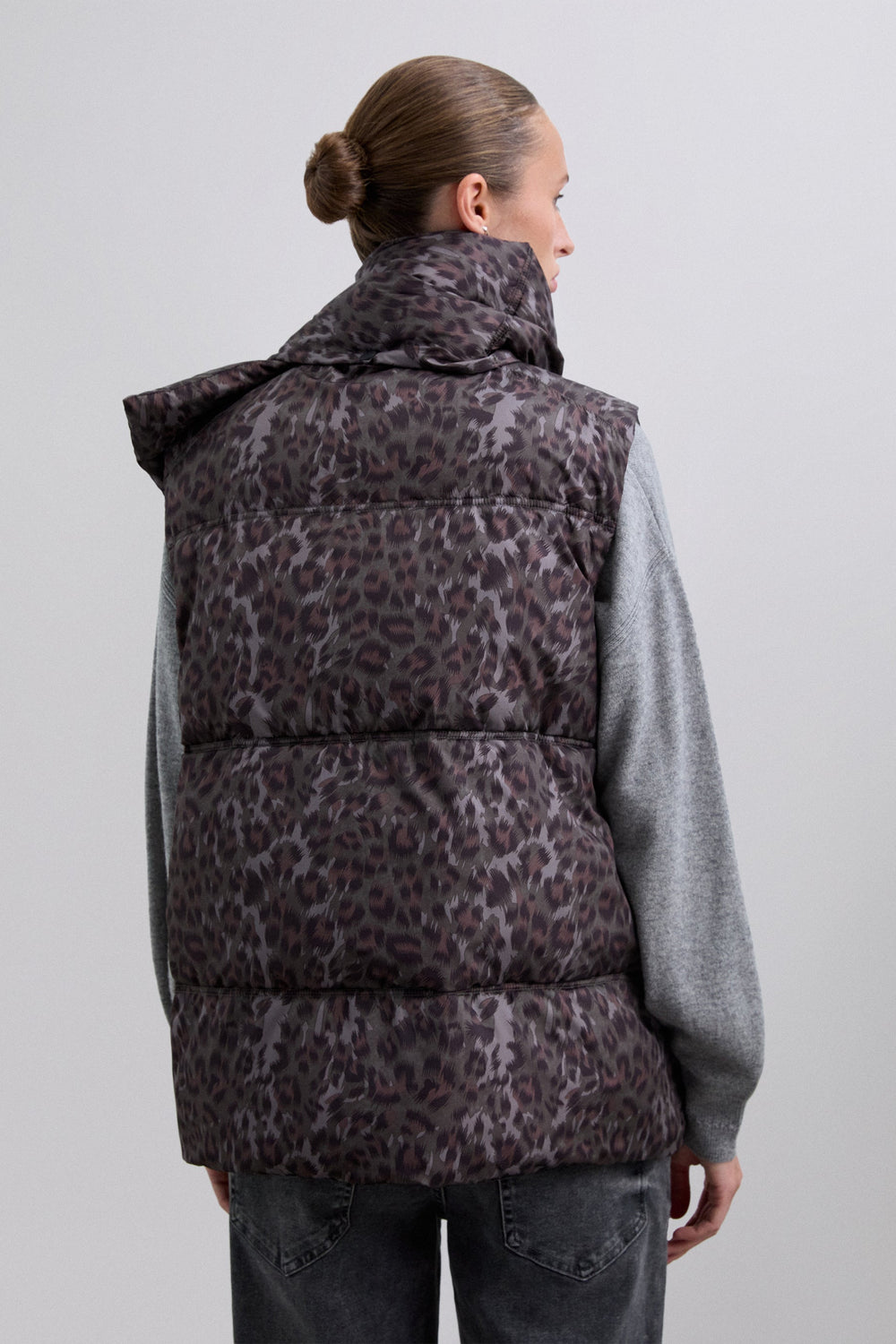 Colete acolchoado com estampado animal. Fecho de correr oculto e botões de pressão. Corte folgado. Écharpe acolchoada extraível na gola. Bainha com cordão ajustável. Dois bolsos à frente.