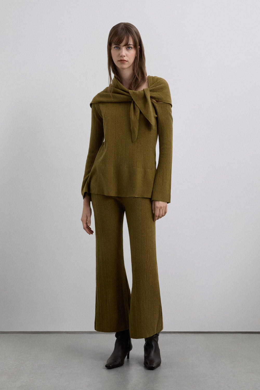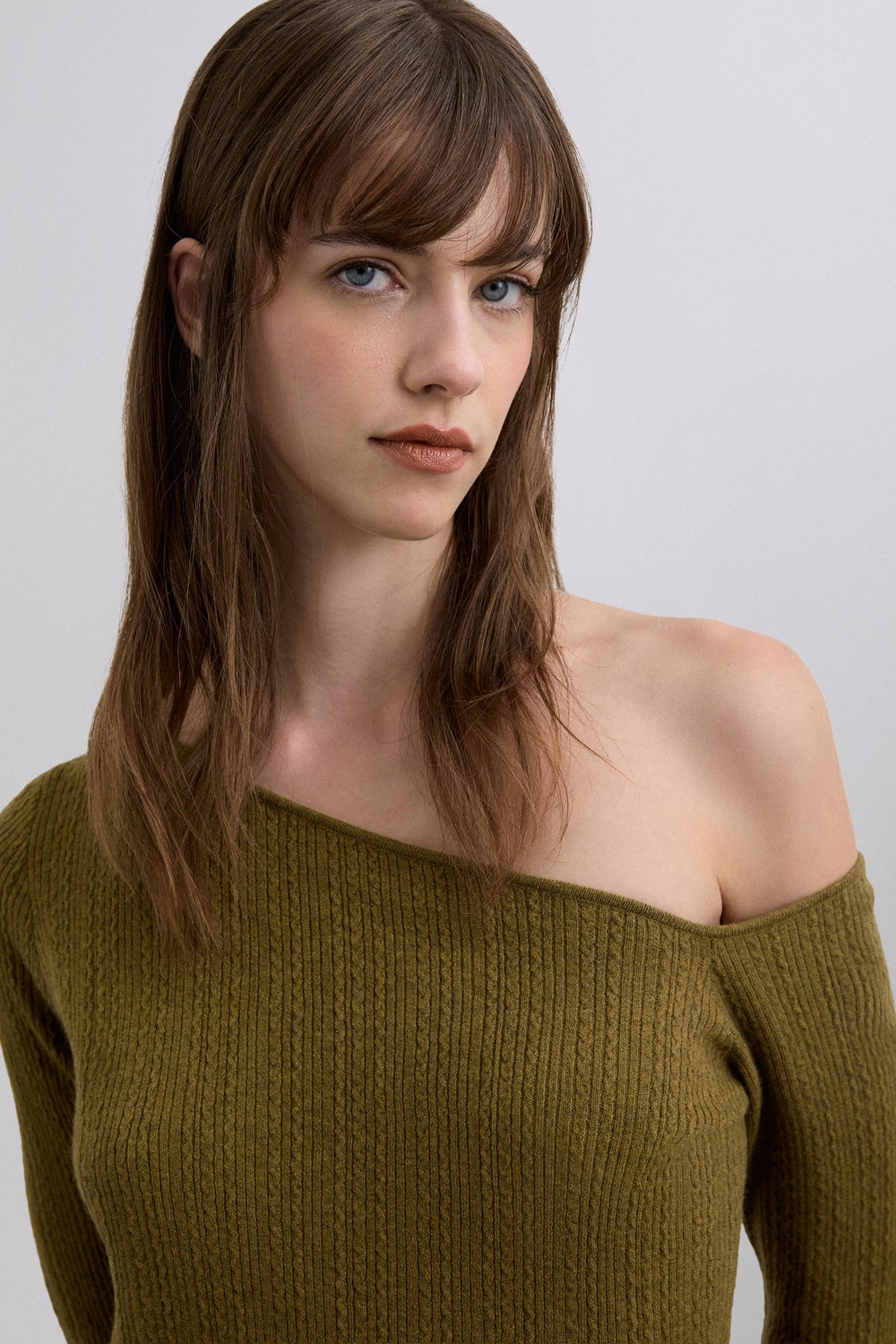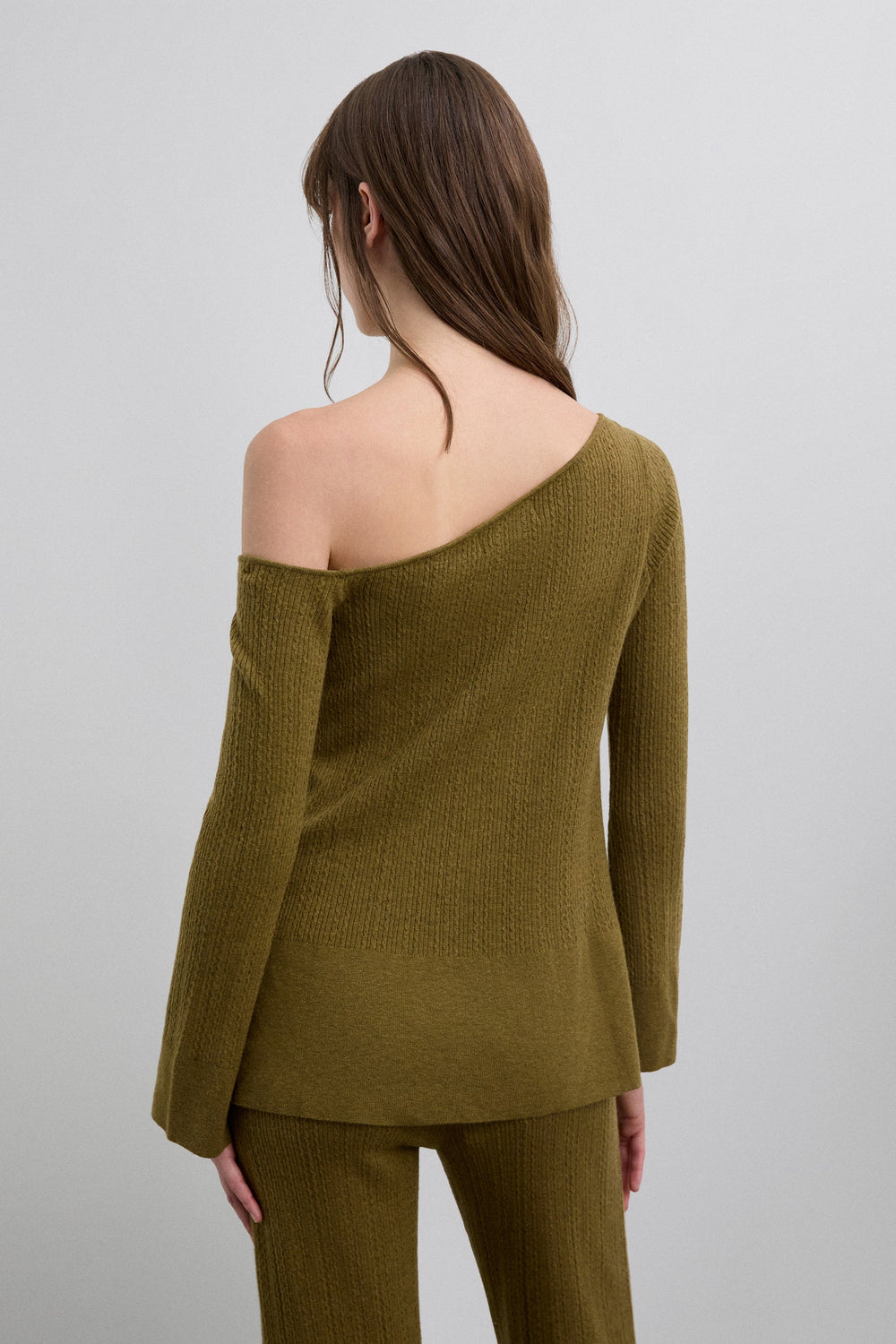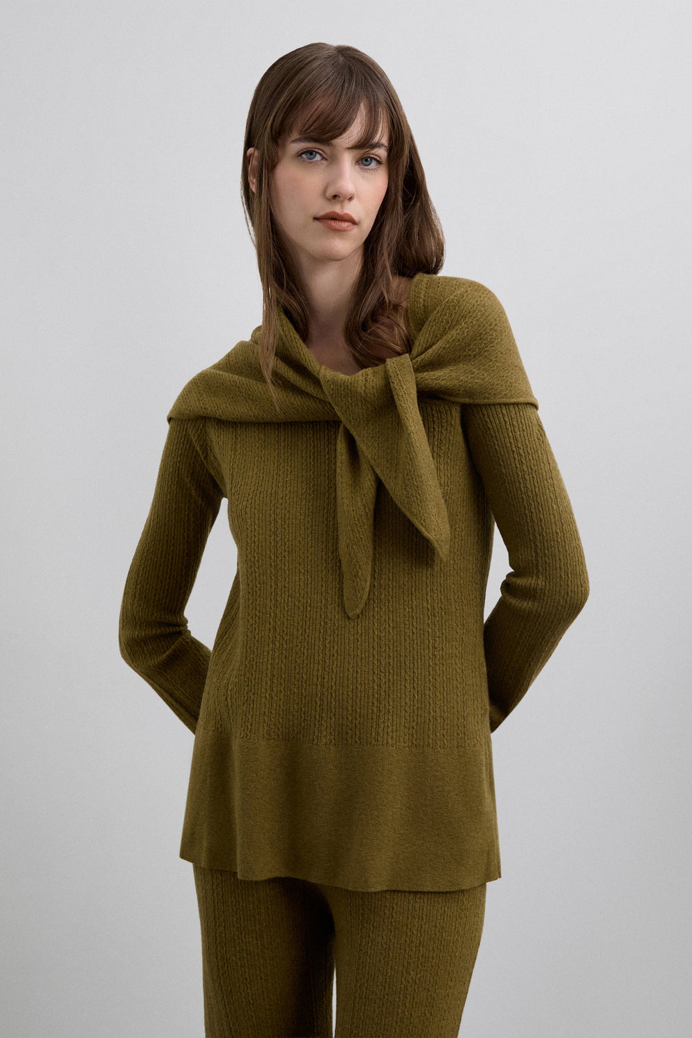 Sweater confecionada em mistura com algodão e lã. Textura de malha de cabo fina. Corte ligeiramente oversize e alongado. Decote assimétrico. Manga comprida ligeiramente à boca de sino. Capa desmontável a condizer.