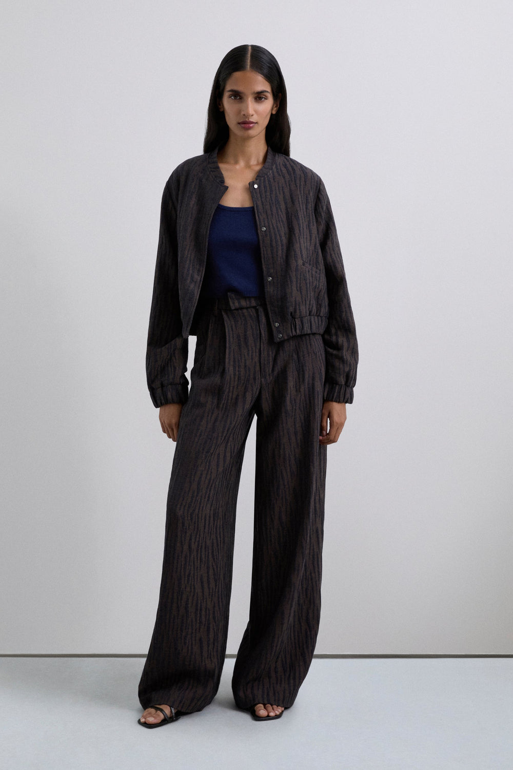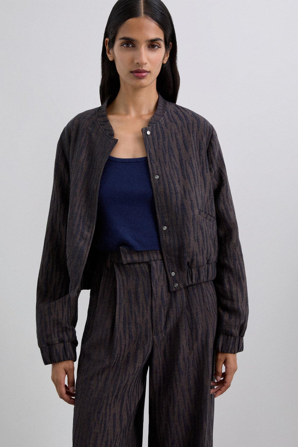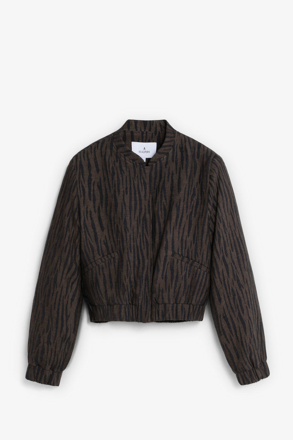 Casaco bomber com estampado animal. Mangas compridas. Punhos e cintura elásticos. Fecho frontal com botões. Bolsos frontais.