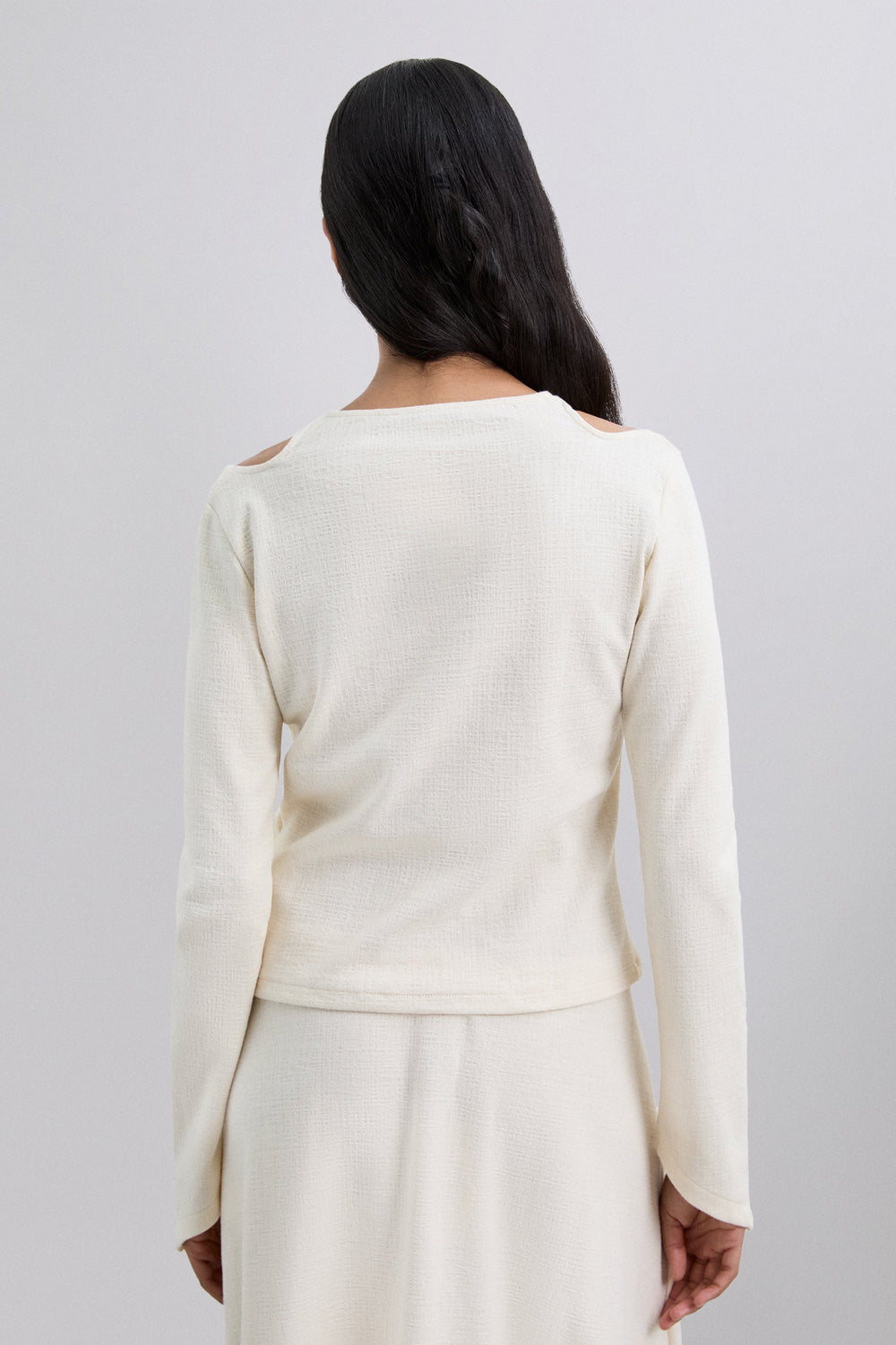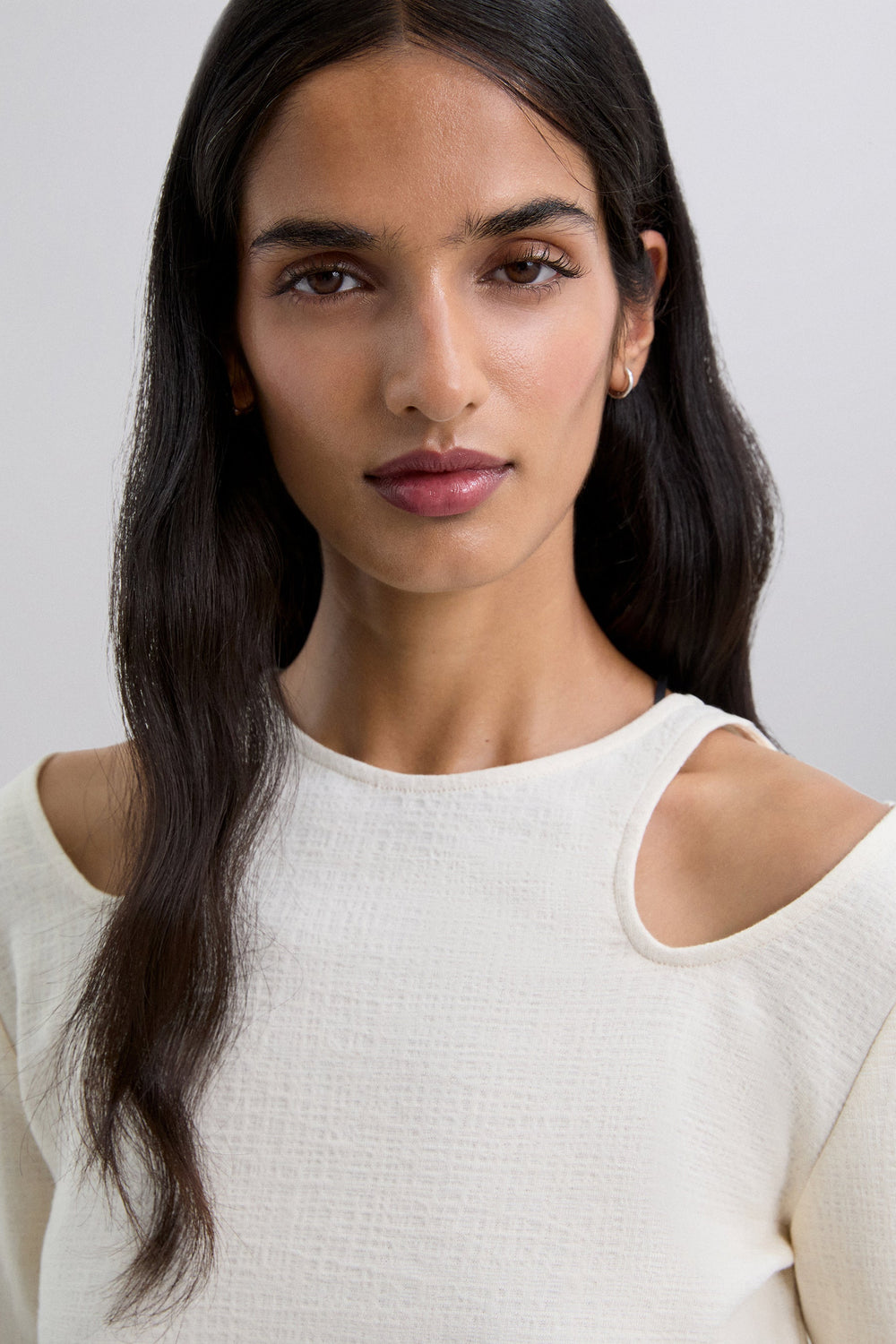 T-shirt confecionada em algodão. Manga comprida com acabamento assimétrico. Decote redondo. Aberturas nos ombros.