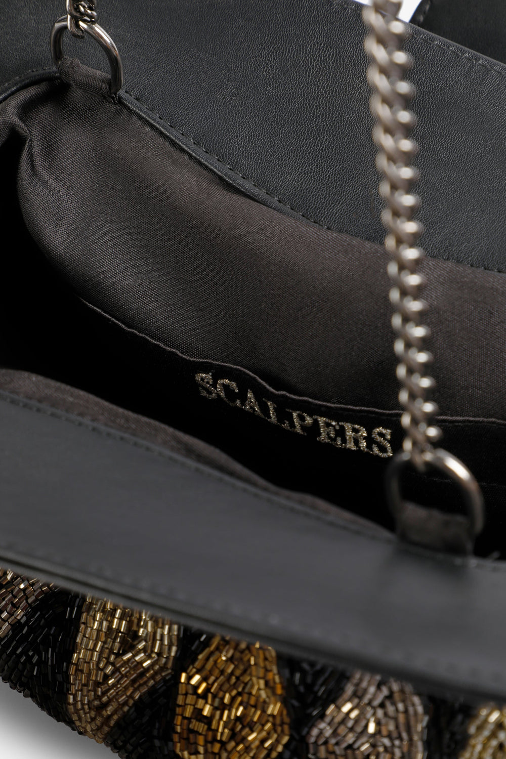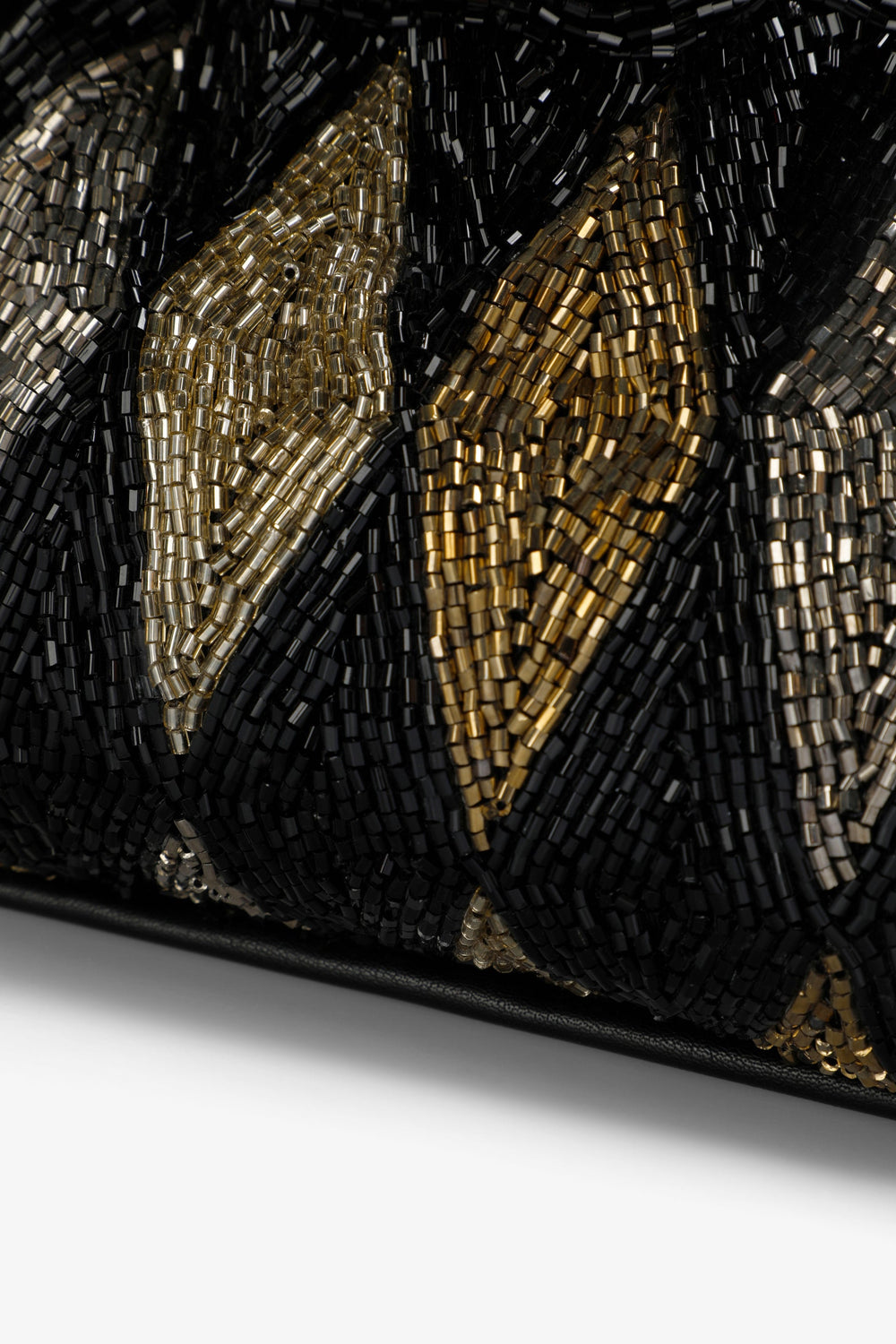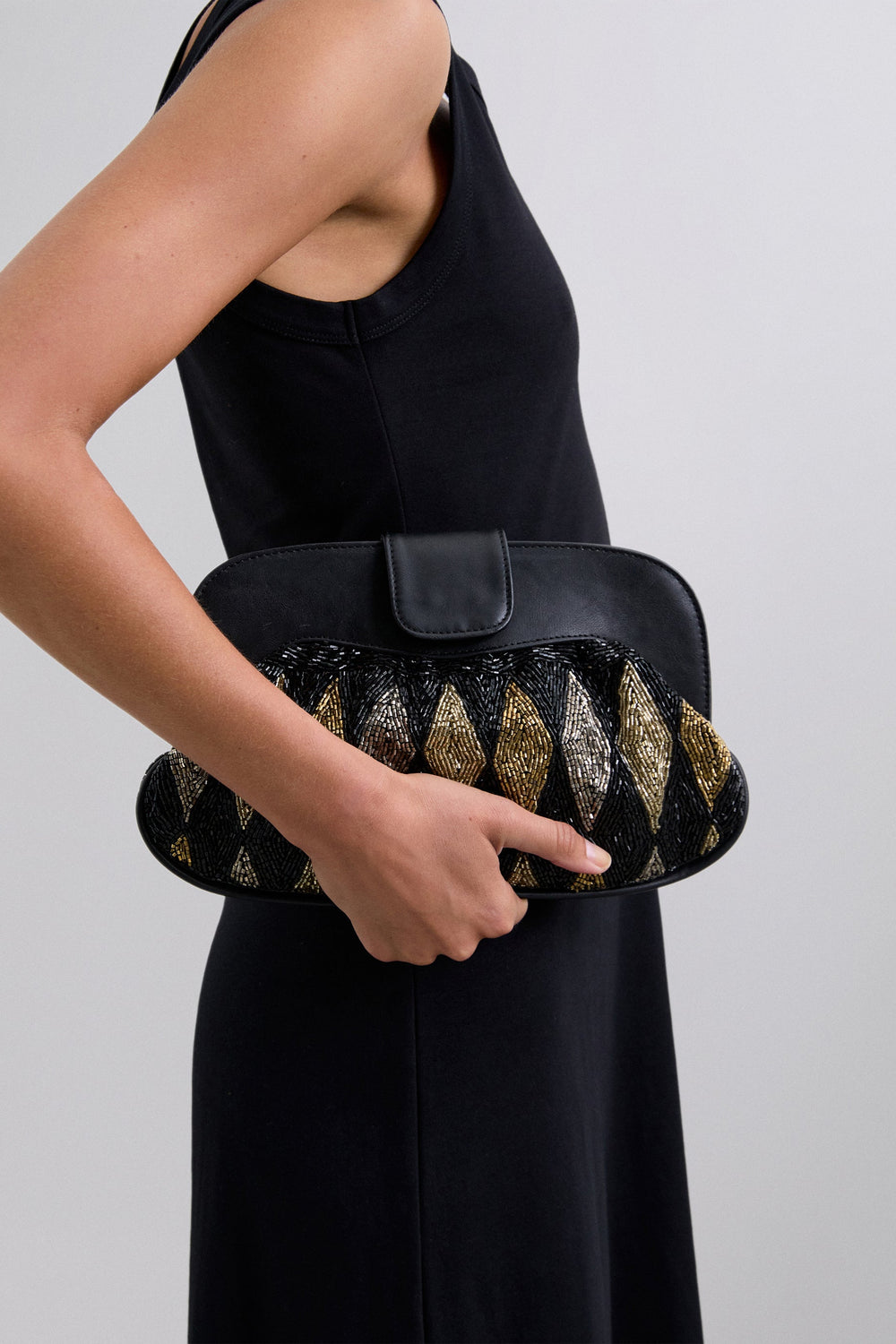 Bolsa de mão. Pormenor de contas. Correia metálica amovível em posição de alça de ombro. Fecho com íman. Pormenor de logótipo bordado no interior.