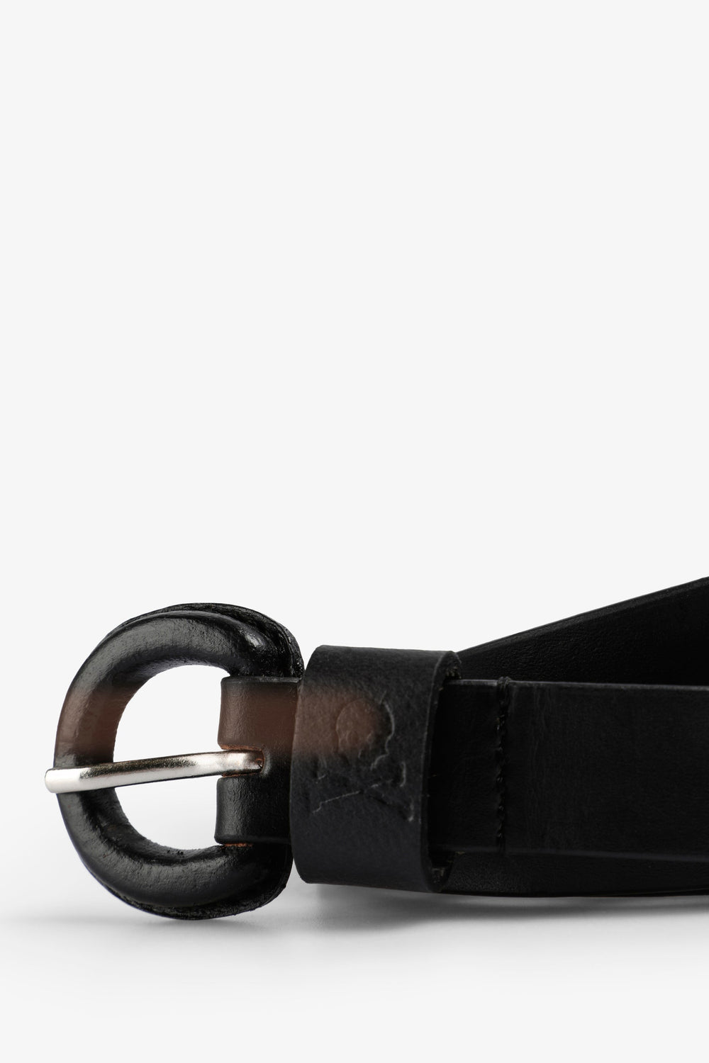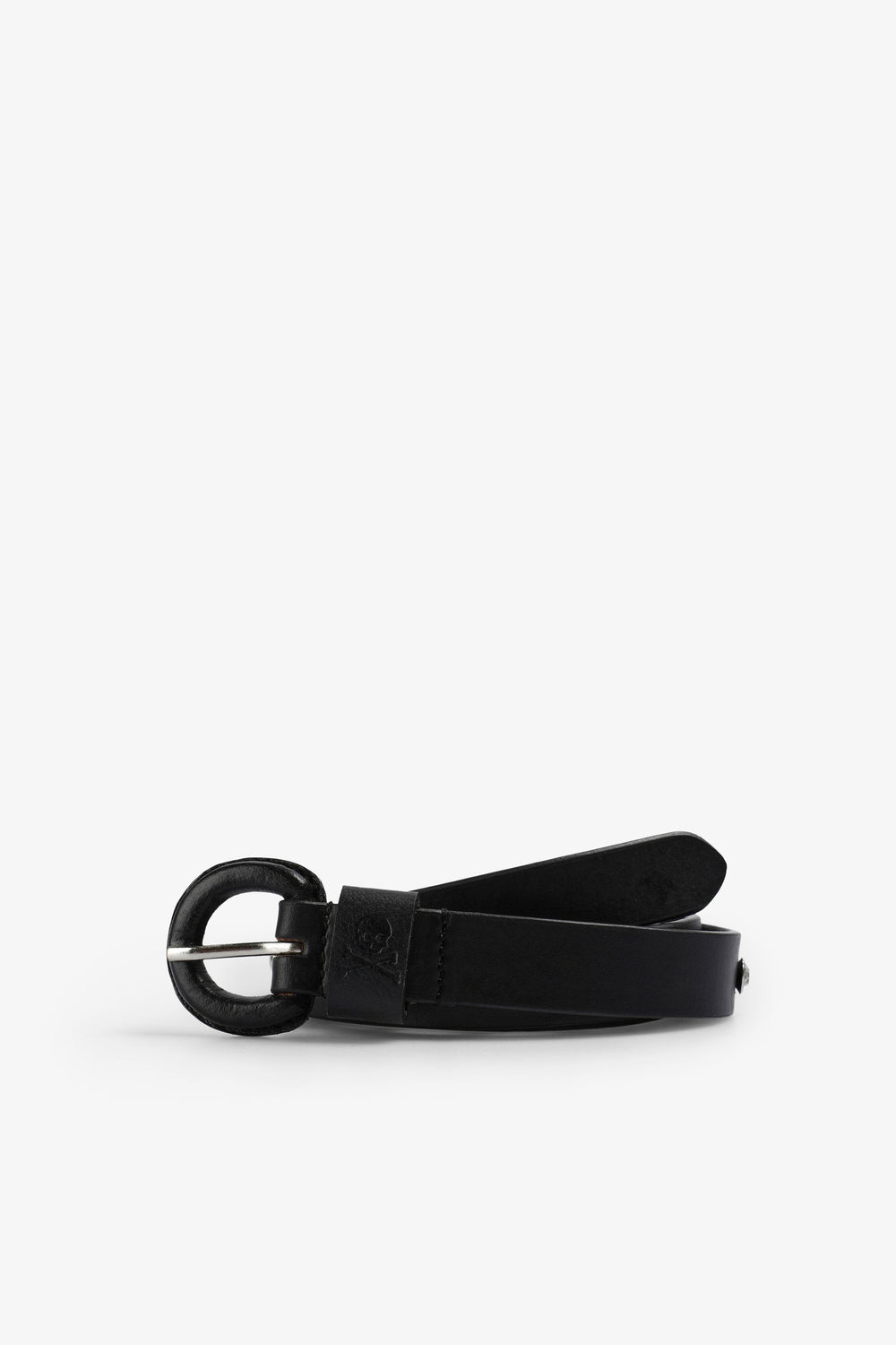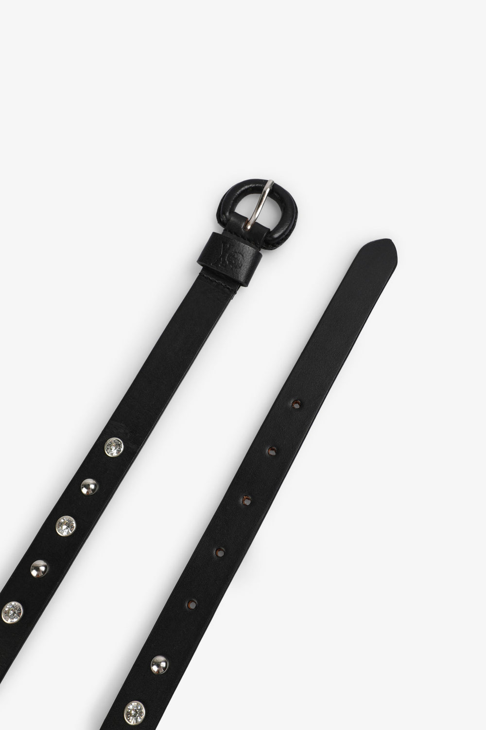 Cinto confecionado em 100% pele. Logótipo em padrão. Fivela prateada e pormenor de strass e tachas.