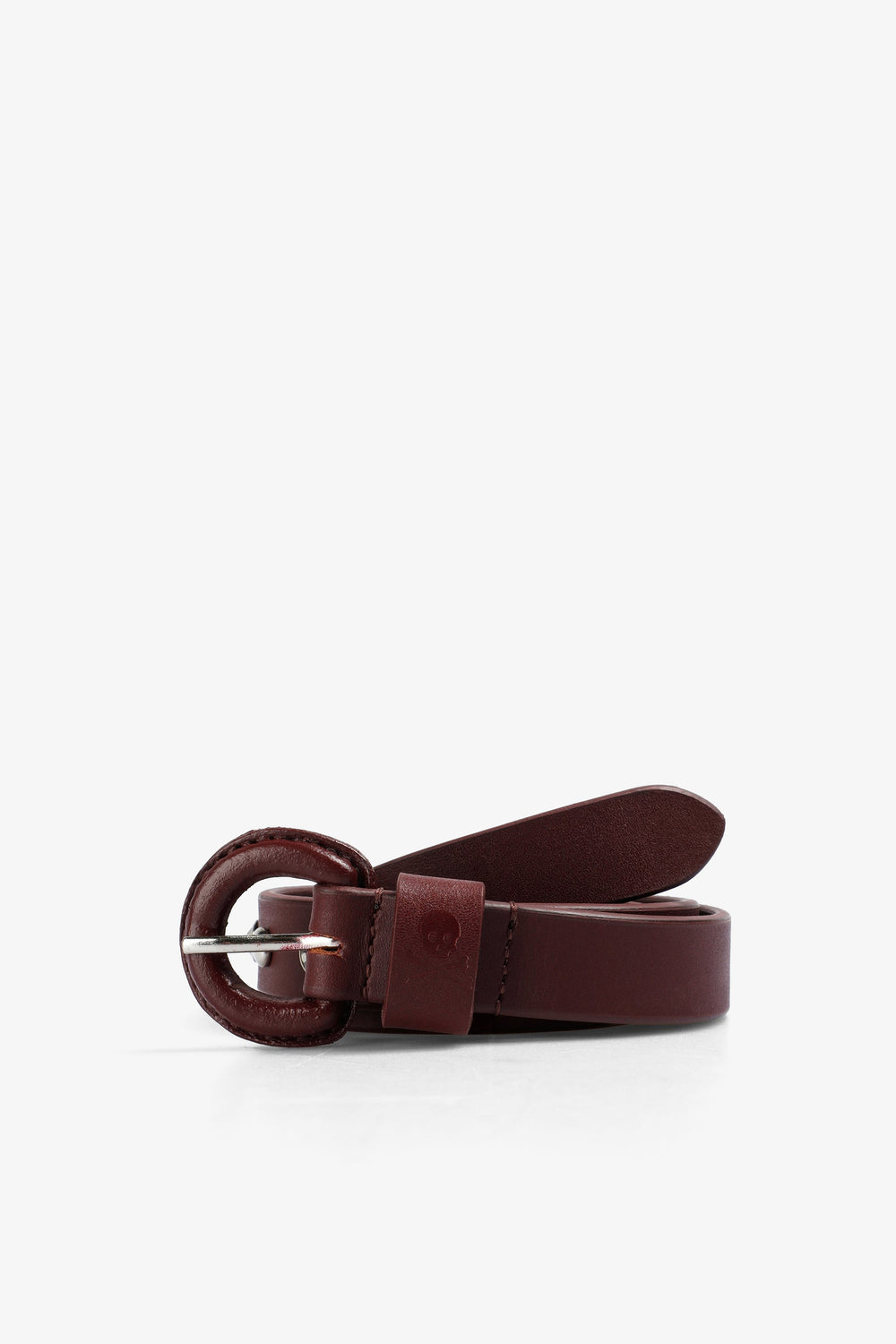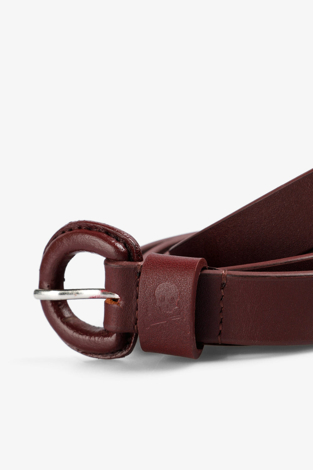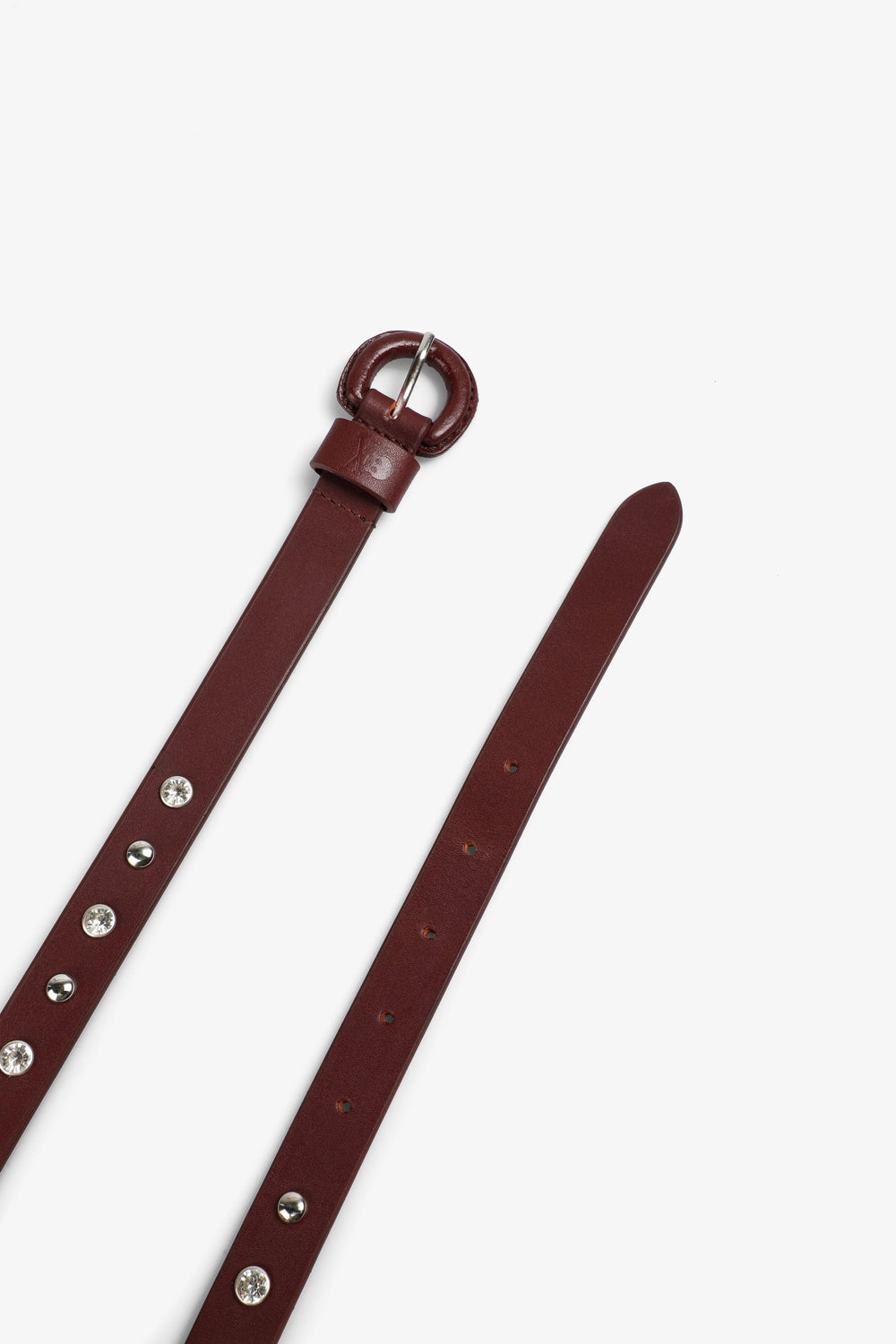 Cinto confecionado em 100% pele. Logótipo em padrão. Fivela prateada e pormenor de strass e tachas.