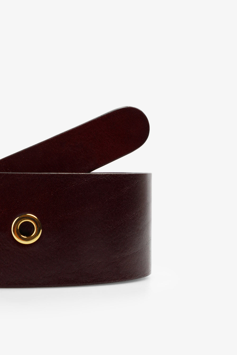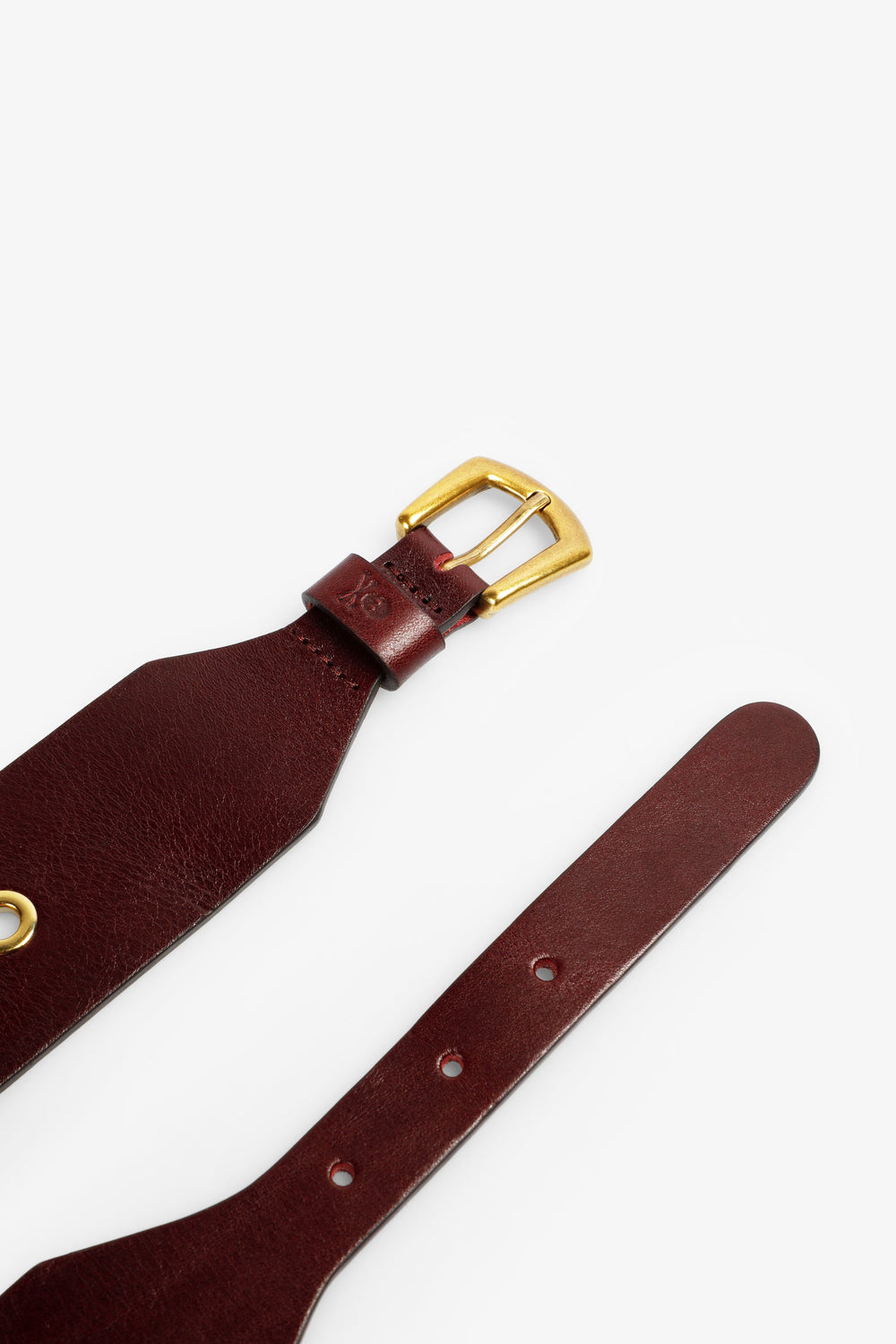 Cinto confecionado em 100% pele. Design de faixa. Ajustável e pormenor de tachas.