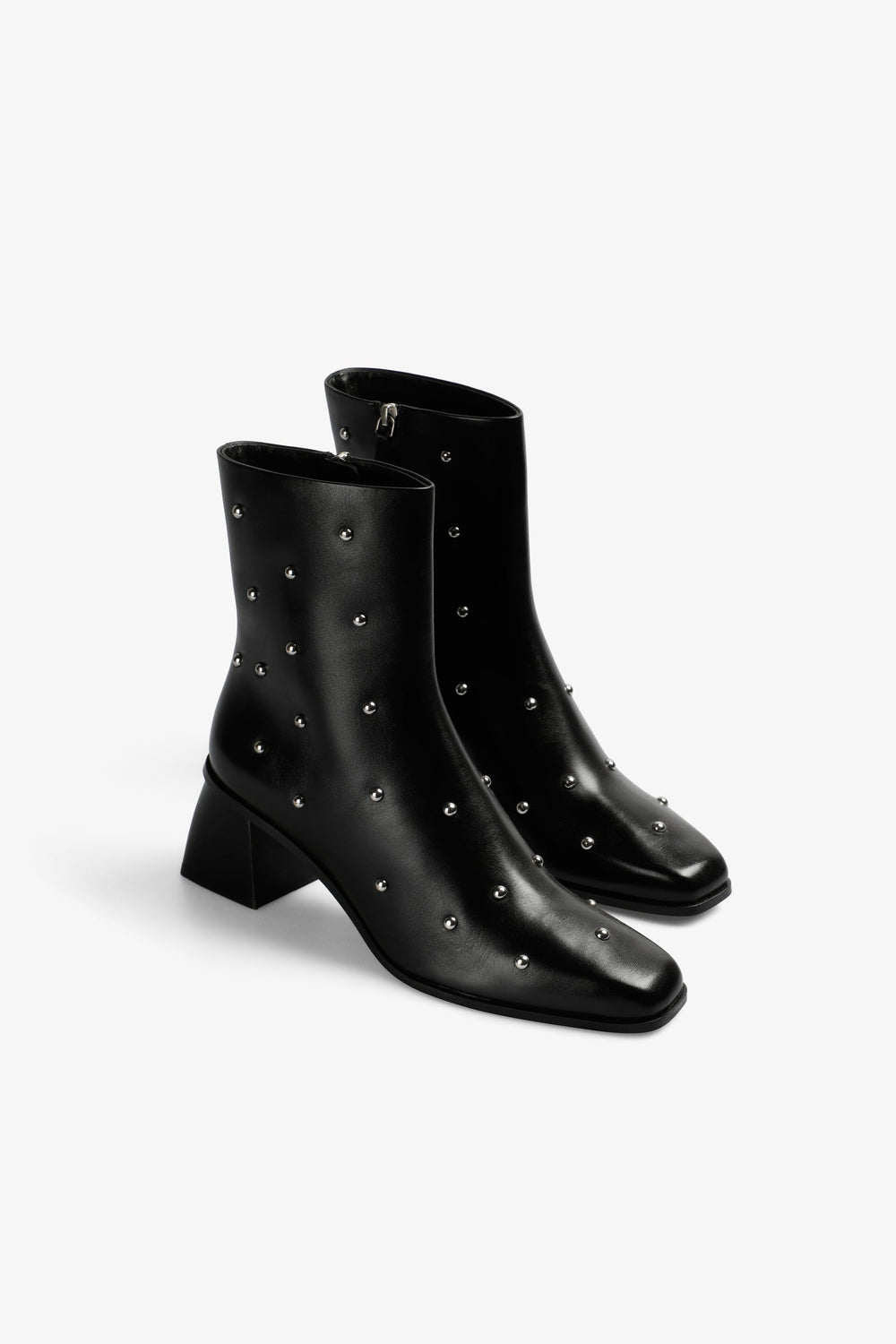 Botim de tacão com pormenor de tachas. Confecionado em 100% pele. Cano baixo. Fecho com zip lateral