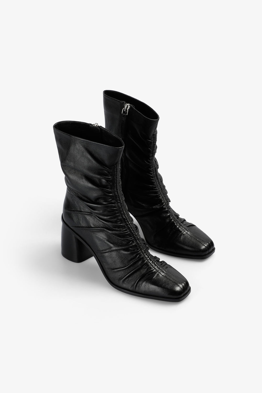 Botas confecionadas em 100% pele. Tacão médio. Pormenor de efeito drapeado no centro, à frente. Fecho de correr. Pormenor de logótipo bordado no fecho de correr. Altura do tacão: 5 cm.