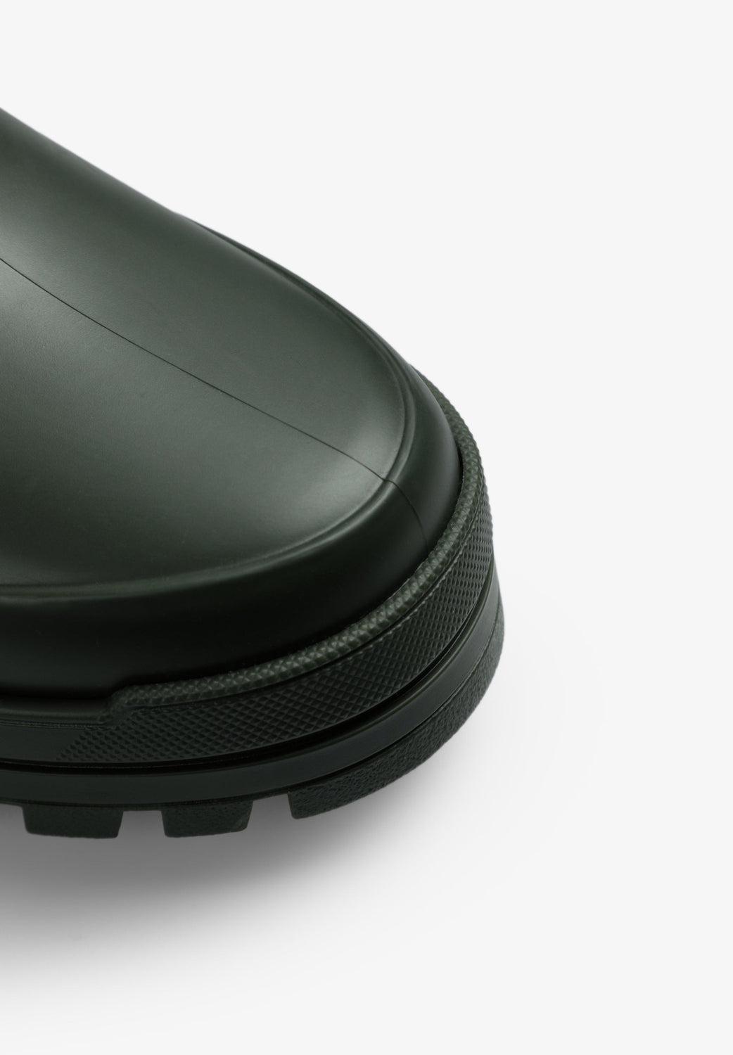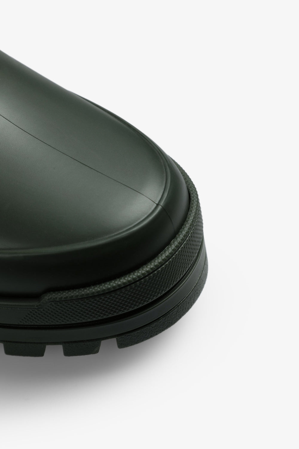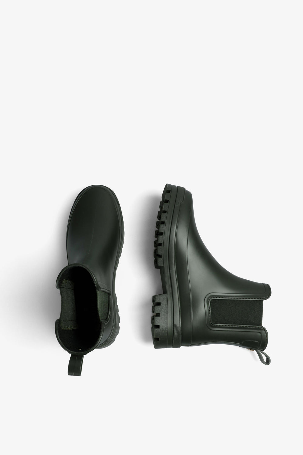 Botas de chuva em cor caqui, confecionadas num material impermeável e resistente. Interior forrado em tecido macio para maior conforto durante uma utilização prolongada.
