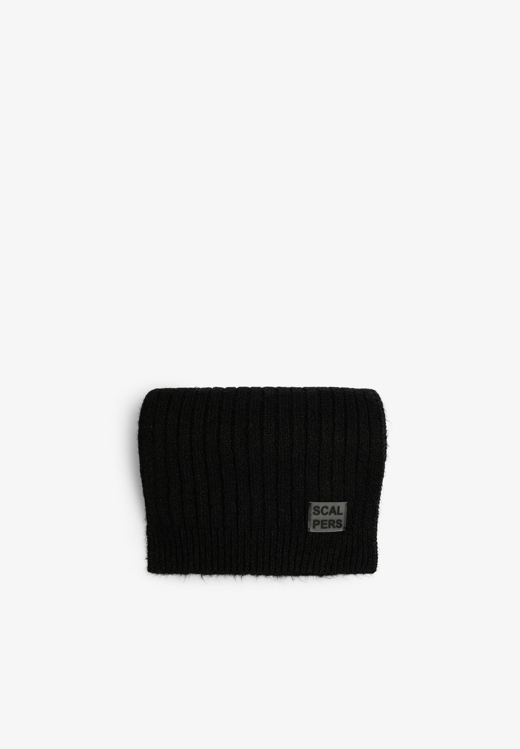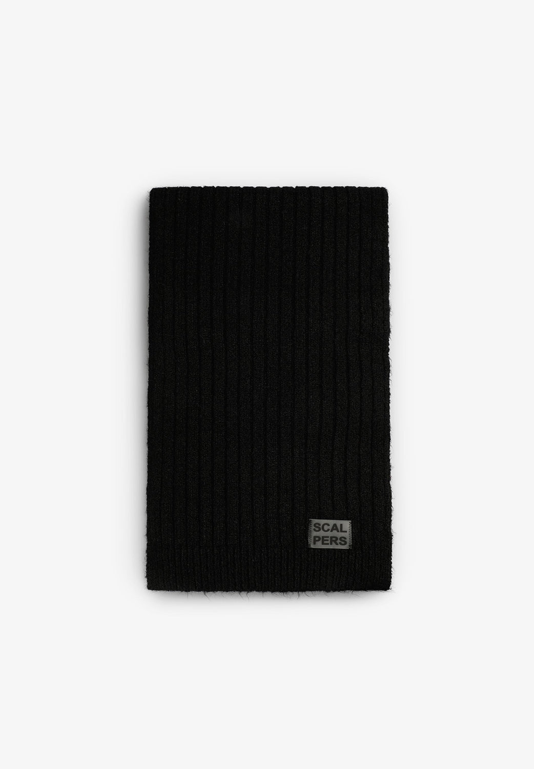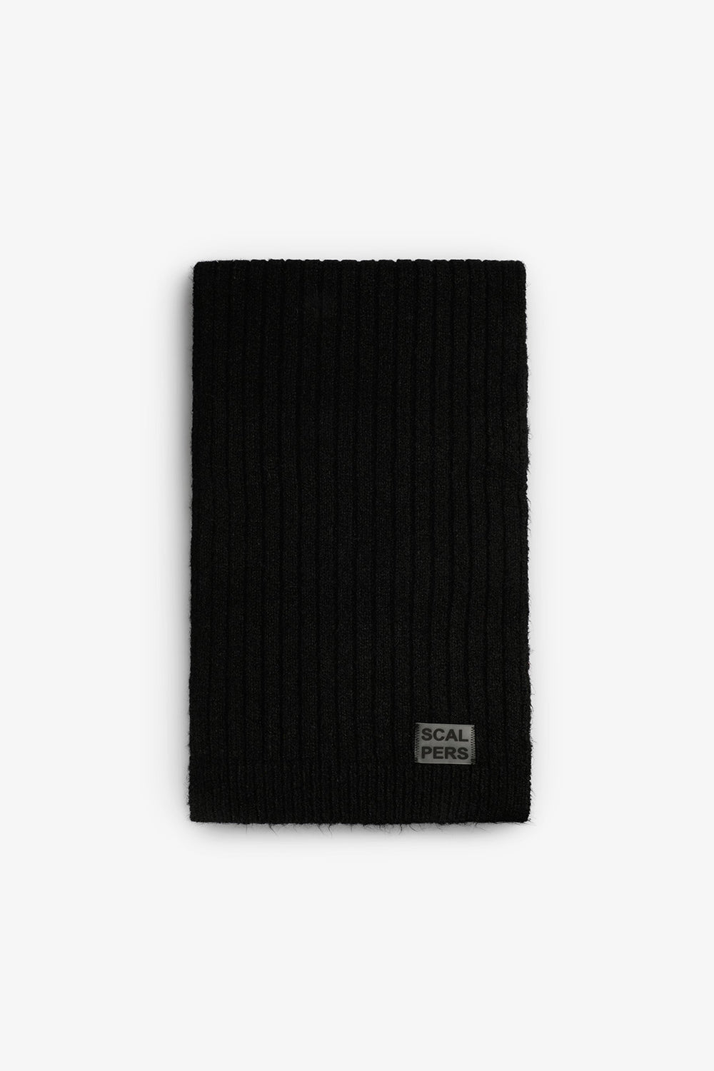 Cachecol confecionado em mistura com lã. Pormenores de canelado. Remendo com logótipo.