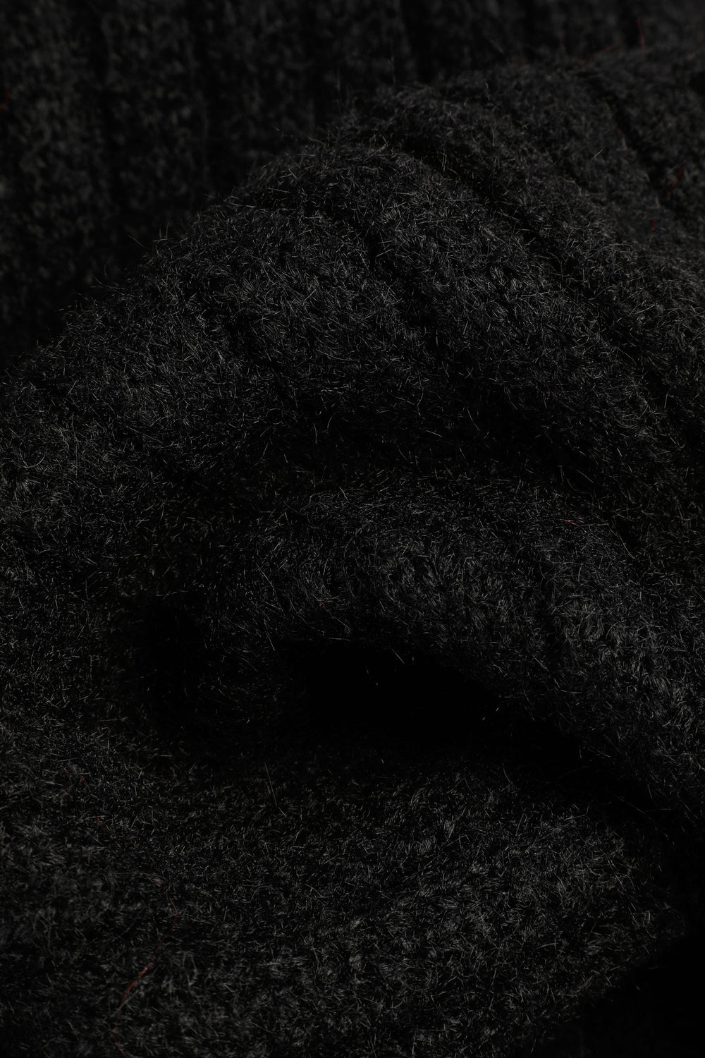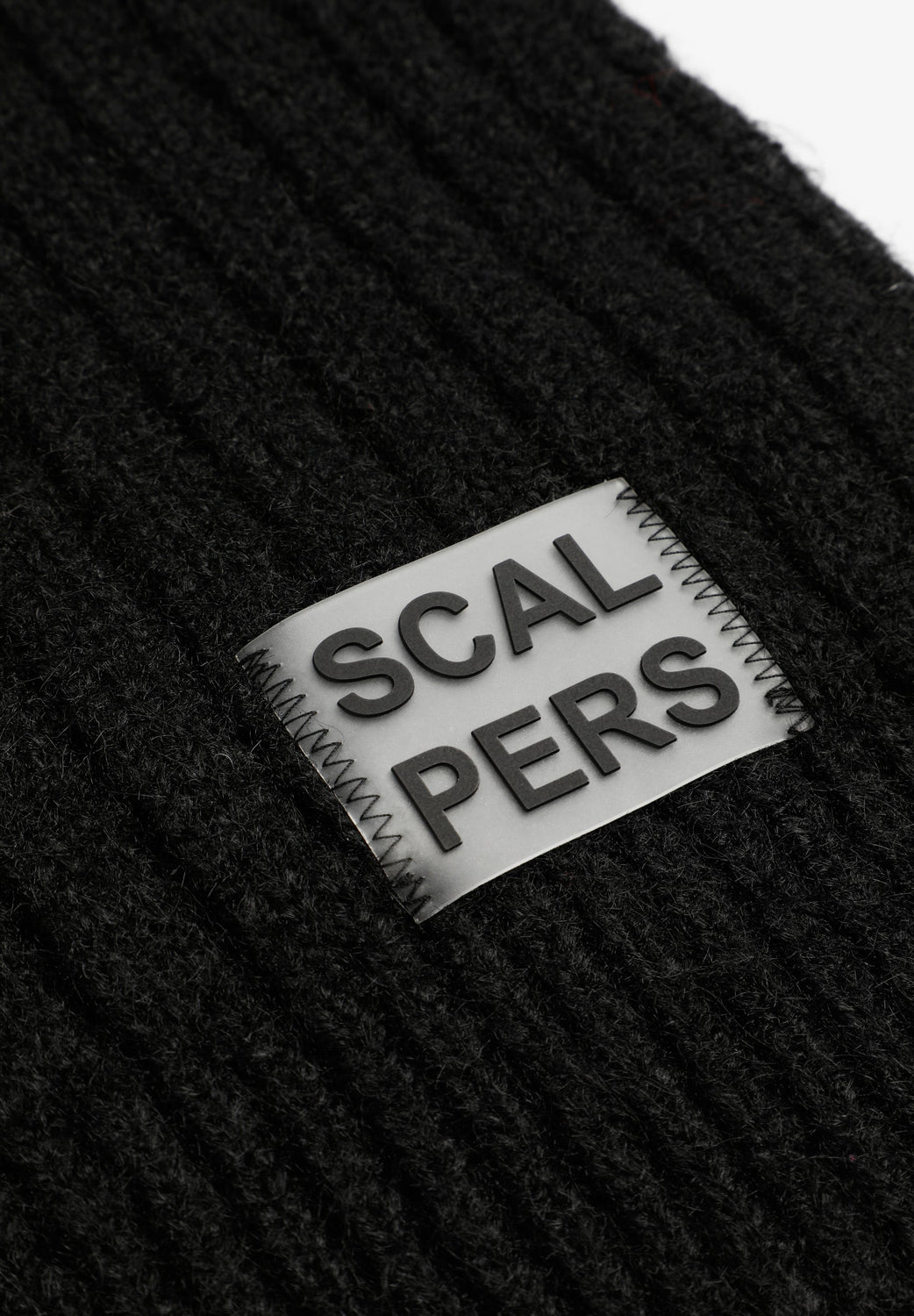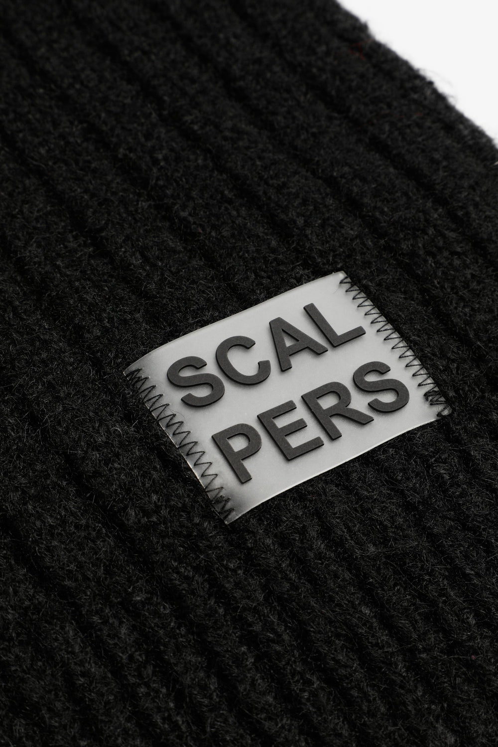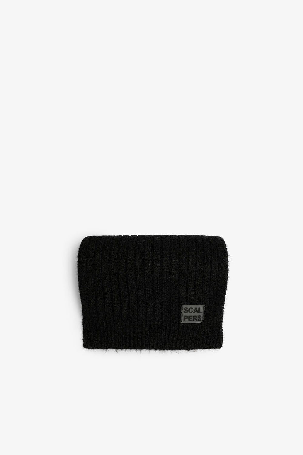 Cachecol confecionado em mistura com lã. Pormenores de canelado. Remendo com logótipo.